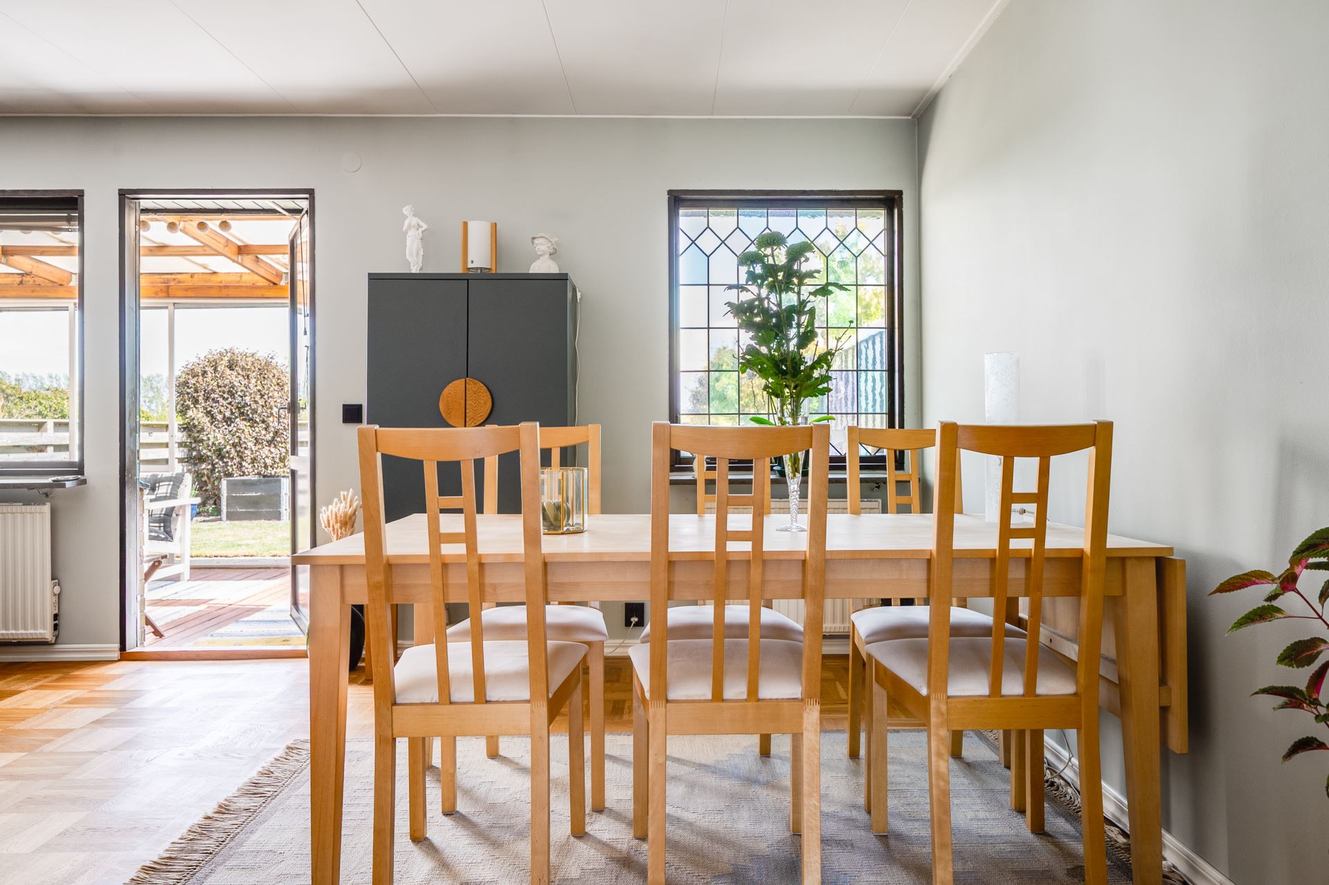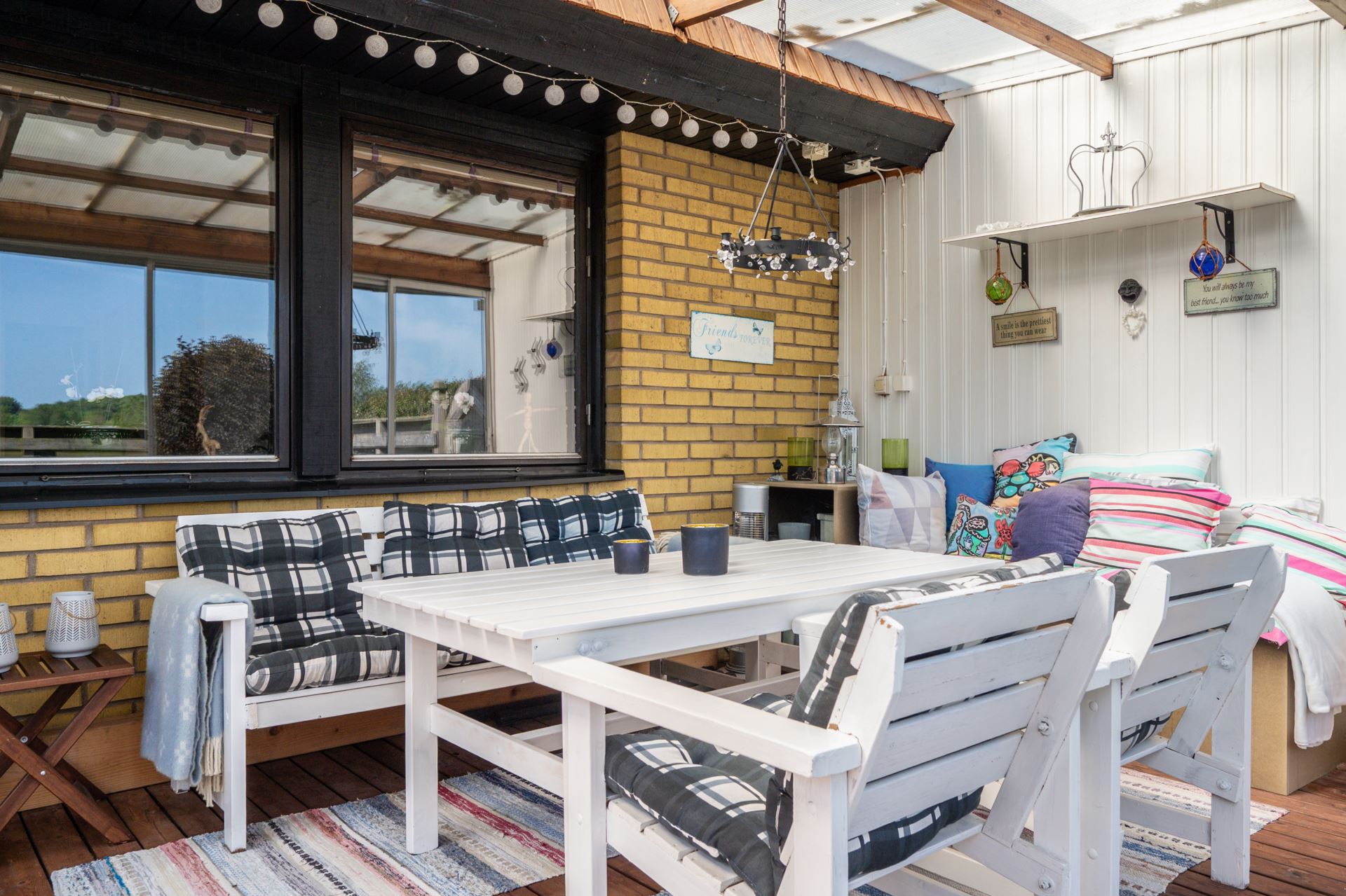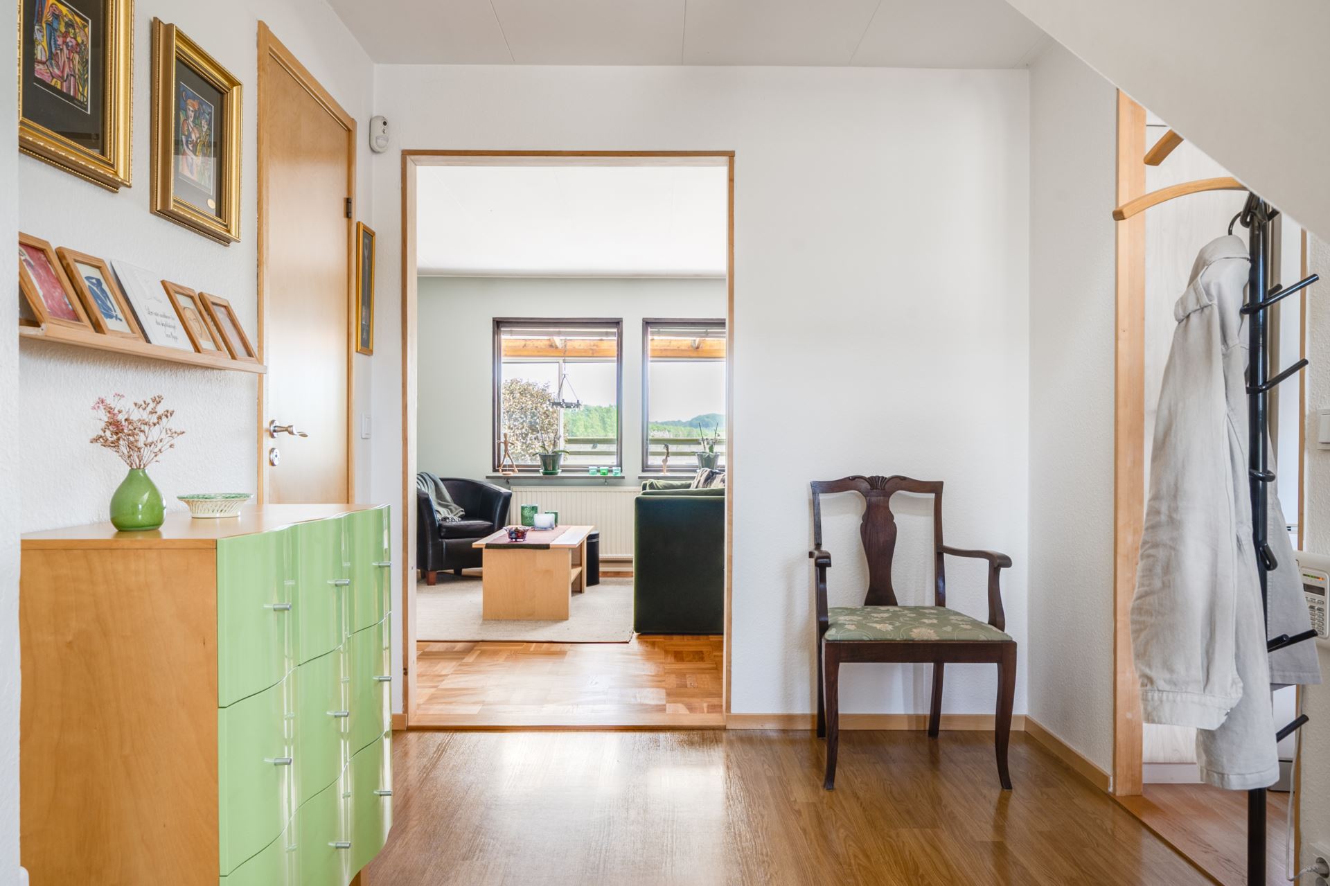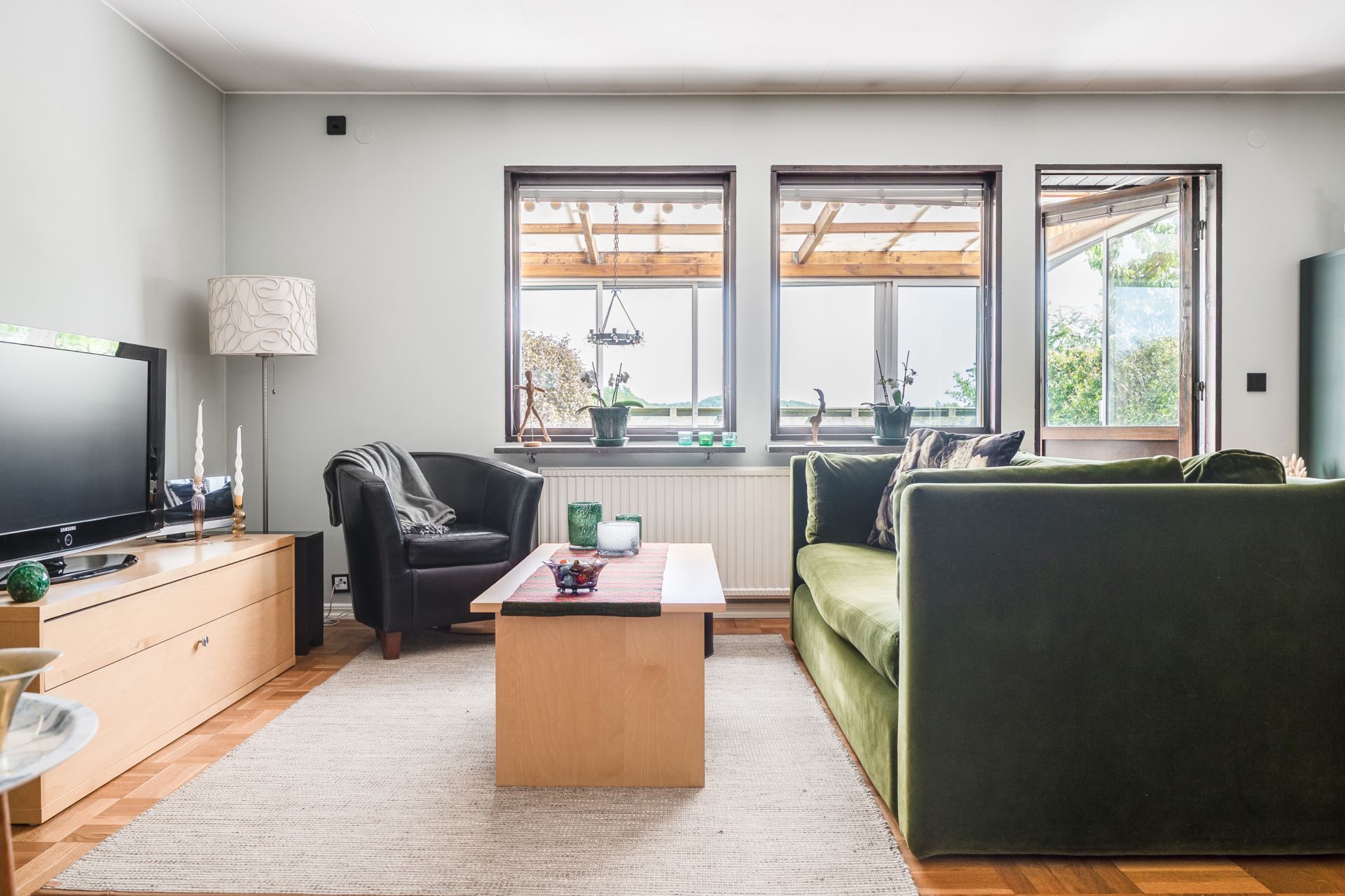 Det inglasade uterummet är en fantastisk förlängning av bostaden och erbjuder ett härligt ljusinsläpp och skyddat läge mot trädgården. Med skjutbara glaspartier och trägolv blir det en flexibel yta som kan nyttjas stora delar av året. För måltider, avkoppling eller umgänge. Härifrån har du direkt access till den privata trädgården och fin utsikt över det gröna omkringliggande landskapet.
