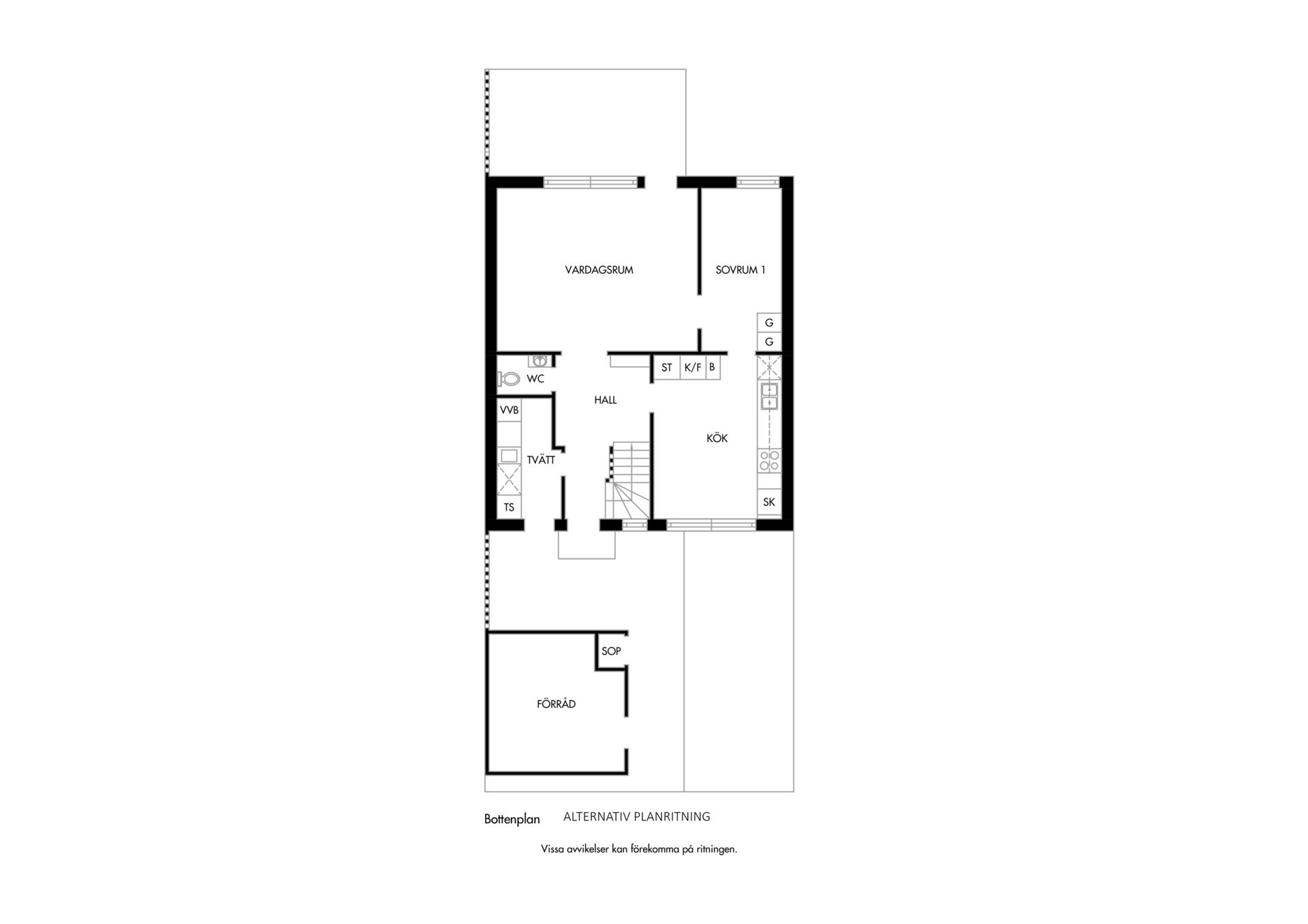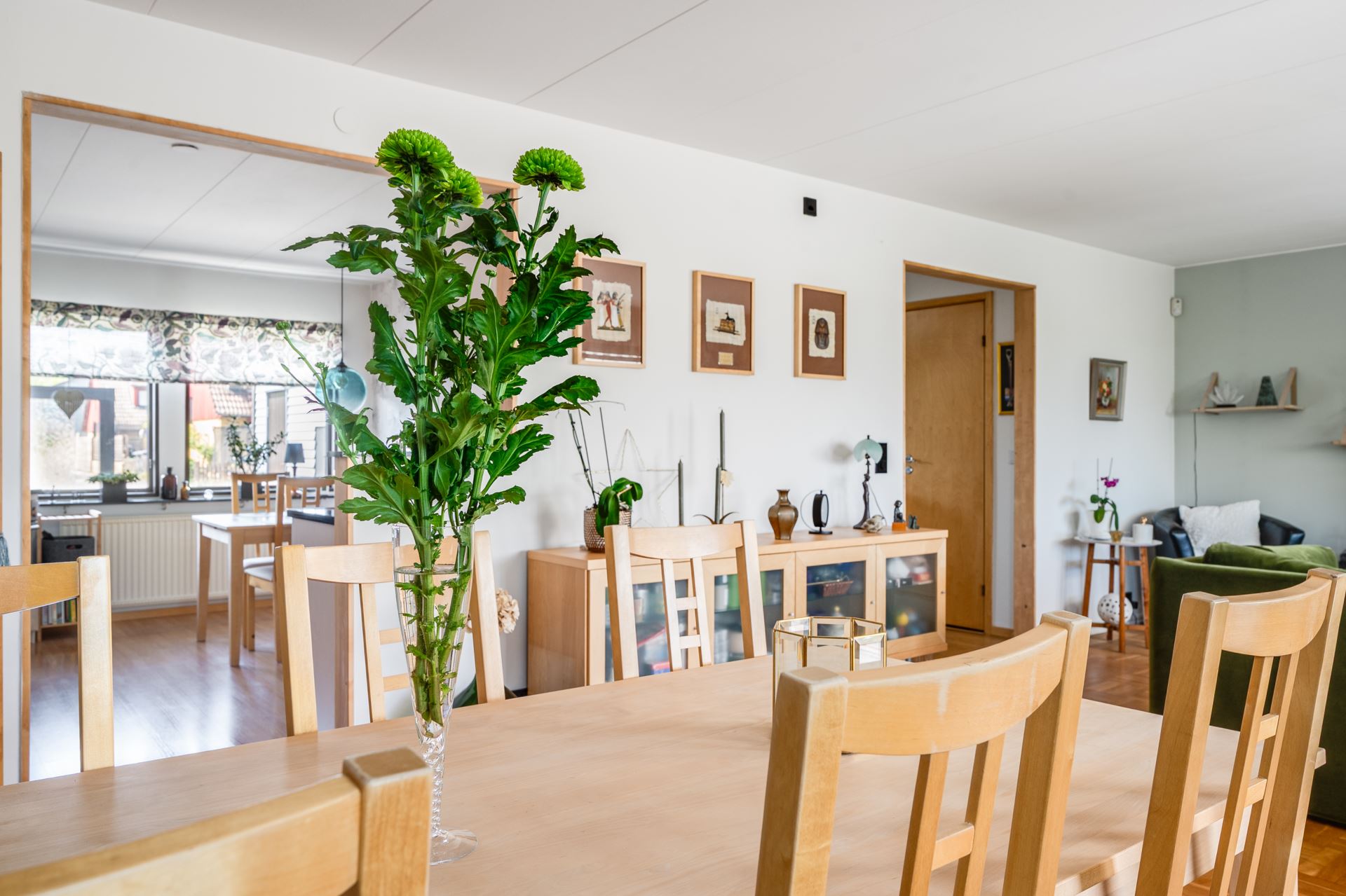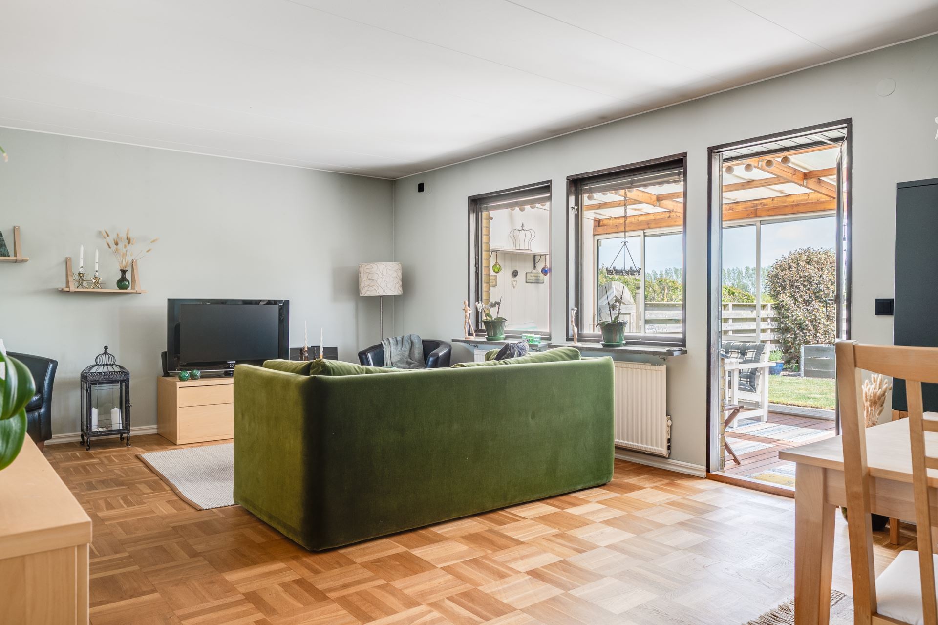 Ljust och inbjudande vardagsrum med fint ljusinsläpp och smidig access till både uterum och trädgård. Här finns gott om plats för soffgrupp och andra möbler för umgänge eller avkoppling. Rummets generösa yta ger även möjlighet att dela av för att skapa ett extra sovrum vid behov. En flexibel planlösning som enkelt anpassas efter livets olika skeden.