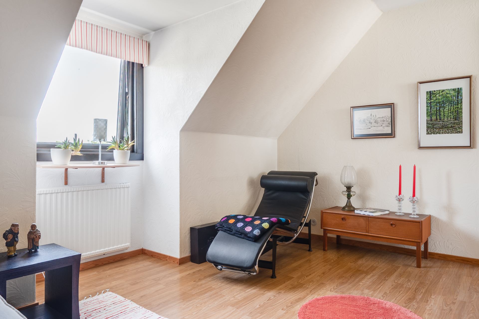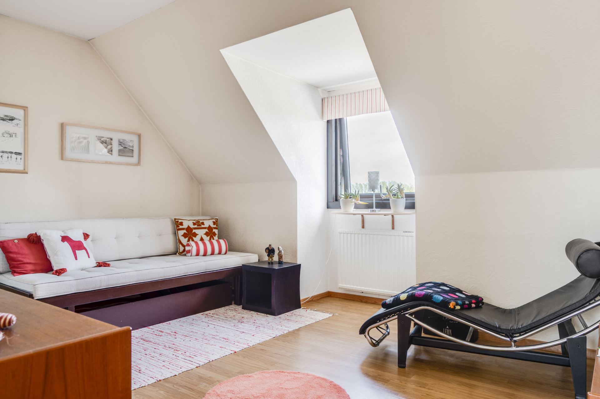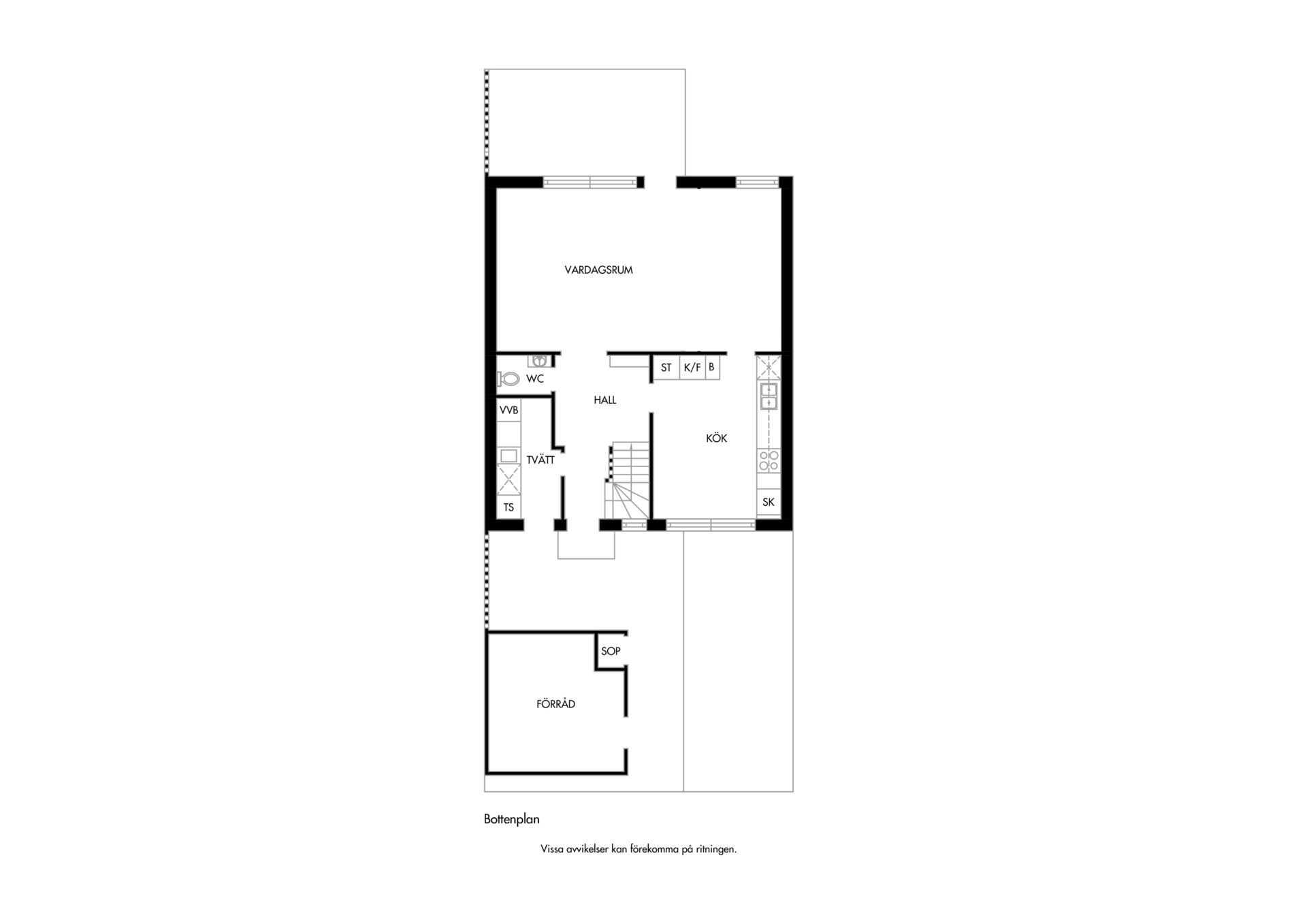 Ljust och inbjudande vardagsrum med fint ljusinsläpp och smidig access till både uterum och trädgård. Här finns gott om plats för soffgrupp och andra möbler för umgänge eller avkoppling. Rummets generösa yta ger även möjlighet att dela av för att skapa ett extra sovrum vid behov. En flexibel planlösning som enkelt anpassas efter livets olika skeden.
