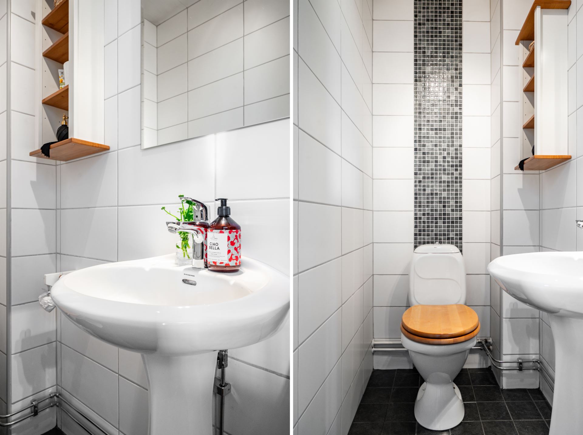 Perfekt placerad i anslutning till entrén ligger bostadens gäst-WC, stilrent inredd med vita kakelväggar och mörkt klinkergolv med golvvärme. Här finns toalett, handfat och ett praktiskt spegelskåp för förvaring. En diskret mosaikdetalj ger rummet karaktär och skapar ett trivsamt intryck för både gäster och vardagsbruk.