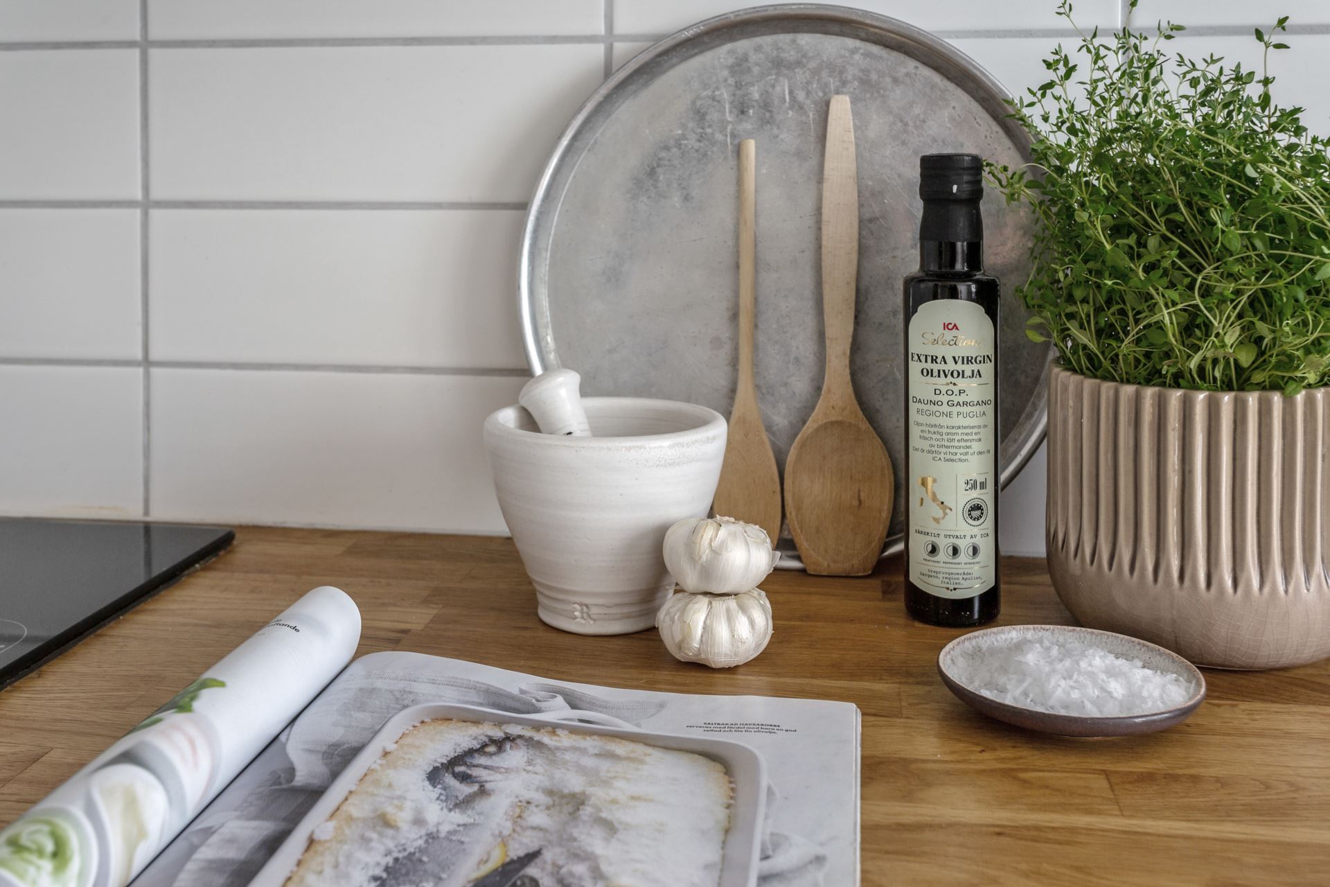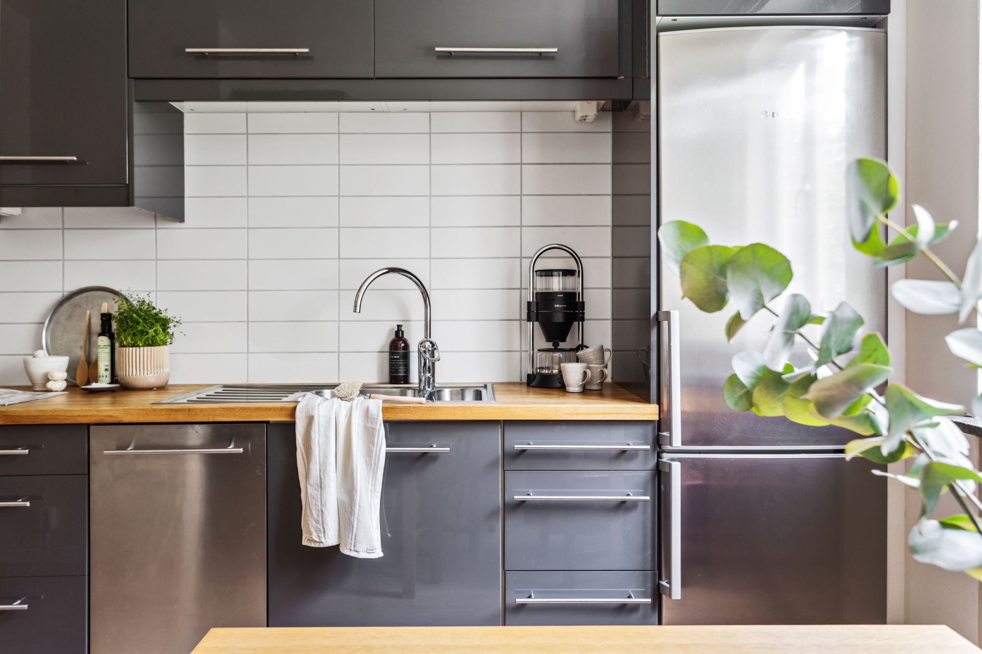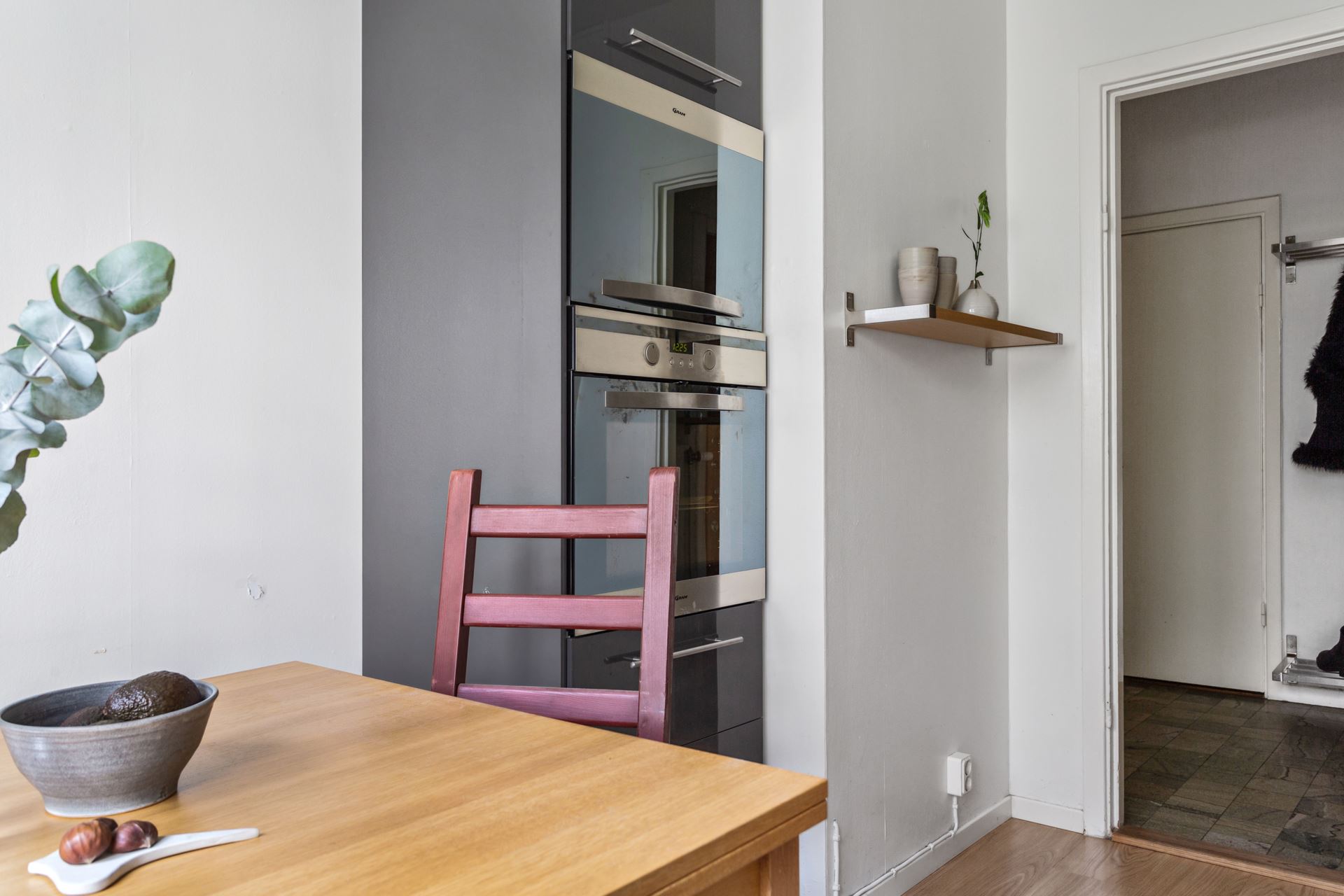 Kök från 2009 med gasspis samt inbyggd elugn från Gram, integrerad diskmaskin och rostfri kyl/frys från Bosch. Liggande vit kakel mellan under- och överskåp, spotlights samt vinklad fläktkåpa. Arbetsbänk i oljad ek blir snyggt till högblanka luckor i gråblå ton. Golv i eklaminat och vita väggar.