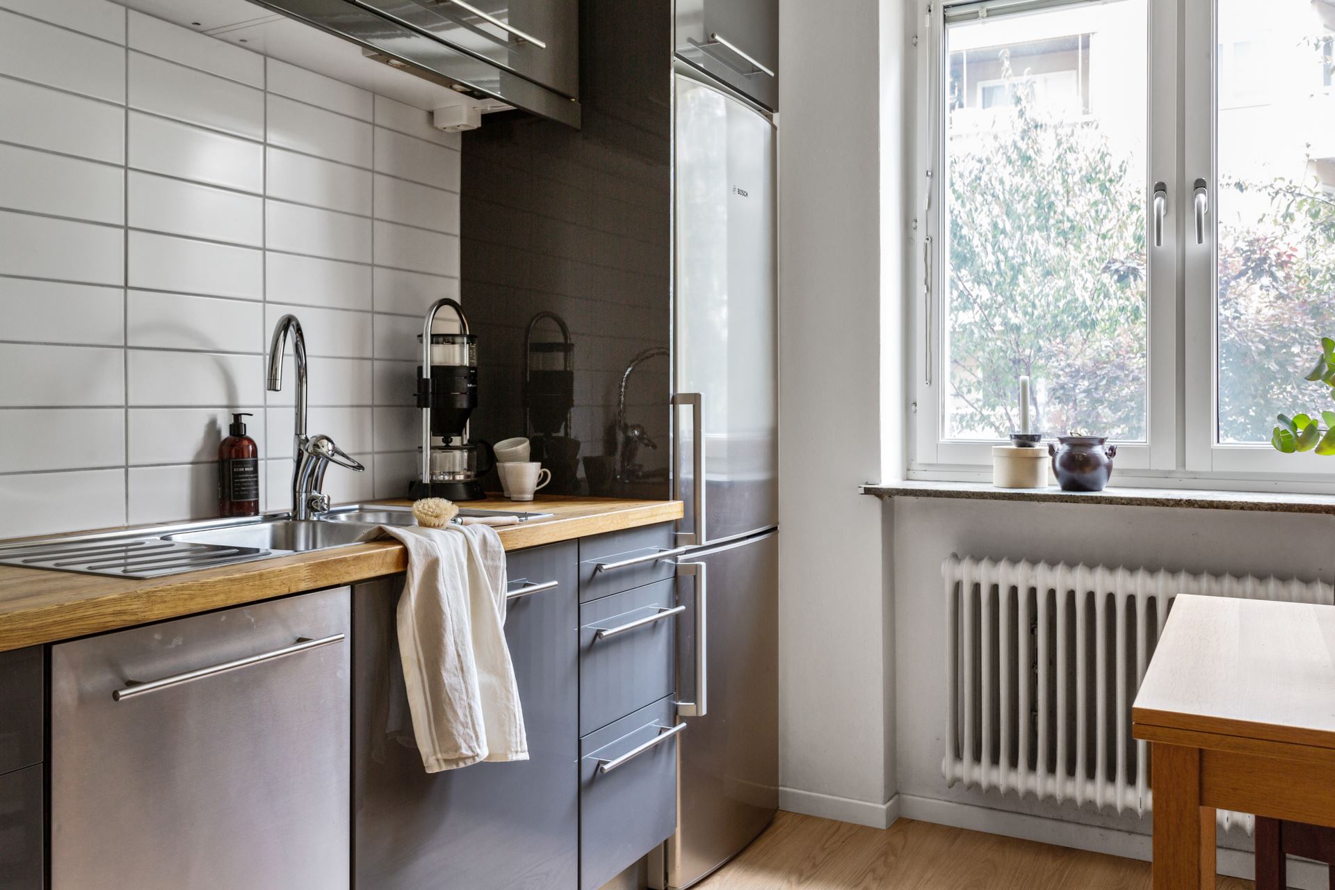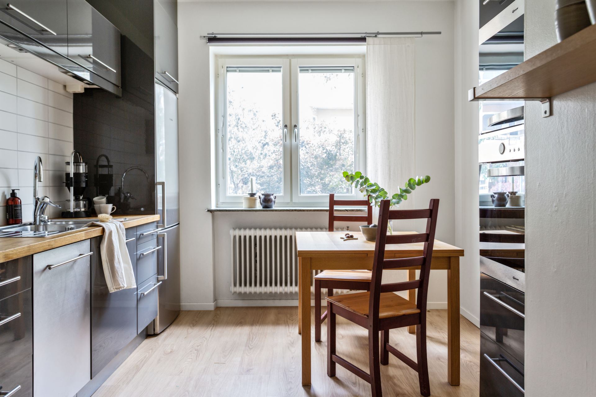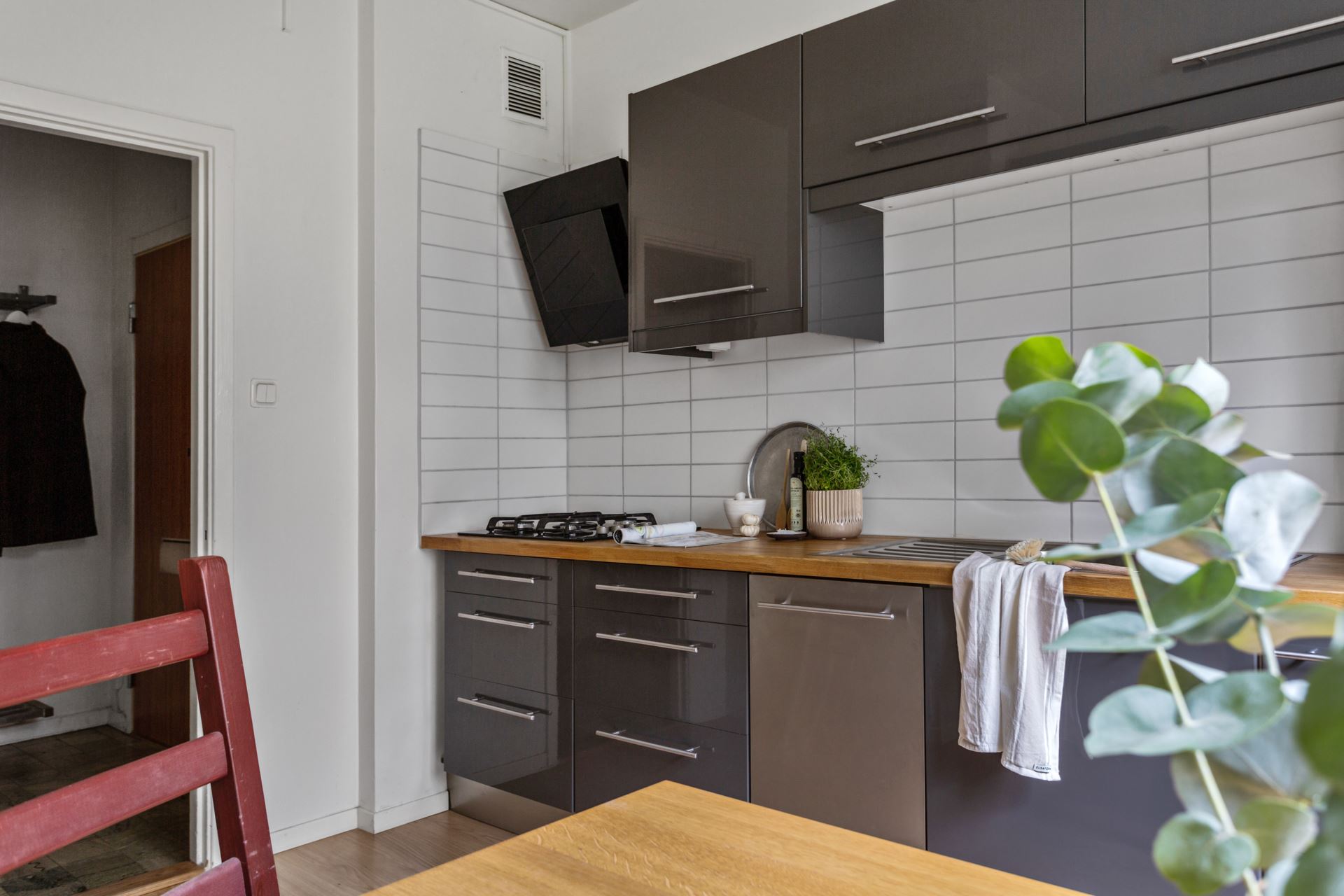 Kök från 2009 med gasspis samt inbyggd elugn från Gram, integrerad diskmaskin och rostfri kyl/frys från Bosch. Liggande vit kakel mellan under- och överskåp, spotlights samt vinklad fläktkåpa. Arbetsbänk i oljad ek blir snyggt till högblanka luckor i gråblå ton. Golv i eklaminat och vita väggar.