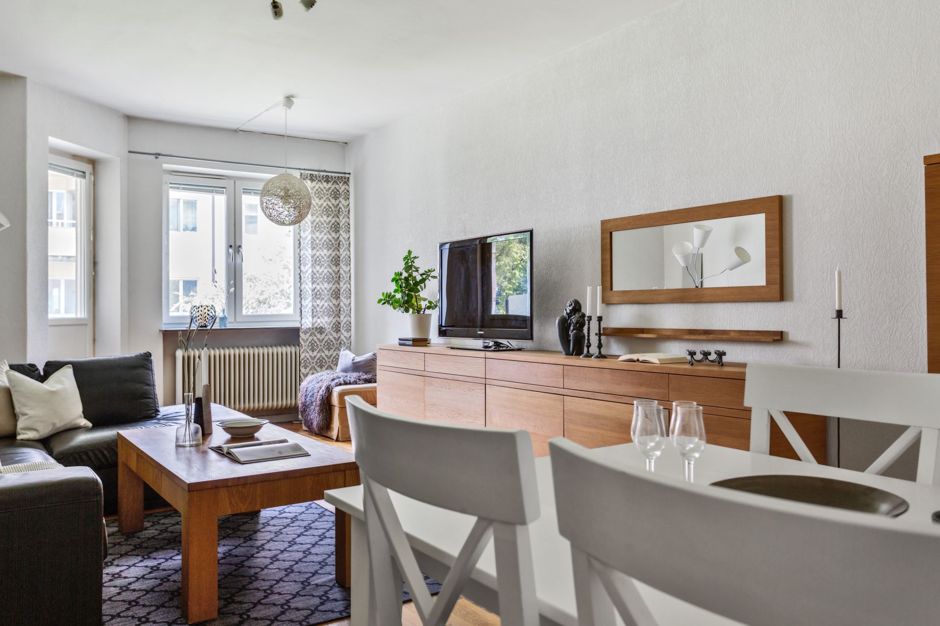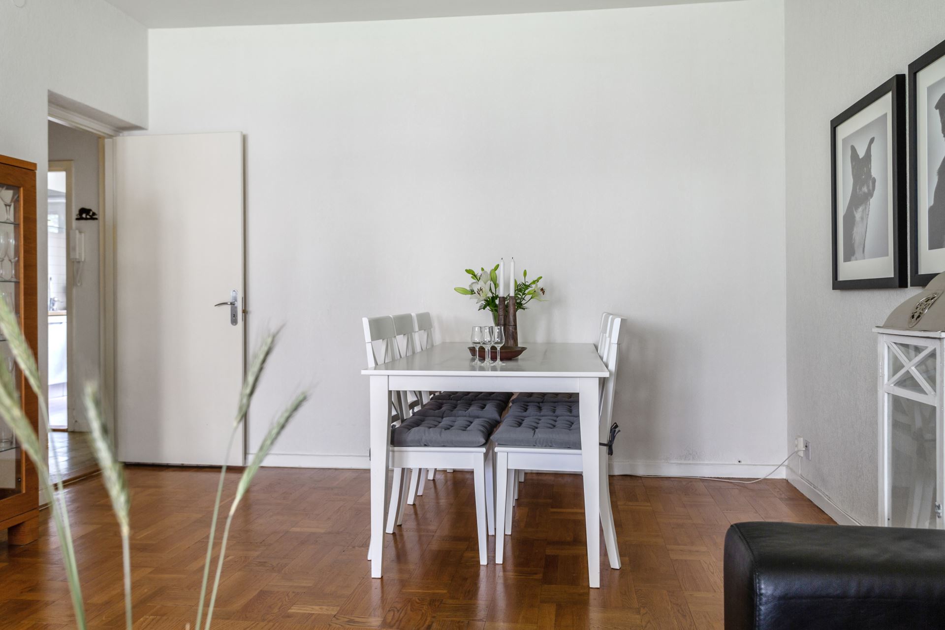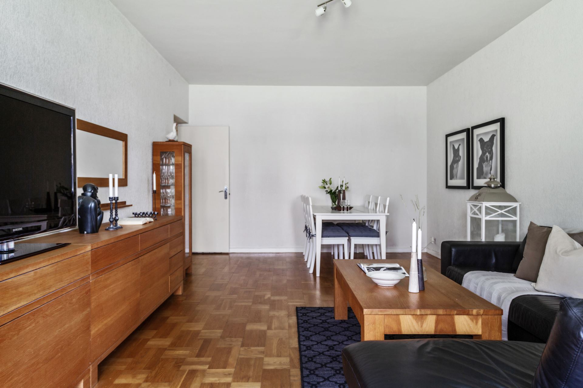 Ett stort och härligt vardagsrum välkomnar med välbevarad originalparkett i ek och vita väggar. Här får man med enkelhet plats med både soffgrupp och matplats. Den sydvästvända balkongen är perfekt belägen med utgång från vardagsrummet och tillsammans med stort fönsterparti blir detta en trivsam plats att samlas på.