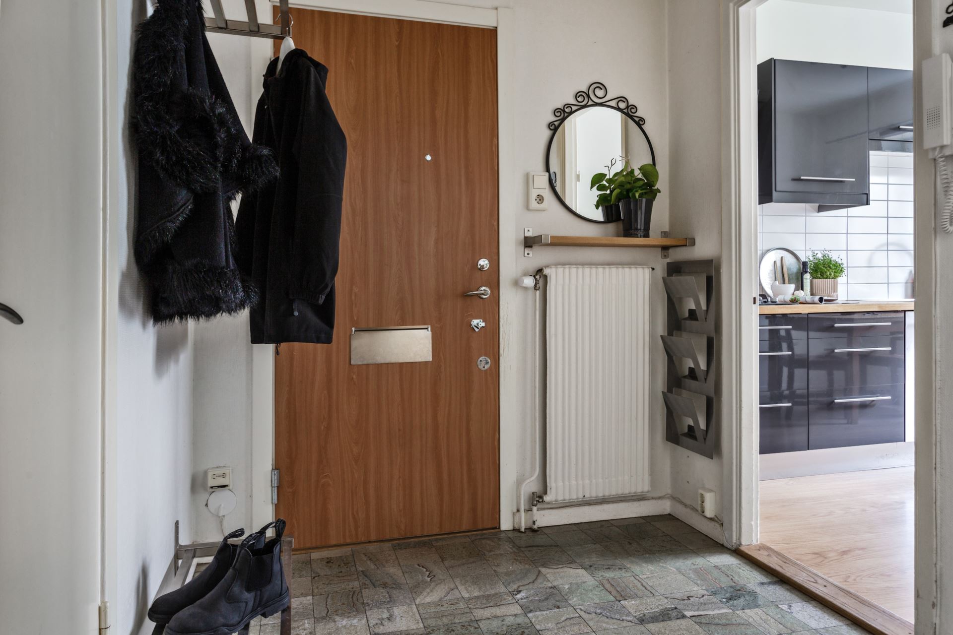 Tidstypisk hall med vackert stengolv. Hatthylla och skohylla ingår i köpet. Dold förvaring i garderob finns i anslutning till hallen.