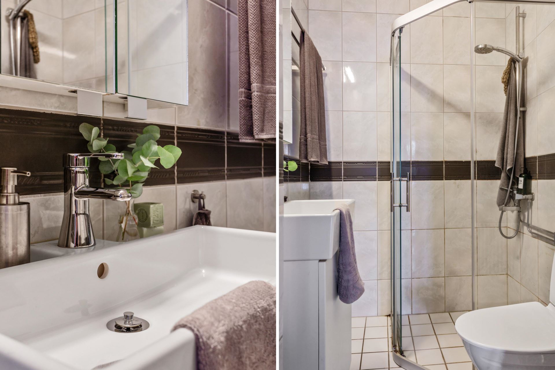 Till sist finner vi ett helkaklat badrum i vitt med dusch och förvaring bakom spegelskåp med tillhörande belysning, ny wc- stol och praktiskt tvättställ.