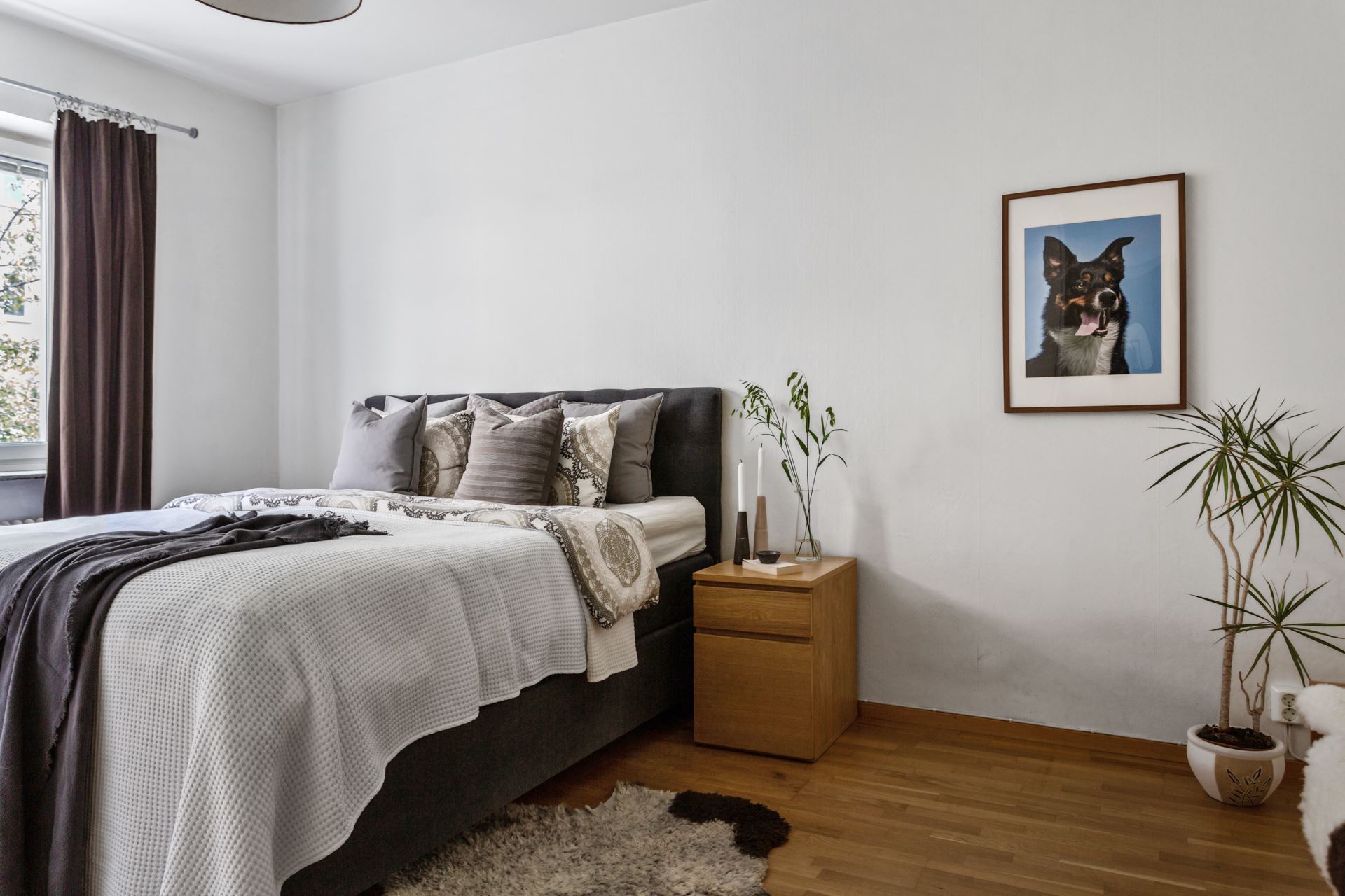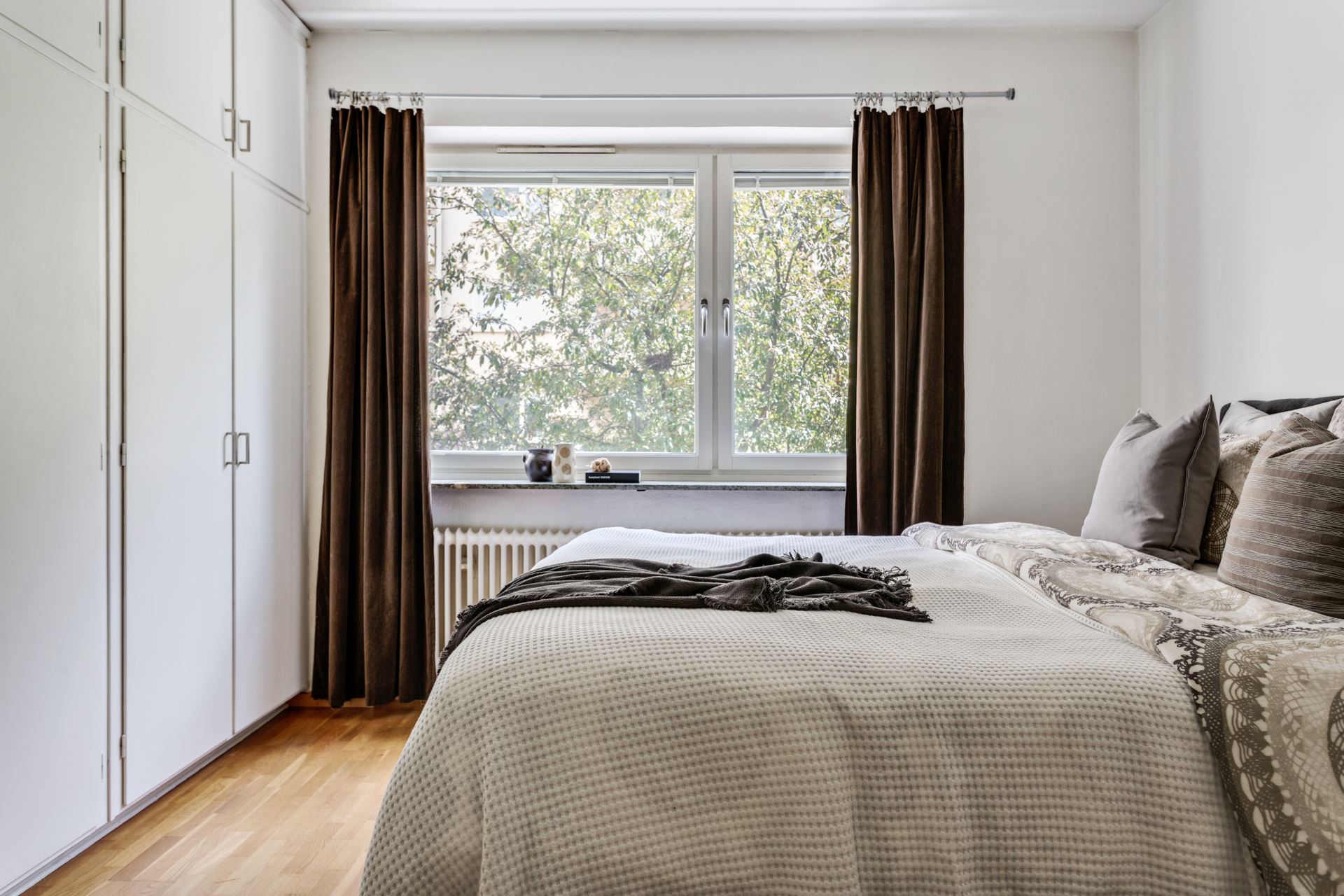 Sovrummet är beläget lugnt och skyddat inne i byggnadens "U". Garderobsparti med hela fem garderober som löper längsmed hela kortsidan. Vita väggar och ekparkett.