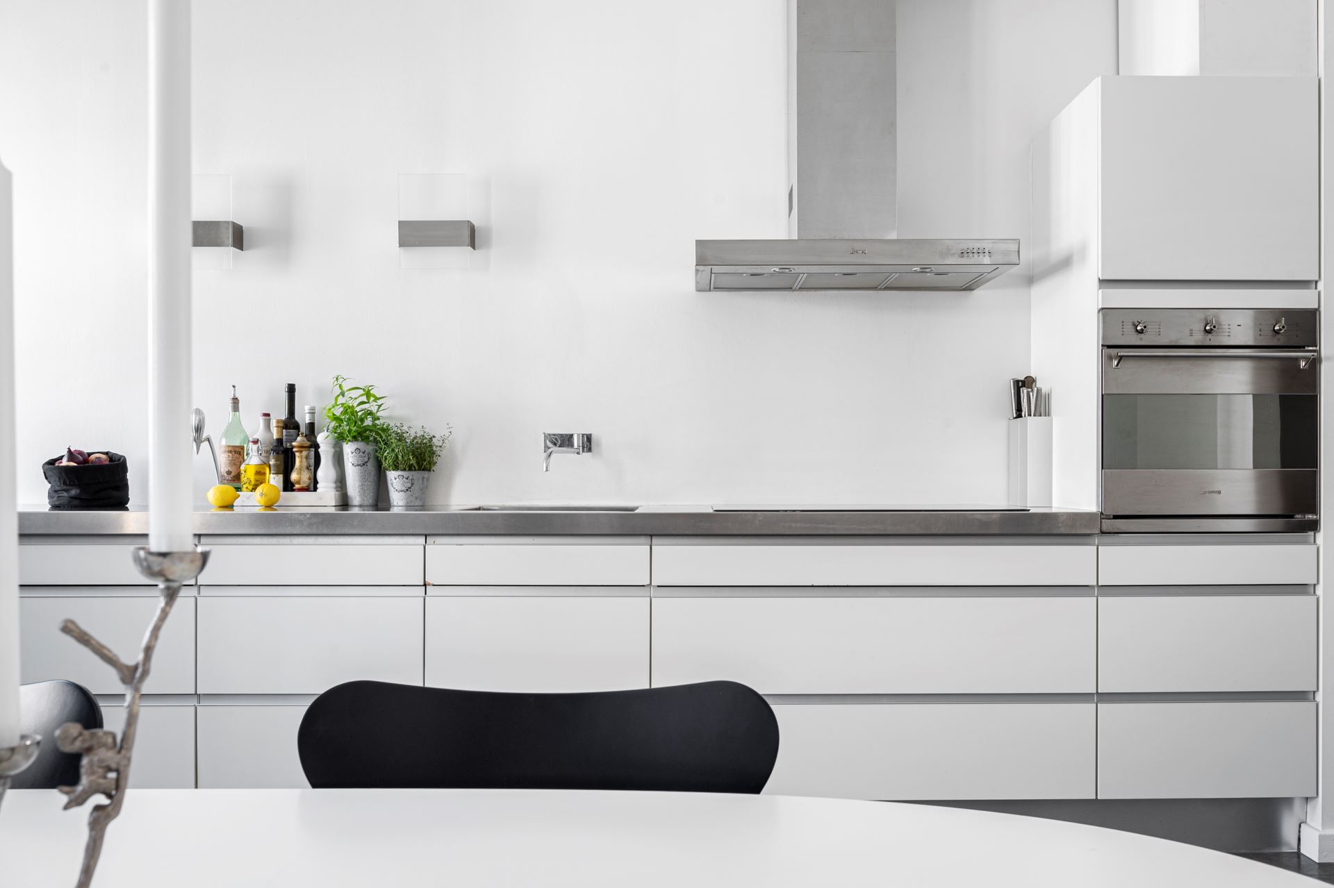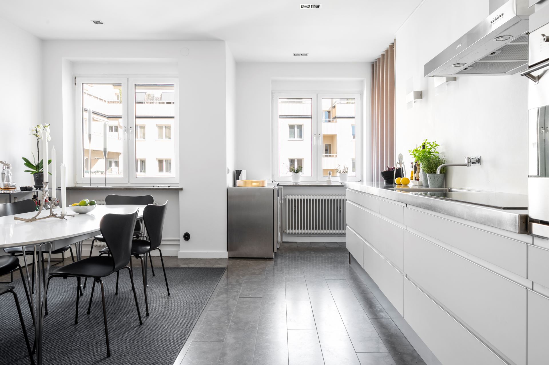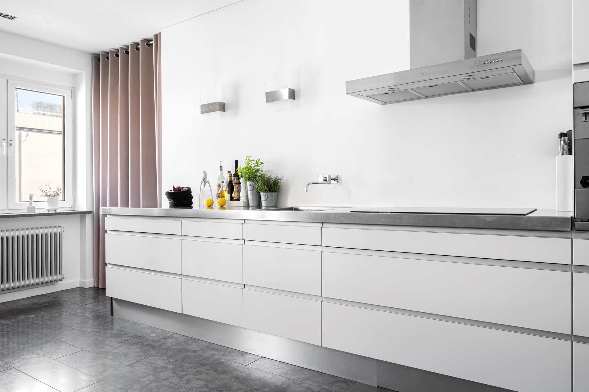 Direkt till höger från hallen når vi våningens generösa kök. Förvaring får vi bakom luckor i vitt (JKE Design) som kombineras fint med måttbeställd helgjuten bänkskiva i rostfritt. Inbyggd kran och blandare från Vola. Köket är utrustat med induktionshäll, fläkt, ugn från SMEG samt integrerad diskmaskin från IKEA och kyl/frys med ismaskin från Samsung. I köket finns även tvättmaskin och torktumlare att tillgå. Köket har vita väggar, grått stengolv med golvvärme och spotlights i taket.