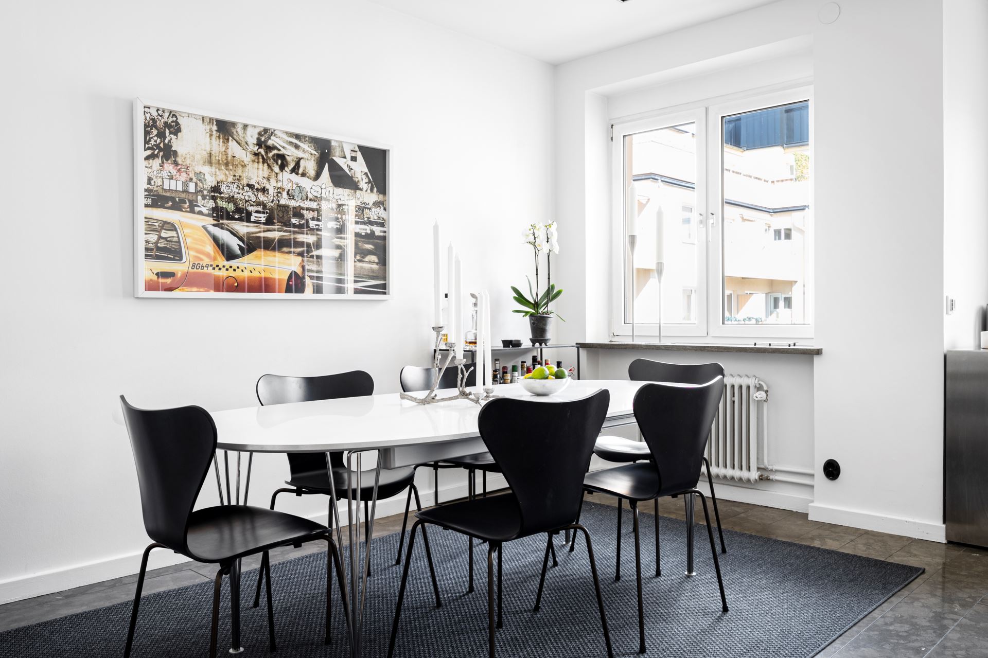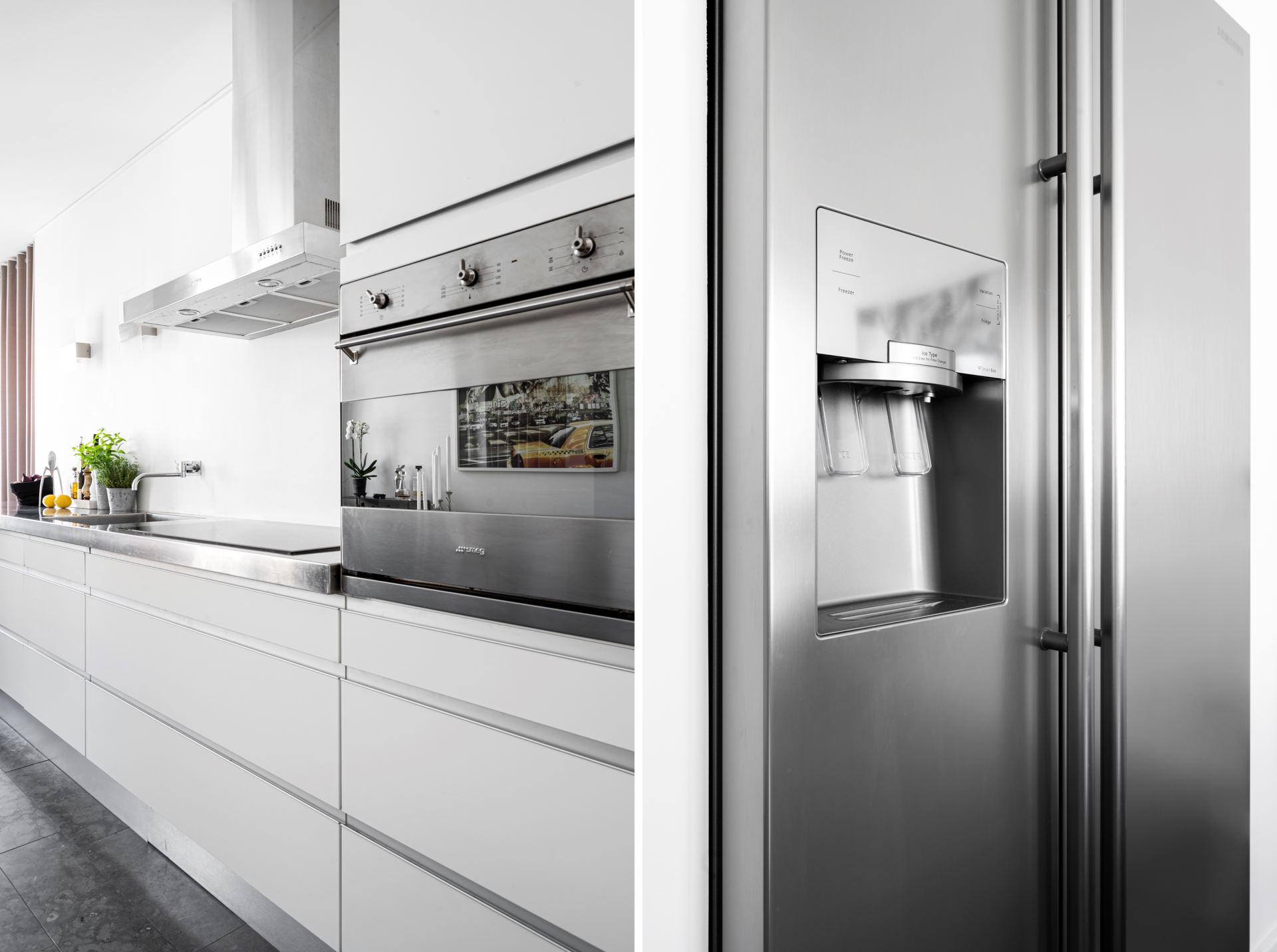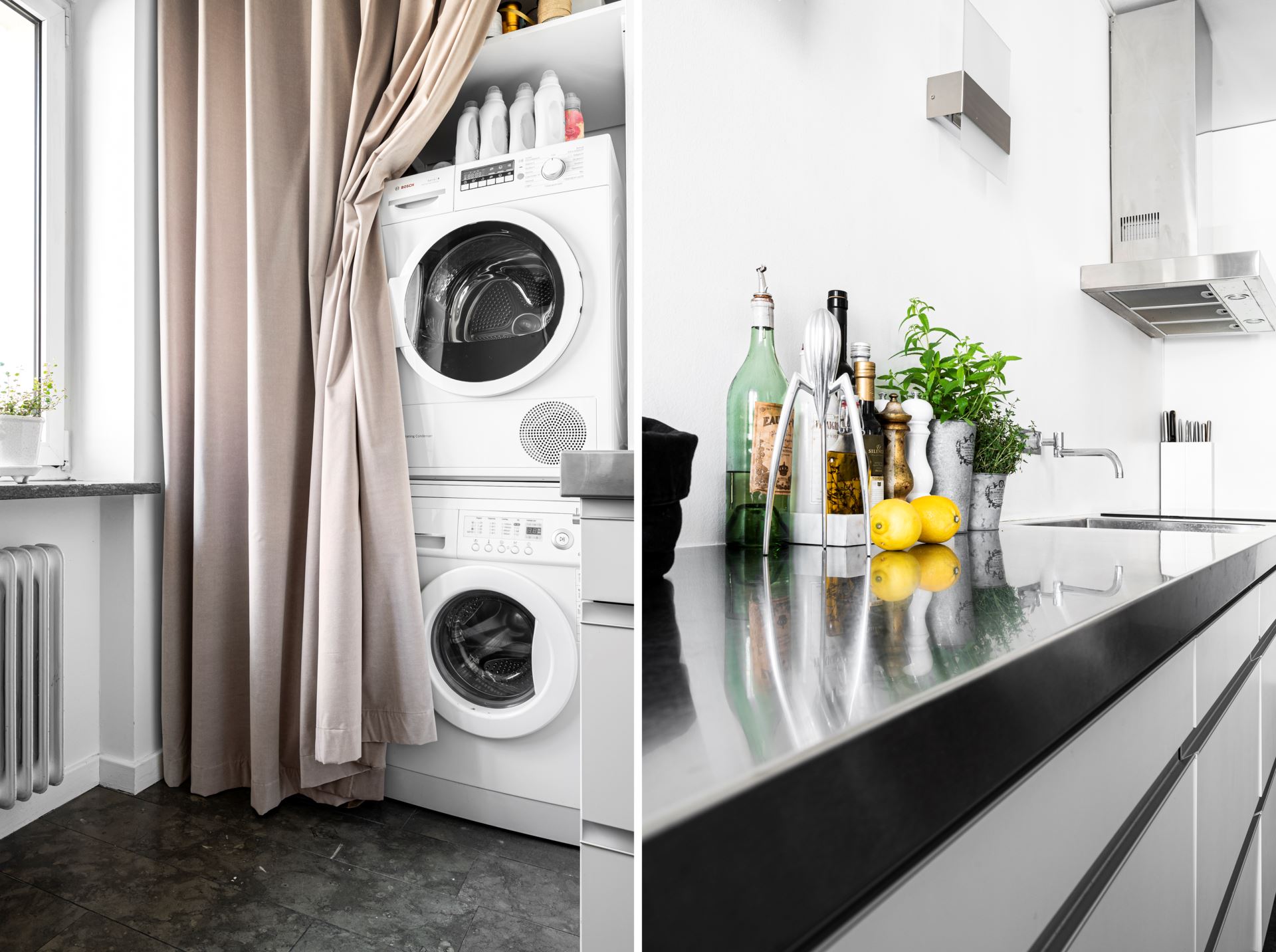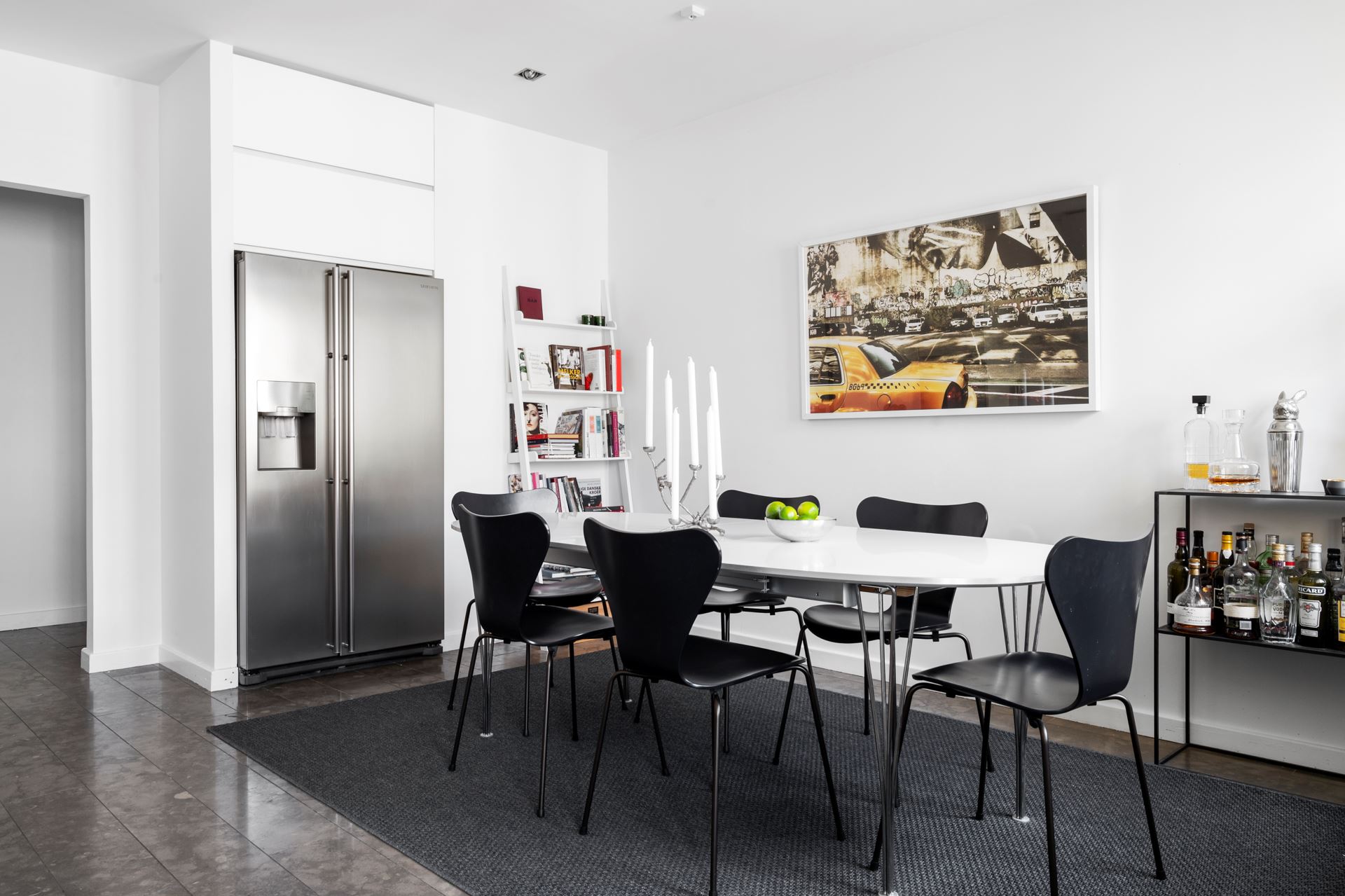 Direkt till höger från hallen når vi våningens generösa kök. Förvaring får vi bakom luckor i vitt (JKE Design) som kombineras fint med måttbeställd helgjuten bänkskiva i rostfritt. Inbyggd kran och blandare från Vola. Köket är utrustat med induktionshäll, fläkt, ugn från SMEG samt integrerad diskmaskin från IKEA och kyl/frys med ismaskin från Samsung. I köket finns även tvättmaskin och torktumlare att tillgå. Köket har vita väggar, grått stengolv med golvvärme och spotlights i taket.