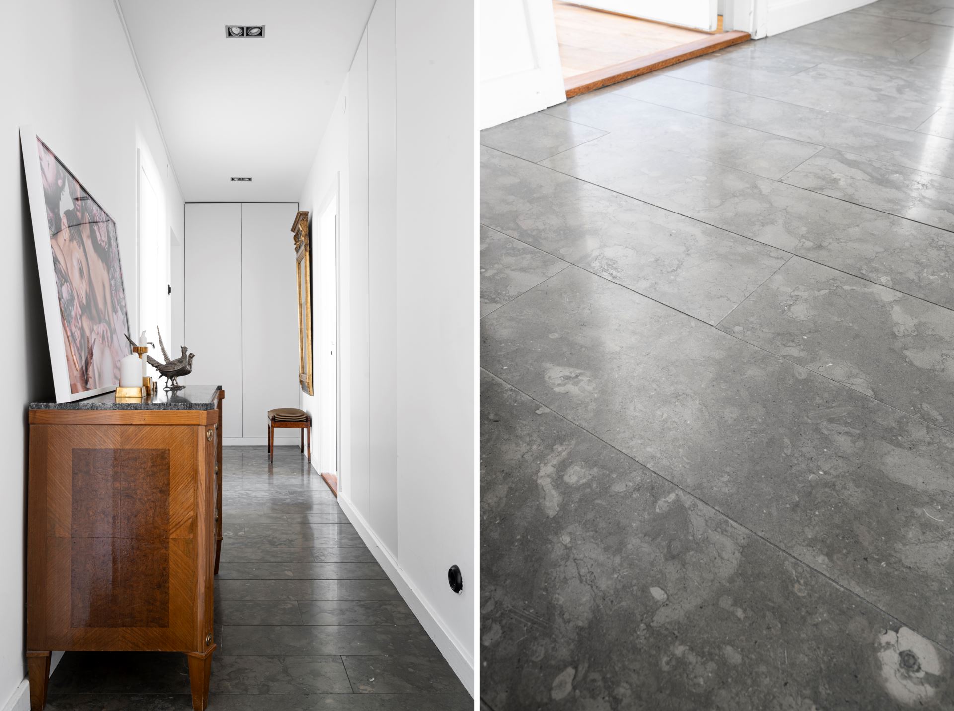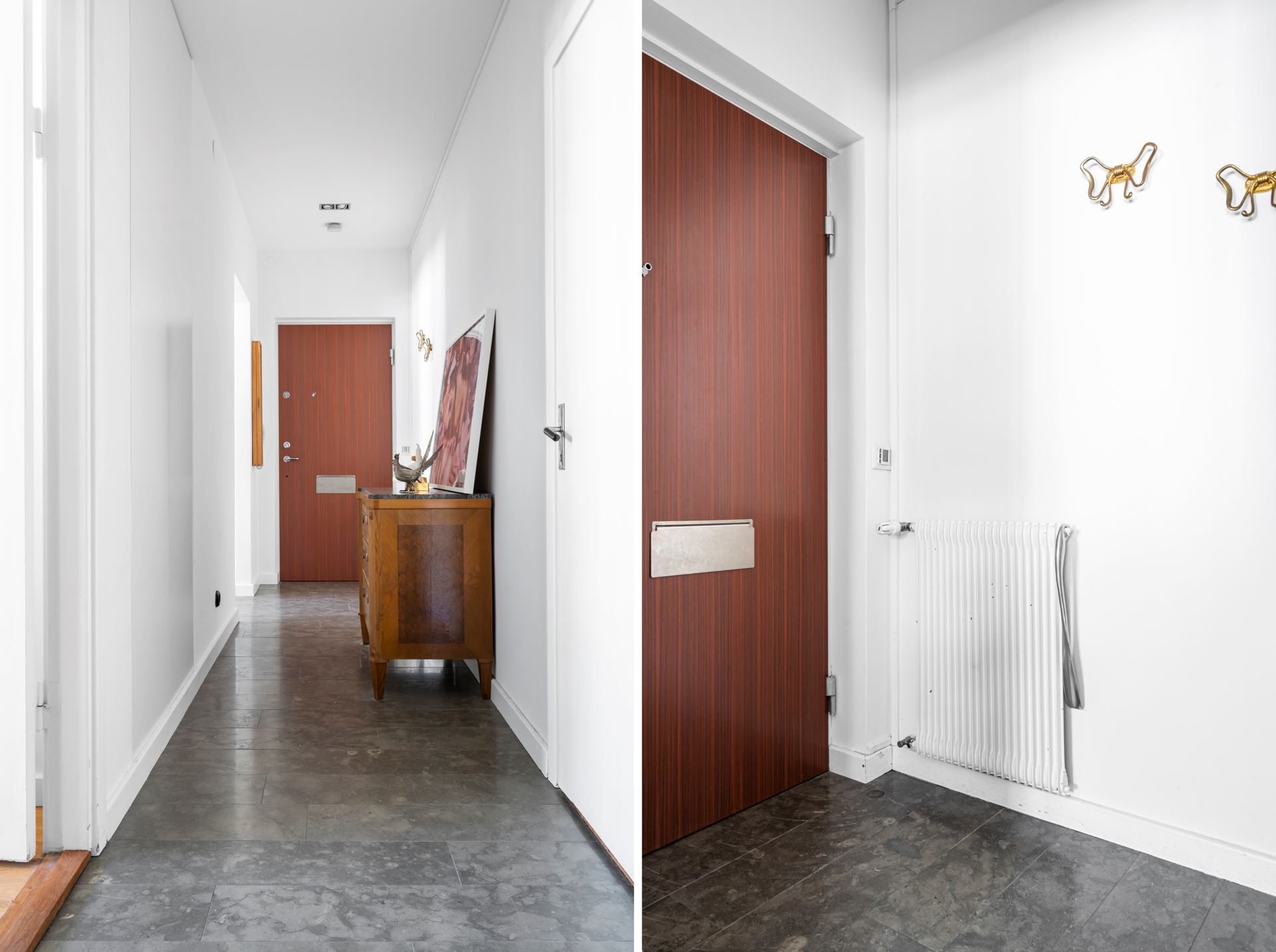 Vi tar oss upp till fjärde våningen och via säkerhetsdörr välkomnar en praktisk hall med vitmålade väggar i kombination med grått stengolv som förenar hall och det rymliga köket. I hallen finns goda avhängningsmöjligheter för ytterkläder samt även gott om utrymme för dold förvaring längst fram i korridoren. I taket finns infällda spotlights, snyggt och välplanerat.