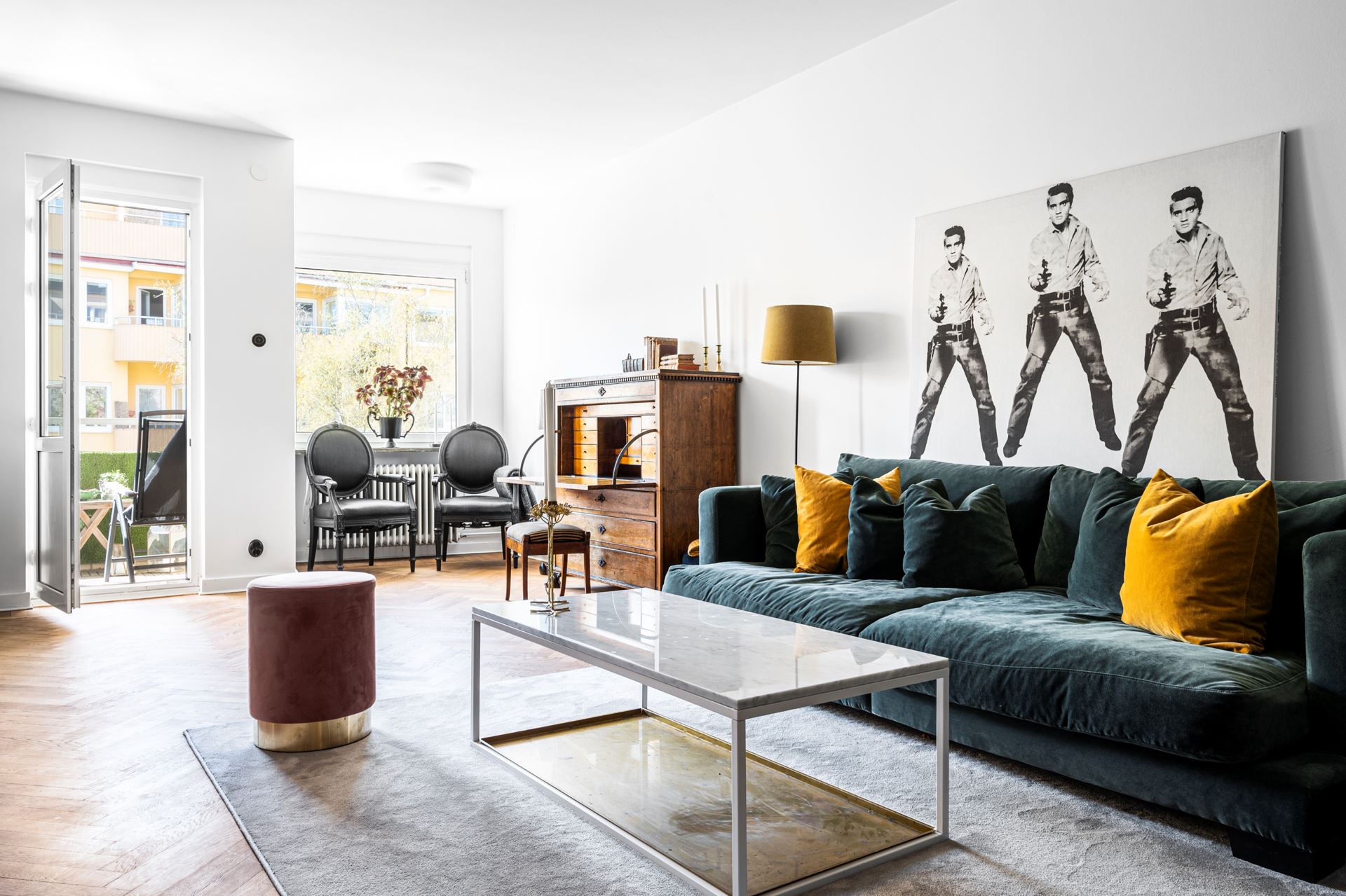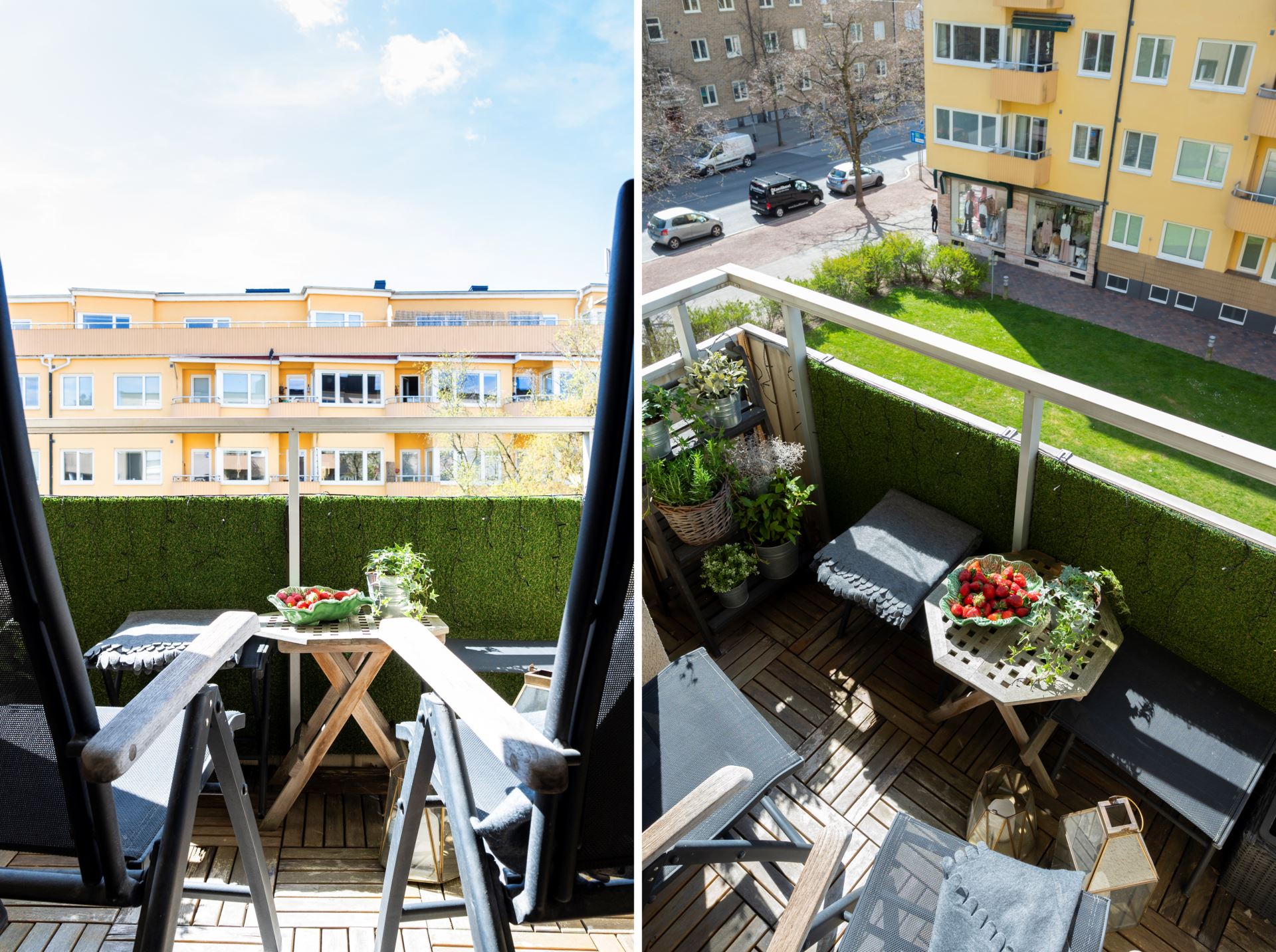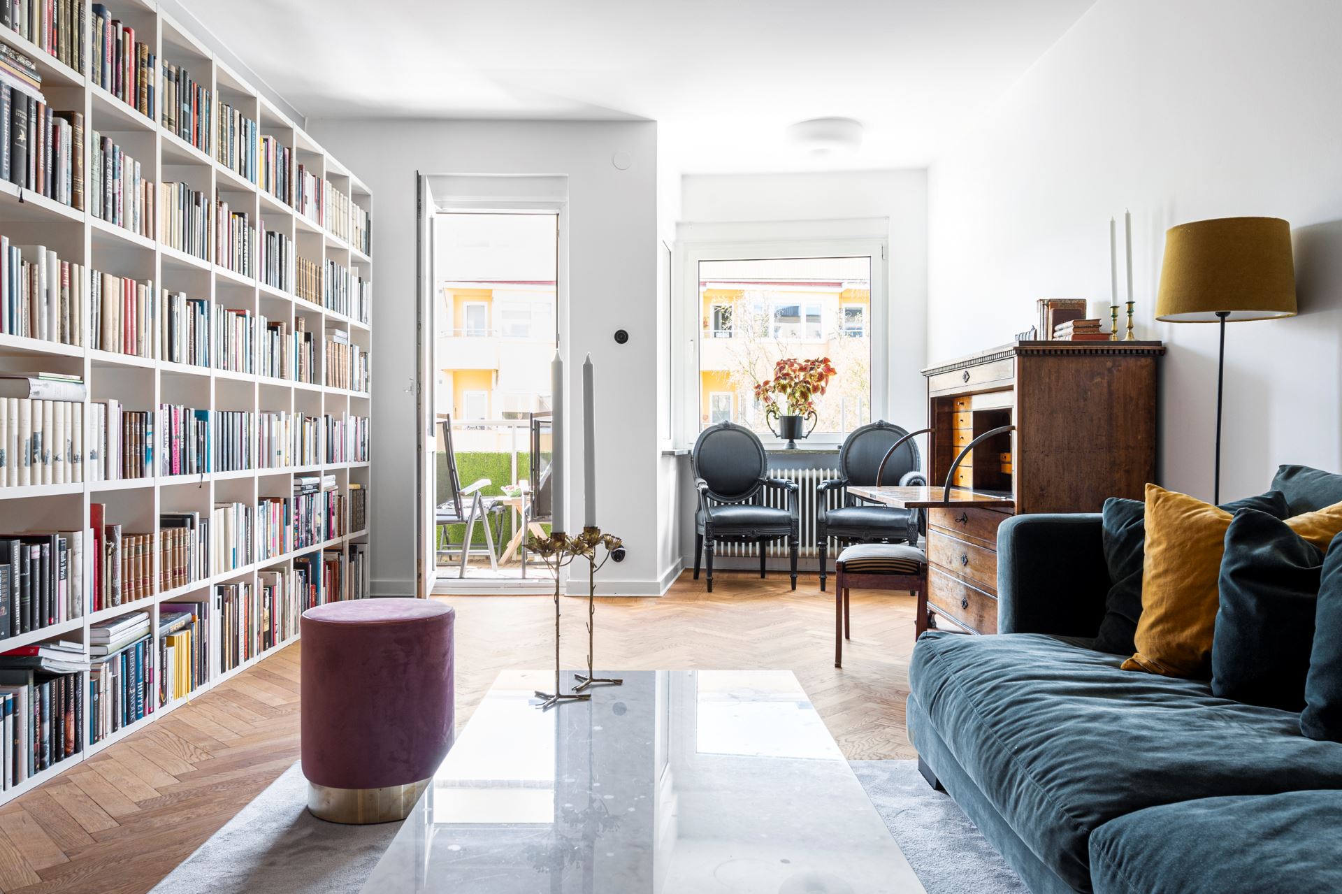Vi tar oss vidare till lägenhets allrum där golvet kläs av vacker oljad fiskbensparkett som smakfullt möter vita väggar. Här finns plast för både matbord, soffhörna och de sobert blå linneskåpen från Picky Living ingår i köpet. Från vardagsrummet når vi även balkongen där man kan njuta av solen många timmar om dagen.