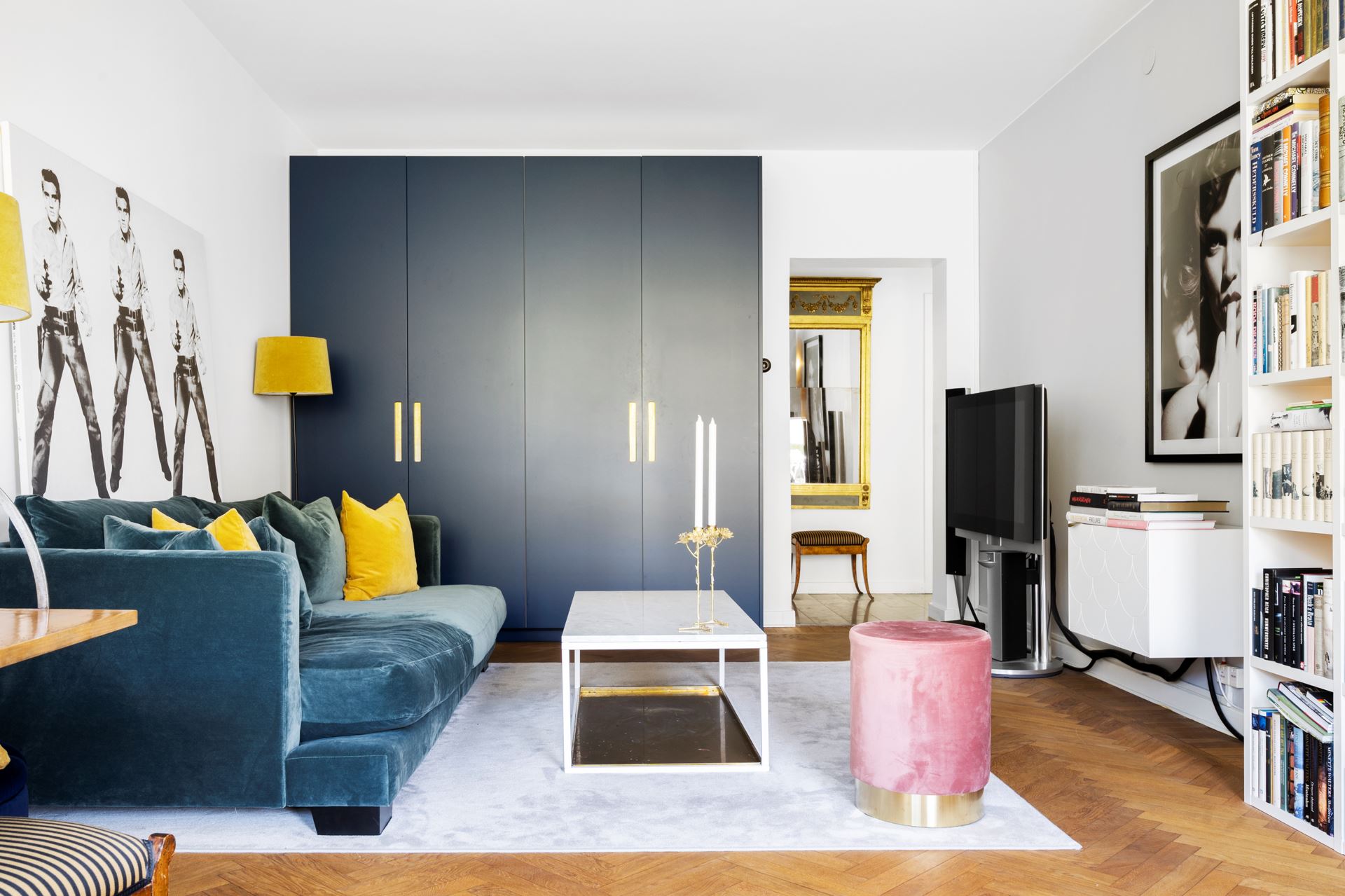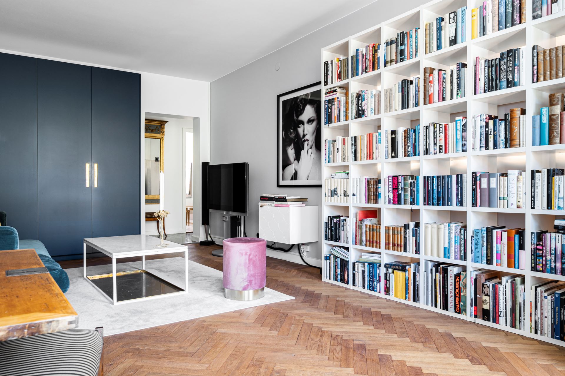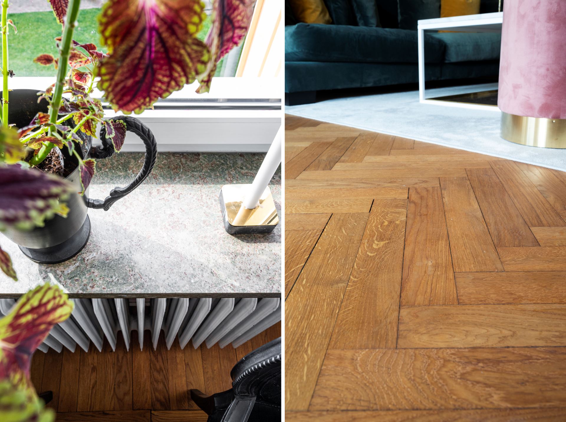 Vi tar oss vidare till lägenhets allrum där golvet kläs av vacker oljad fiskbensparkett som smakfullt möter vita väggar. Här finns plast för både matbord, soffhörna och de sobert blå linneskåpen från Picky Living ingår i köpet. Från vardagsrummet når vi även balkongen där man kan njuta av solen många timmar om dagen.