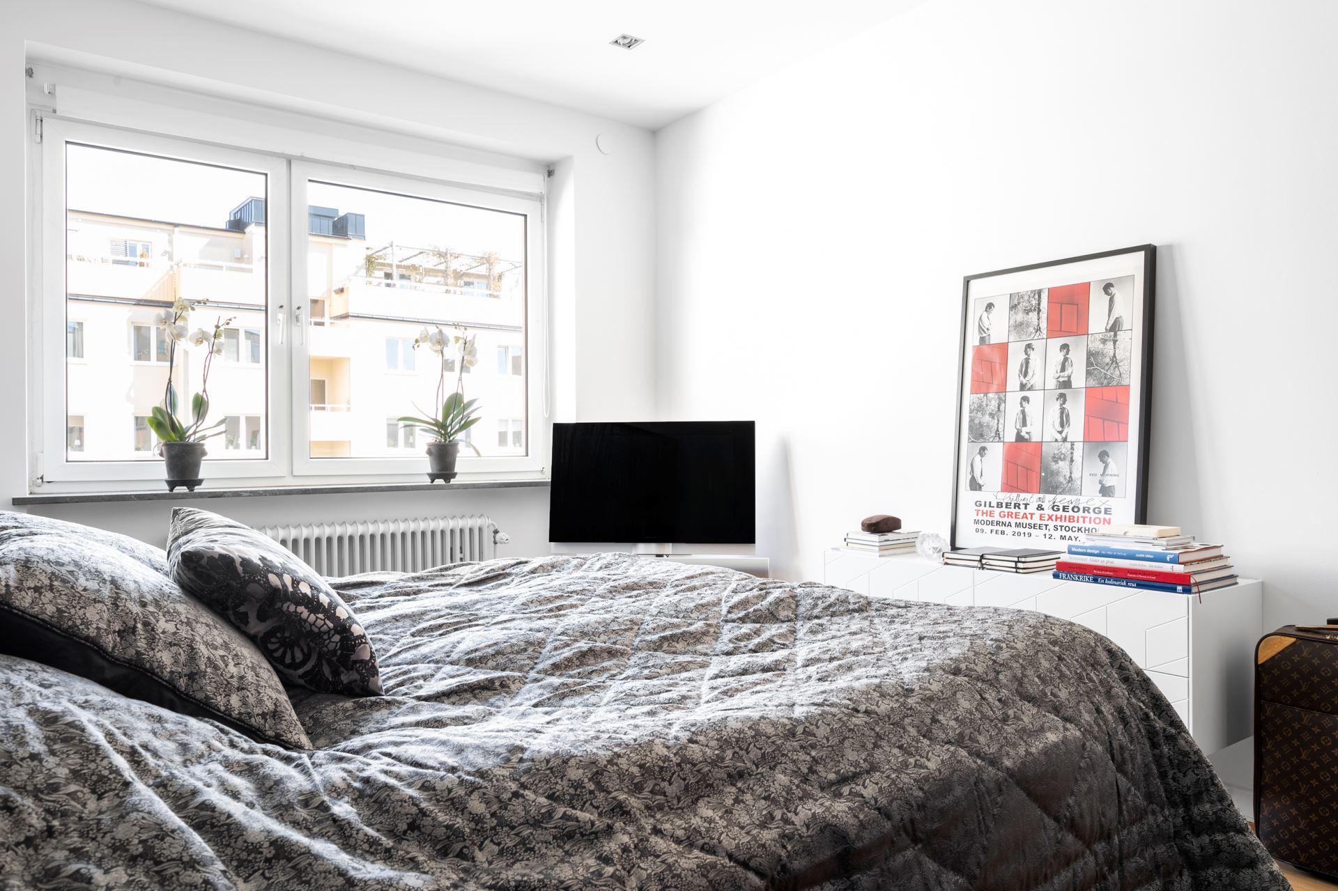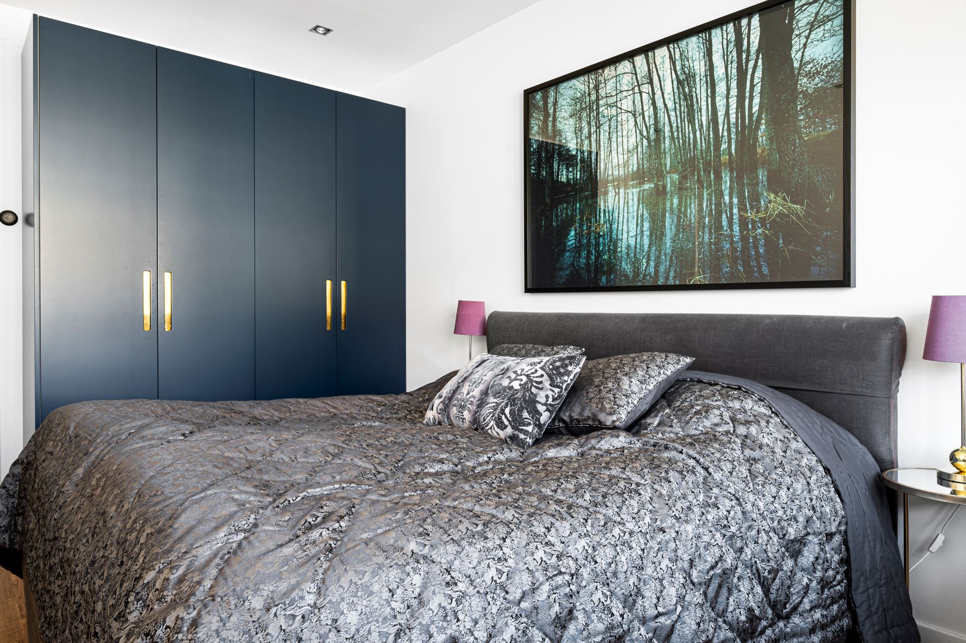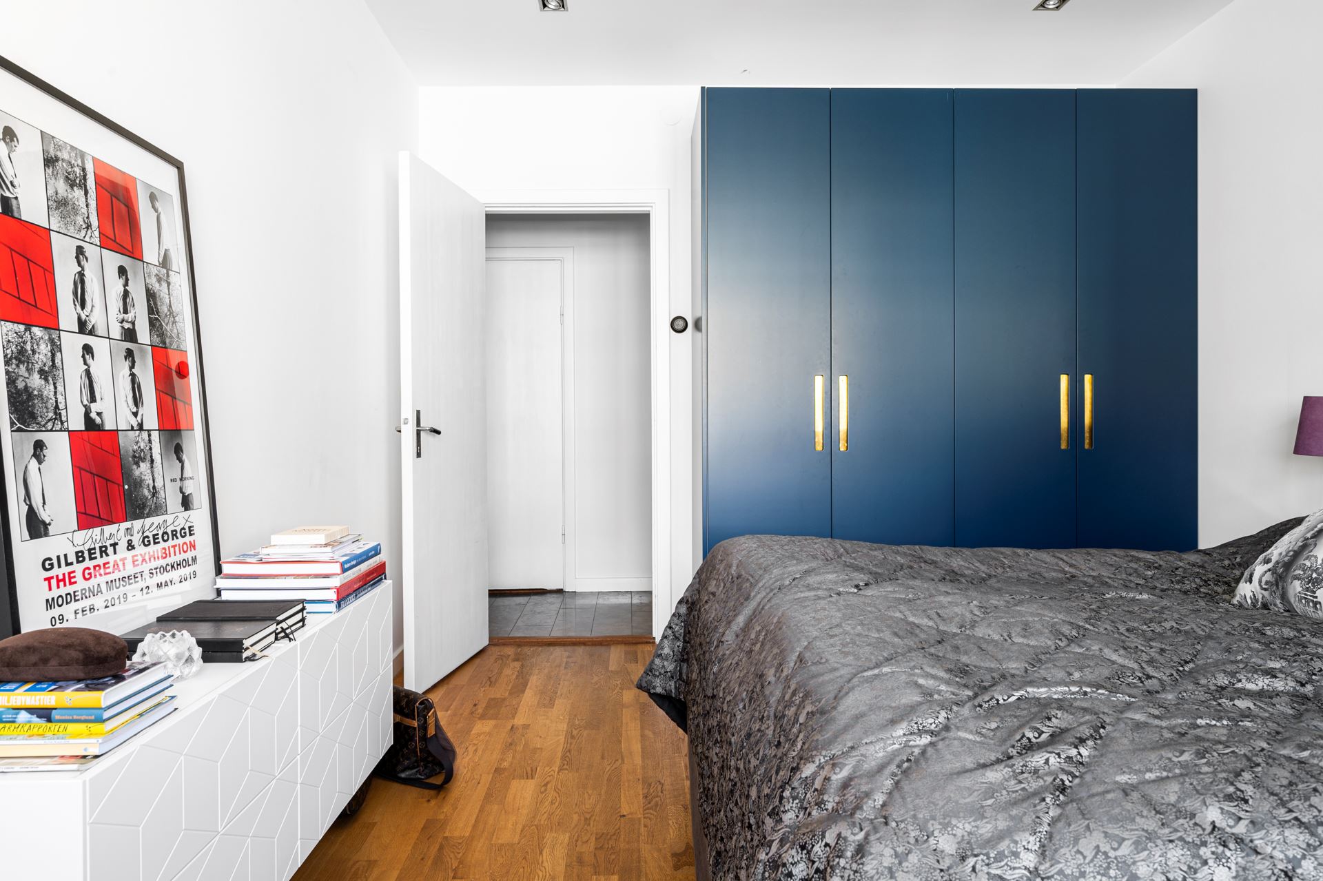 Väl tilltaget sovrum med stora fönsterpartier som skänker rikligt med ljus. Här ryms dubbelsäng samt garderober i sobert blått från Picky Living, som även här ingår i köpet. Oljad ekparkett kombineras med vita väggar och infällda spotlights i taket.