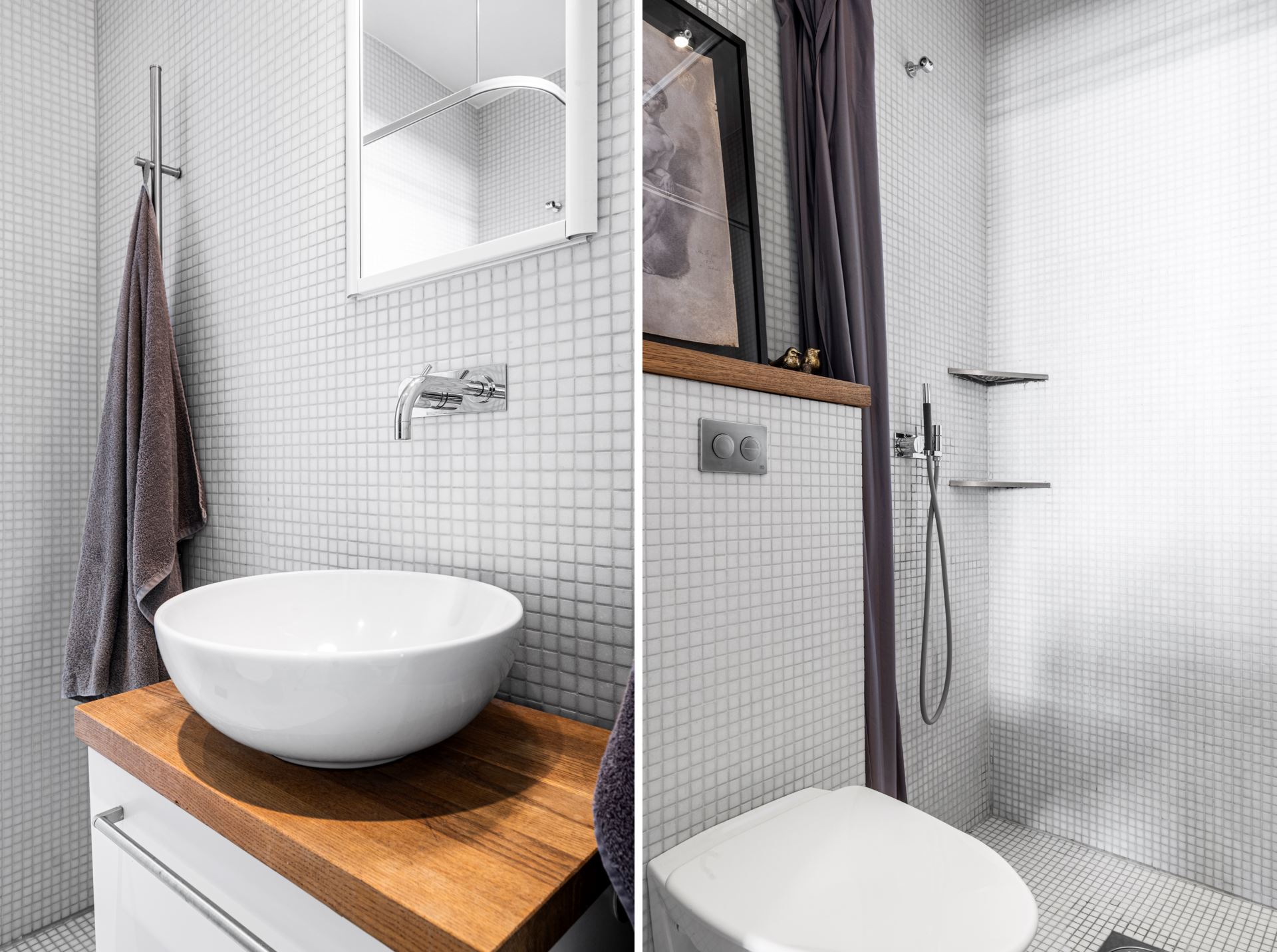 Fräscht helkaklat badrum där såväl golv som väggar har cremevit mosaik. Badrummet har vägghängd toalett, inbyggda kranar och dusch från Vola, inbyggt badrumsskåp, handduksvärmare och infällda spotlights i taket.