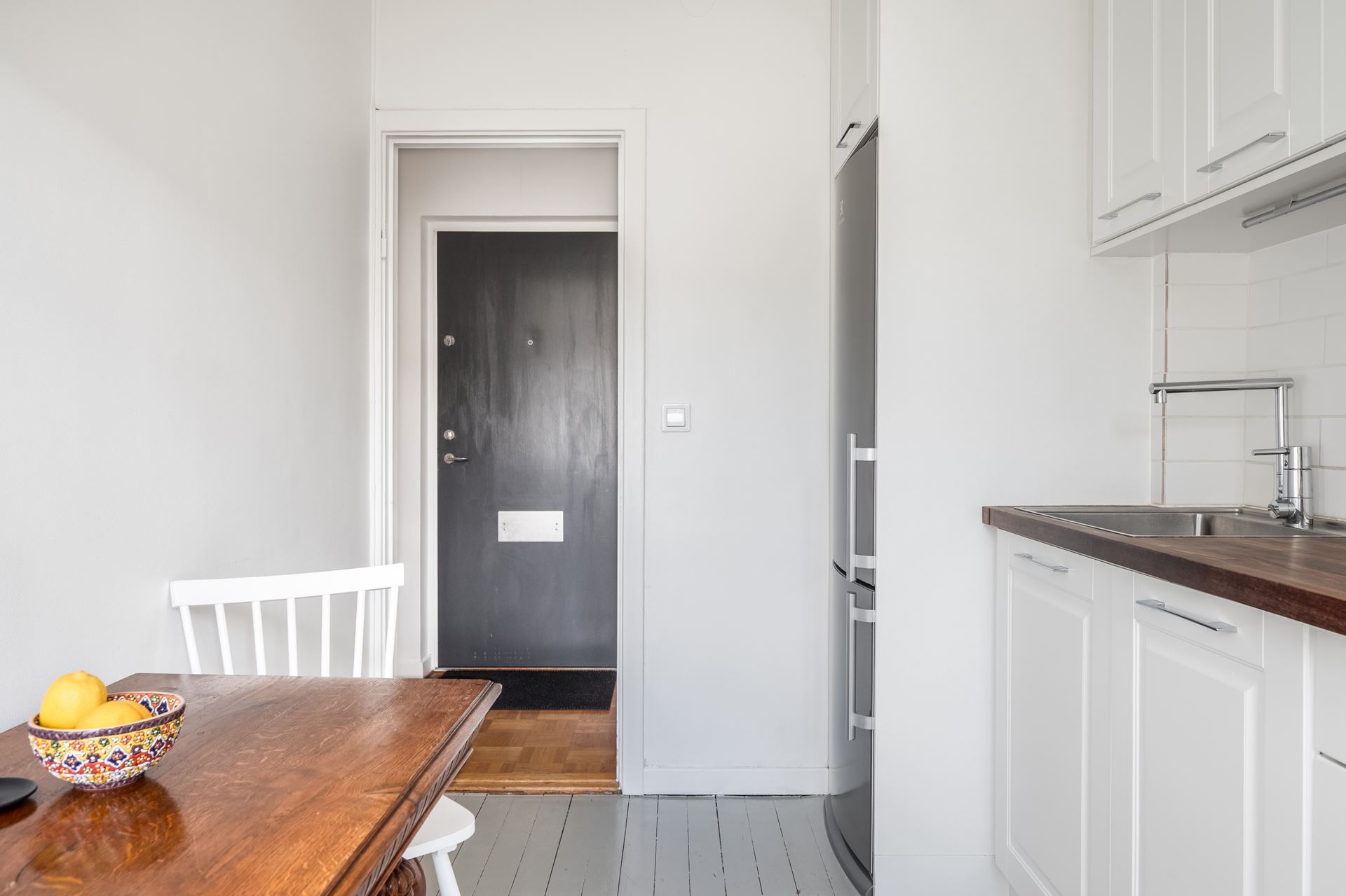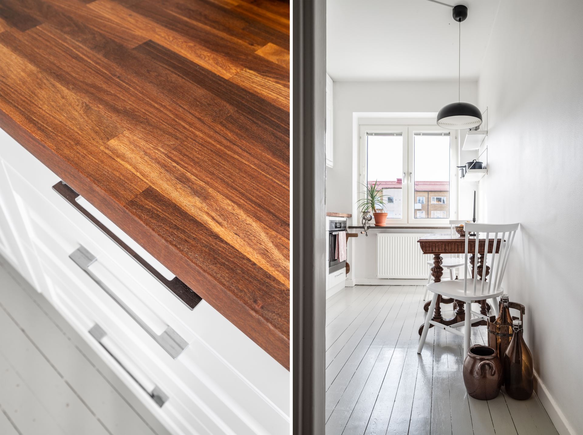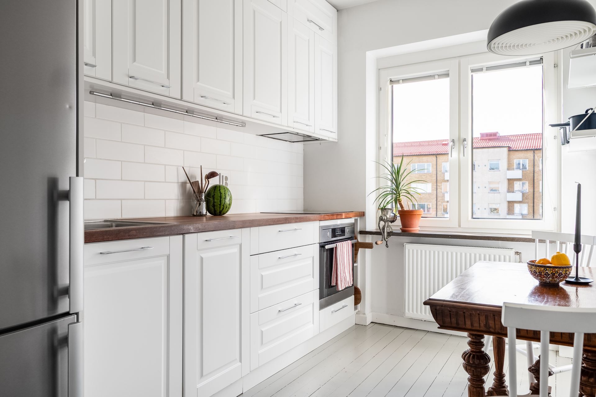 Det vita moderna köket har ljusgrått brädgolv, vita väggar och plats för matbord för trevliga middagar. Ugn, häll och fläkt finns tillsammans med integrerad diskmaskin från Siemens samt kyl och frys från Electrolux i rostfritt stål. Den nyoljade bänkskivan i trä blir en fin kombination till de vita luckorna.