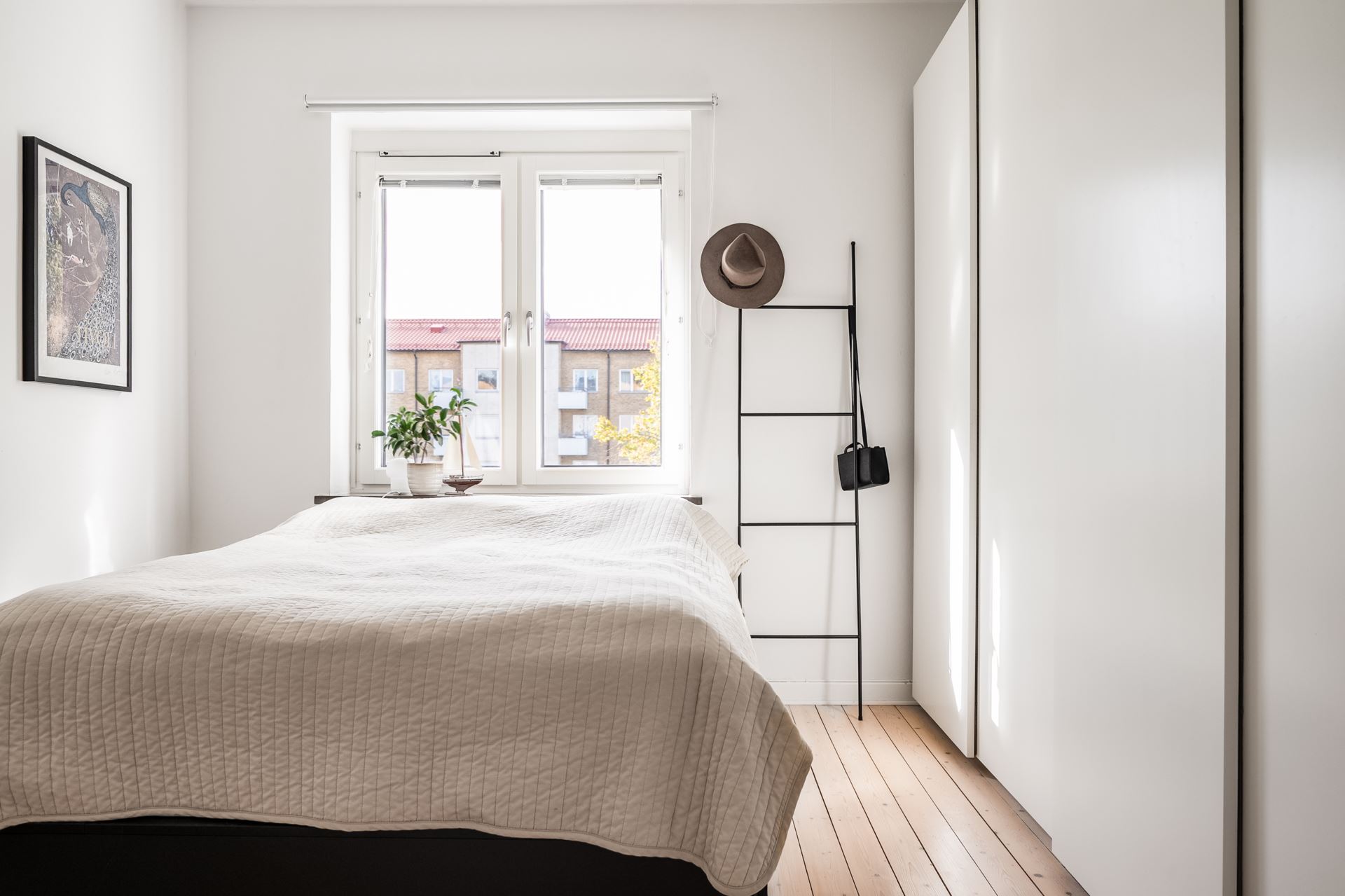 Sovrummet har vackert brädgolv och plats för dubbelsäng samt garderober. Här finns även utrymme för en liten kontorshörna, perfekt för arbete hemifrån.
