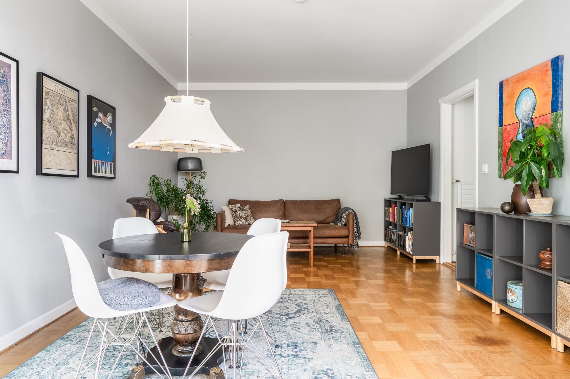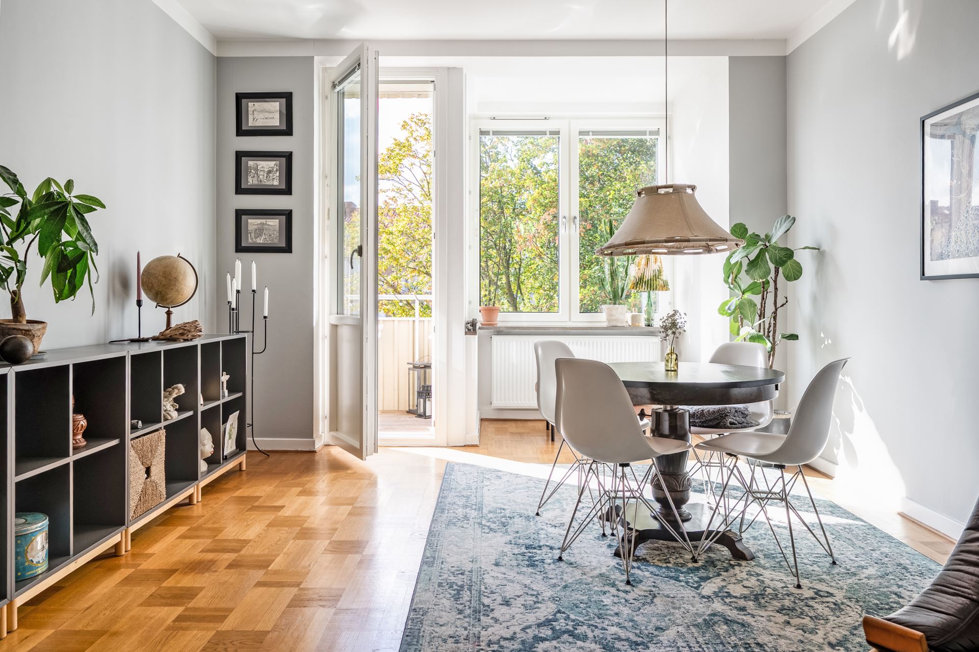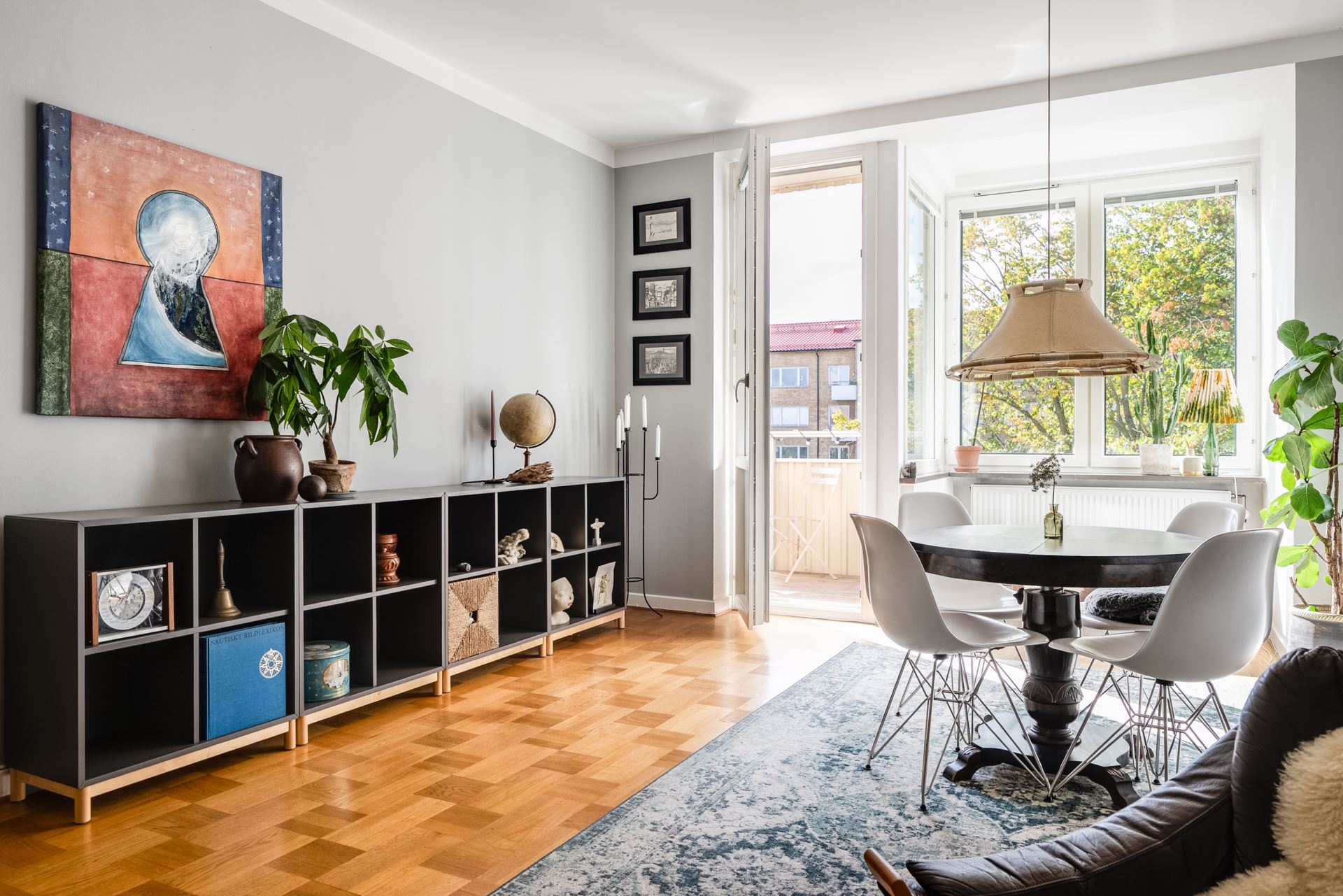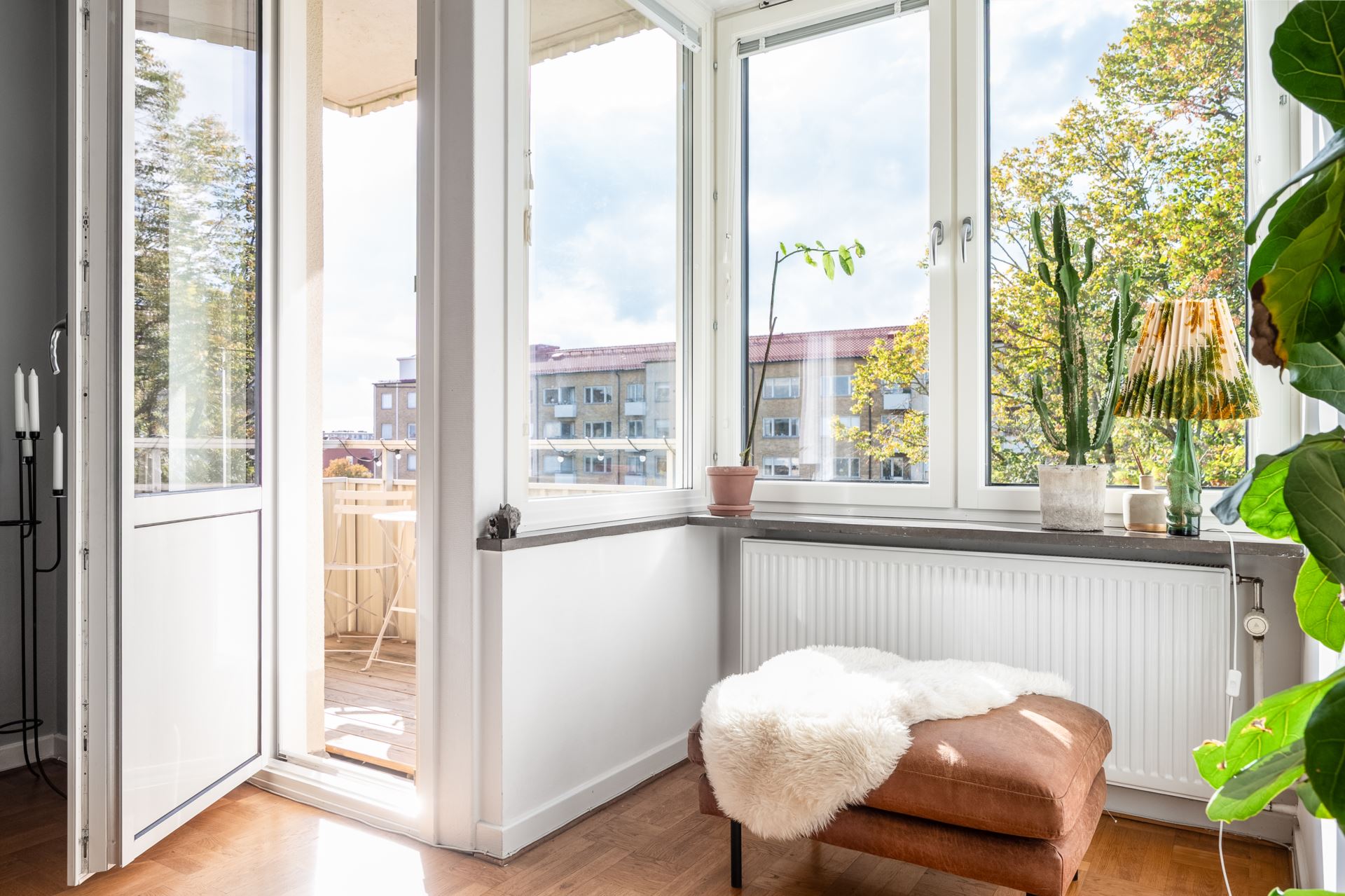 Vardagsrummet har fint golv och ljusgrå väggar som skapar ett ljust och trivsamt intryck. Här finns gott om plats för både soffgrupp och matbord, och det vackra burspråket ger rummet karaktär. Från vardagsrummet når du balkongen med västerläge och utsikt mot föreningens grönskande gård.