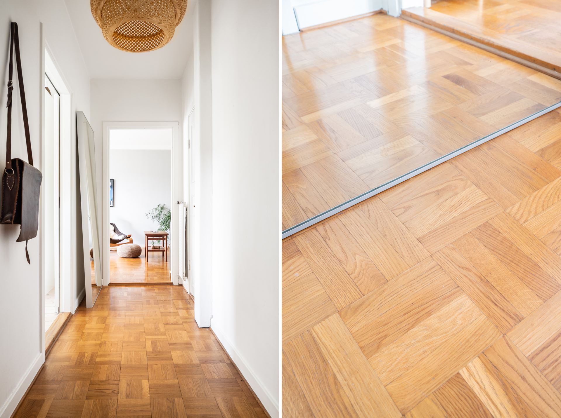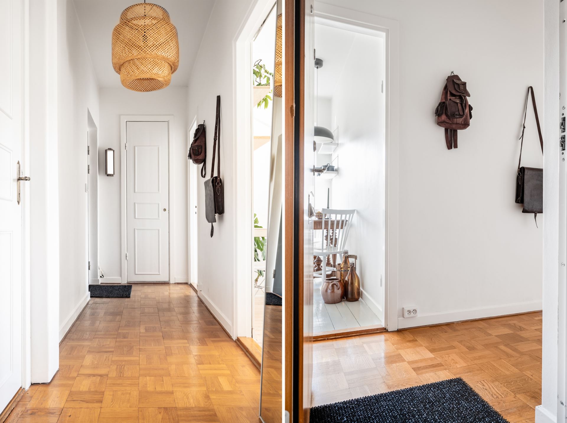 Hallen har ett fint trägolv och vita väggar som ger ett ljust och välkomnande intryck. Här finns plats för jackor och skor samt en garderob för extra förvaring.