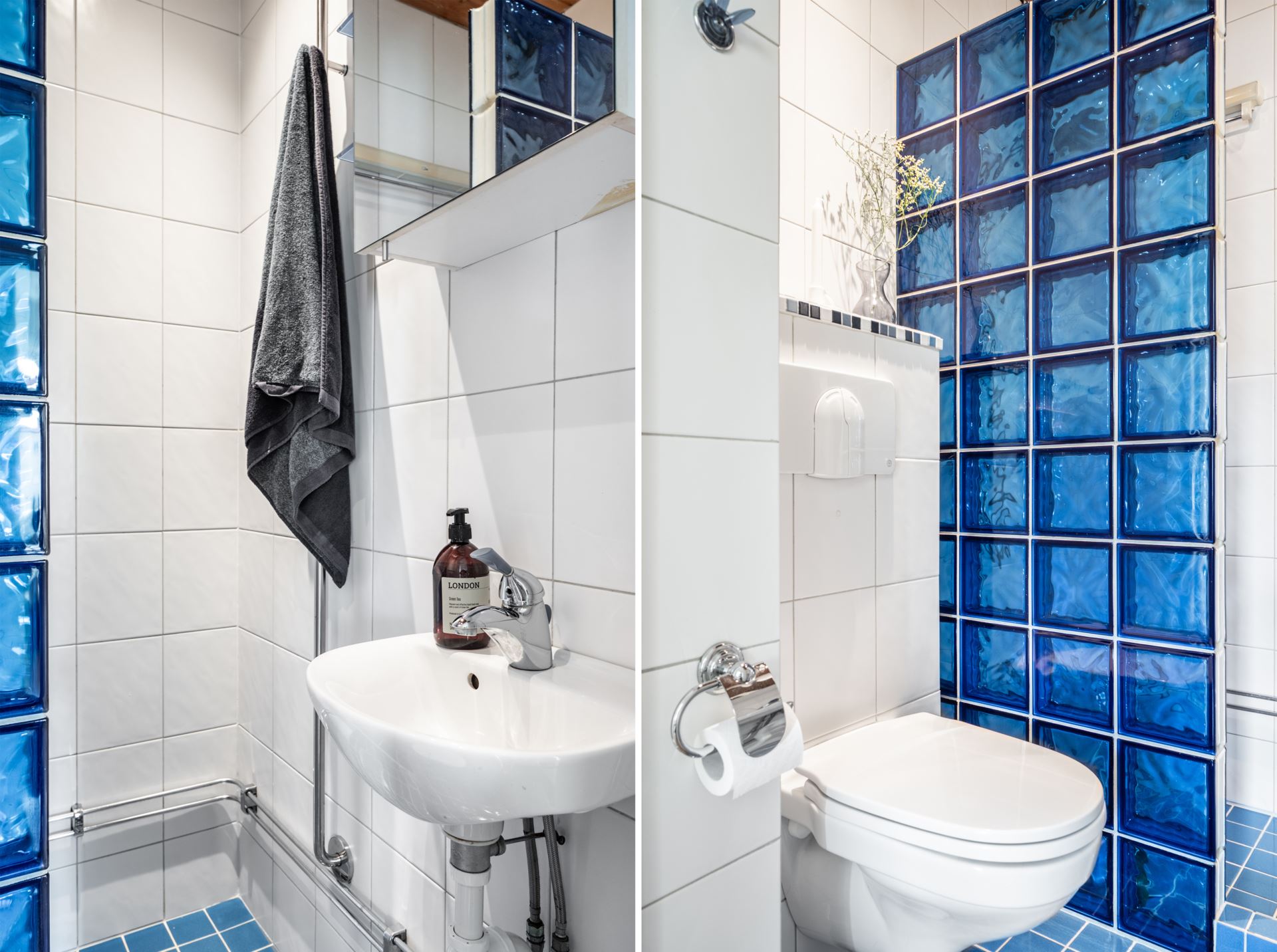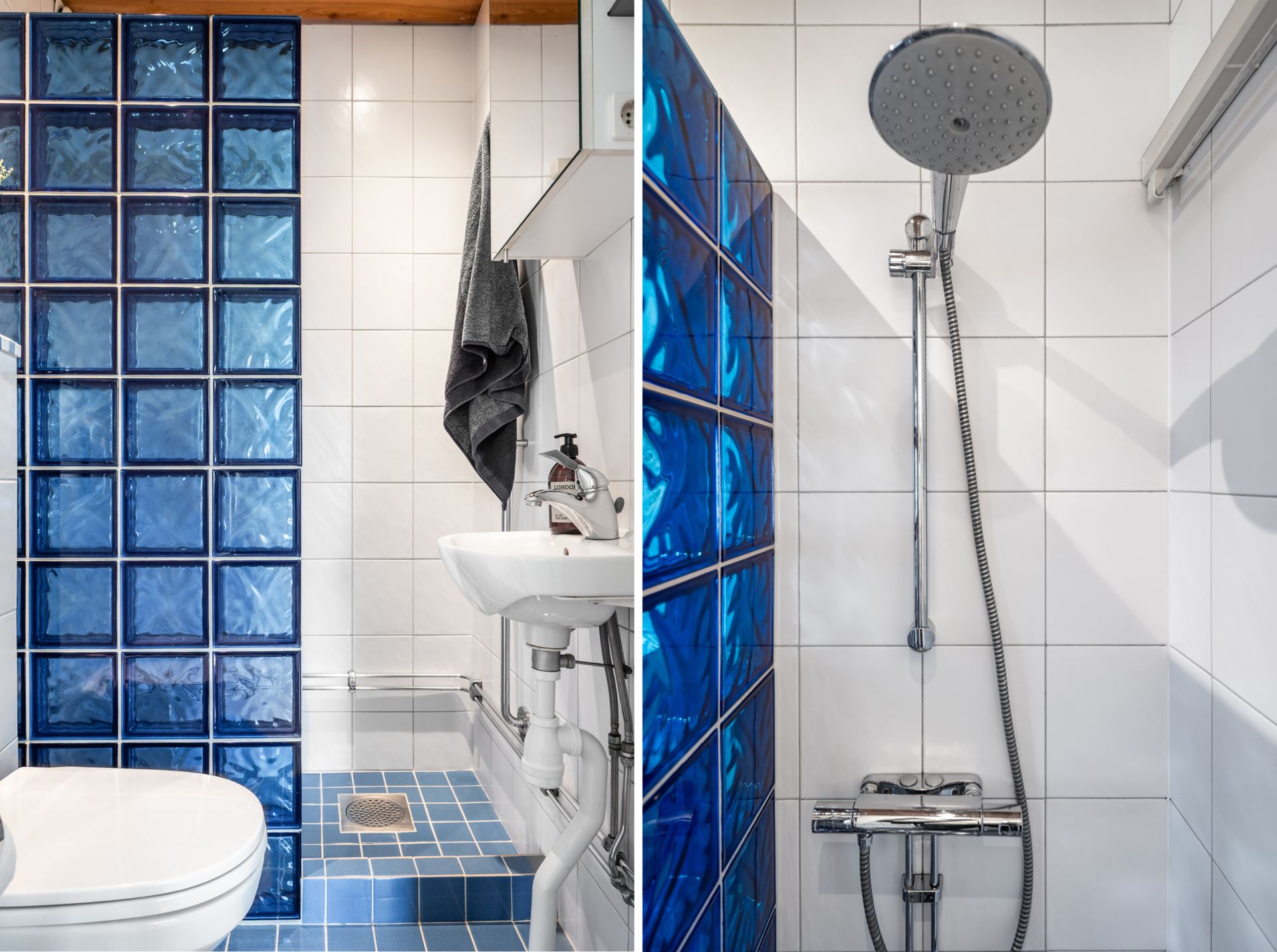 Badrummet är helkaklat i blått och vitt och utrustat med dusch, handfat, WC och spegelskåp.