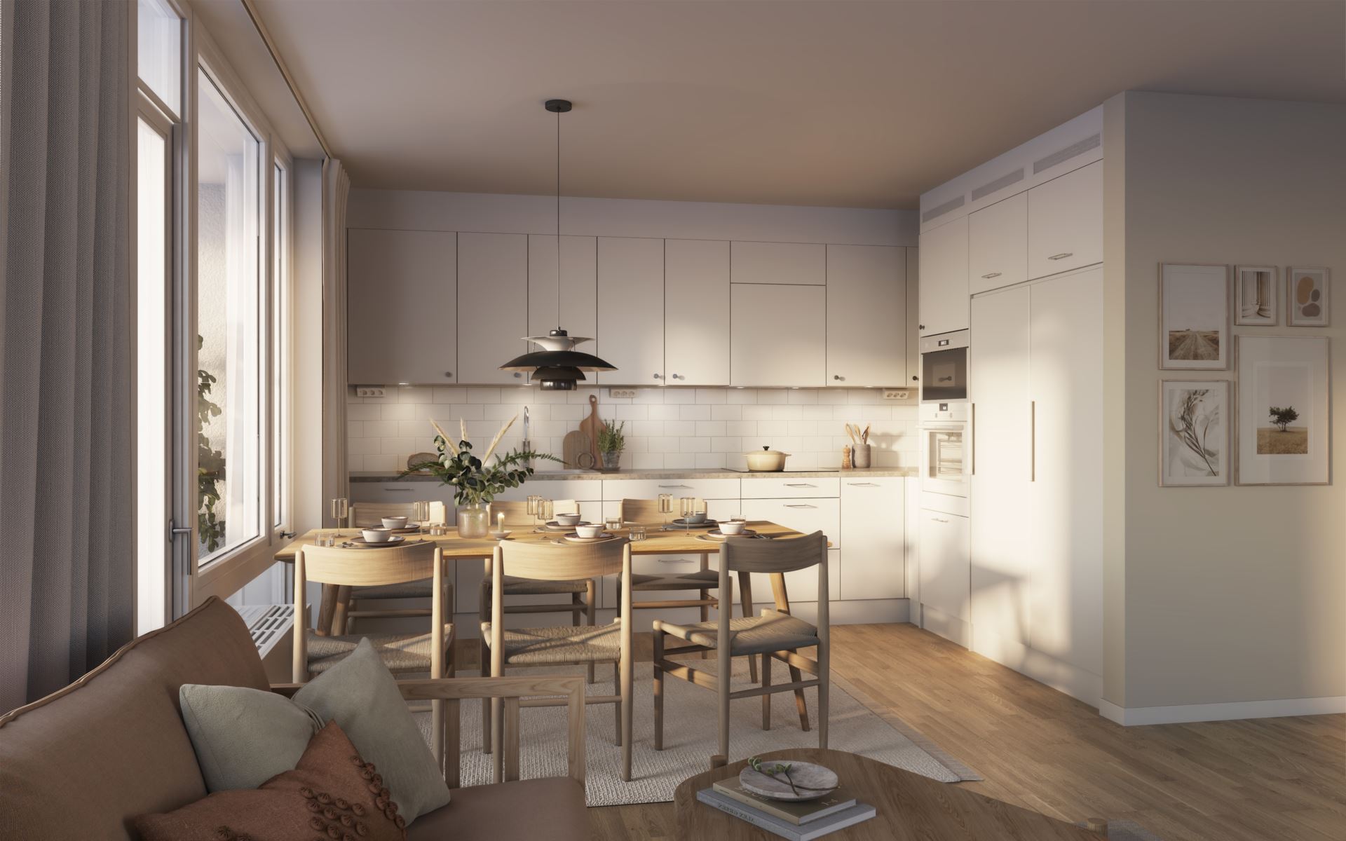 I Ängsgården erbjuds bla en stilfull trea om 79 kvm på tredje våningen med gästtoalett. Här möts du av ljusa öppna ytor mellan vardagsrum och kök, vilket gör den perfekt för både vardag och sociala middagar. Från det rymliga vardagsrummet når du två balkonger i olika väderstreck, en lite mindre balkong mot norr samt en generös balkongen i söder på 10 kvm.