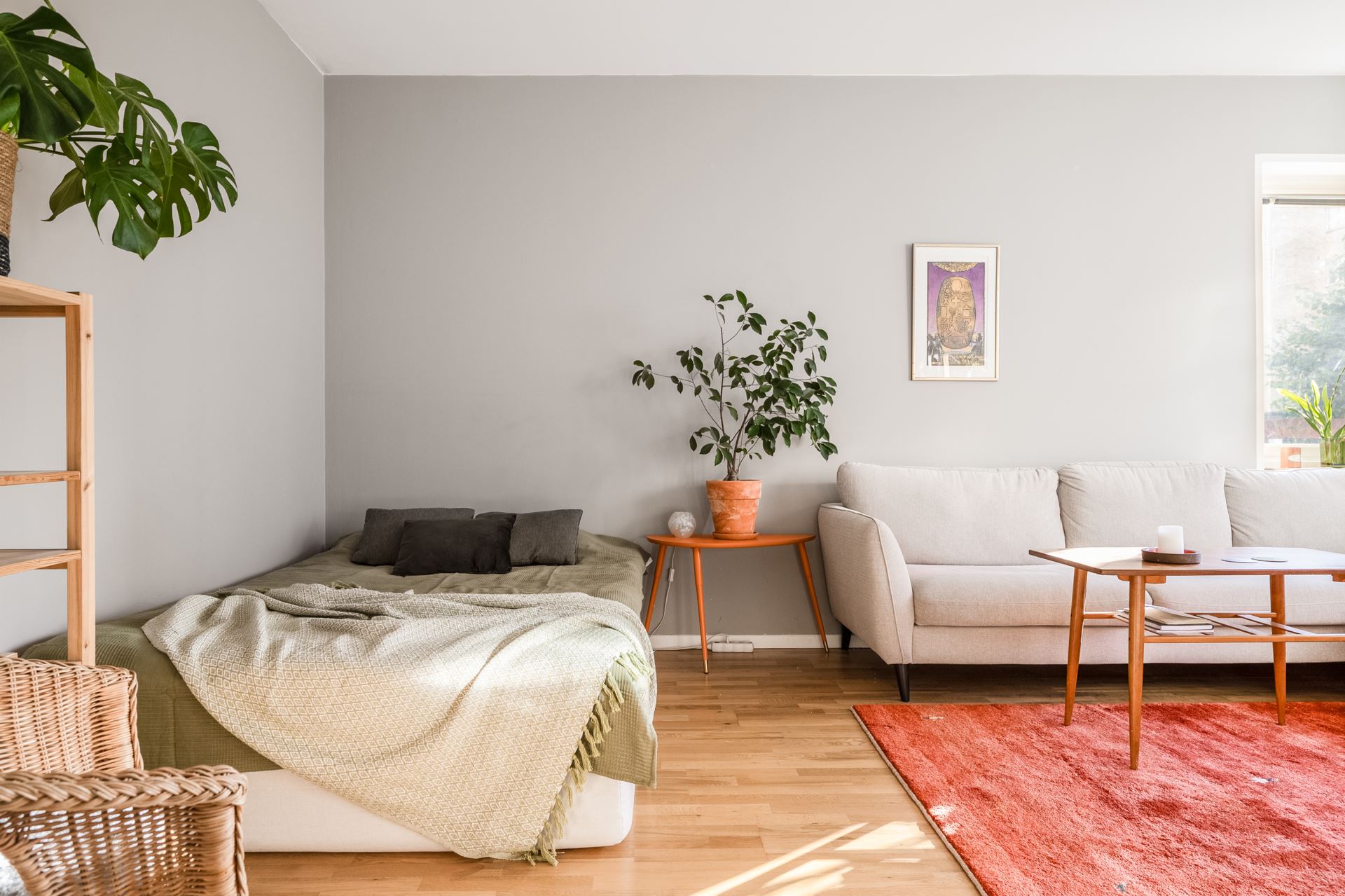 Rymligt och ljust vardagsrum med stora fönsterpartier samt access till en generös balkong i västerläge. Plats till en större soffgrupp, säng, matbord och mer utöver det om så önskas. På golvet vilar snyggt parkettgolv som enhetligt återfinns i resten av hemmet och väggarna är målade i ljusare nyans.