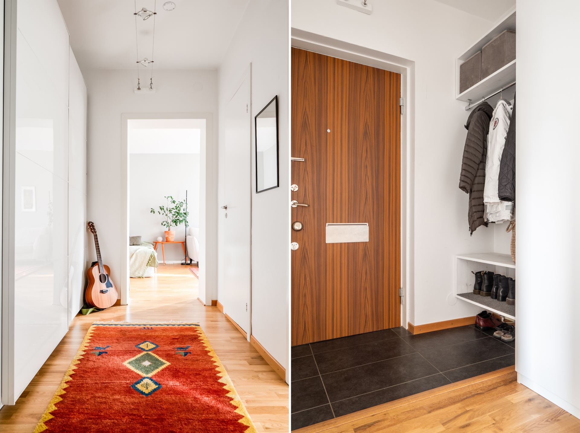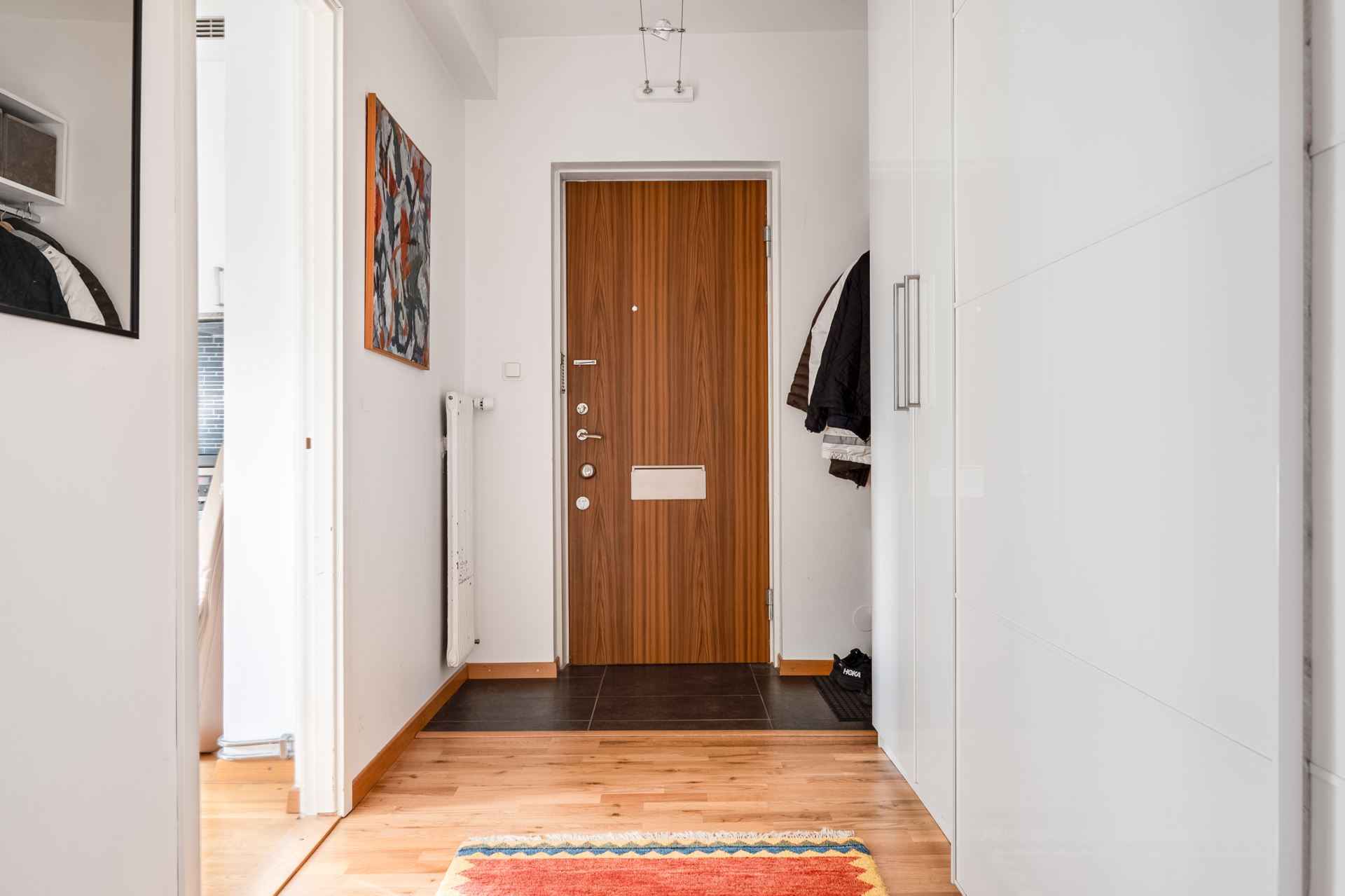 Välkommande hall med praktiskt klinkergolv som övergår i parkett. En hel vägg med garderober svarar för optimal förvaring av klädesplagg med mera.