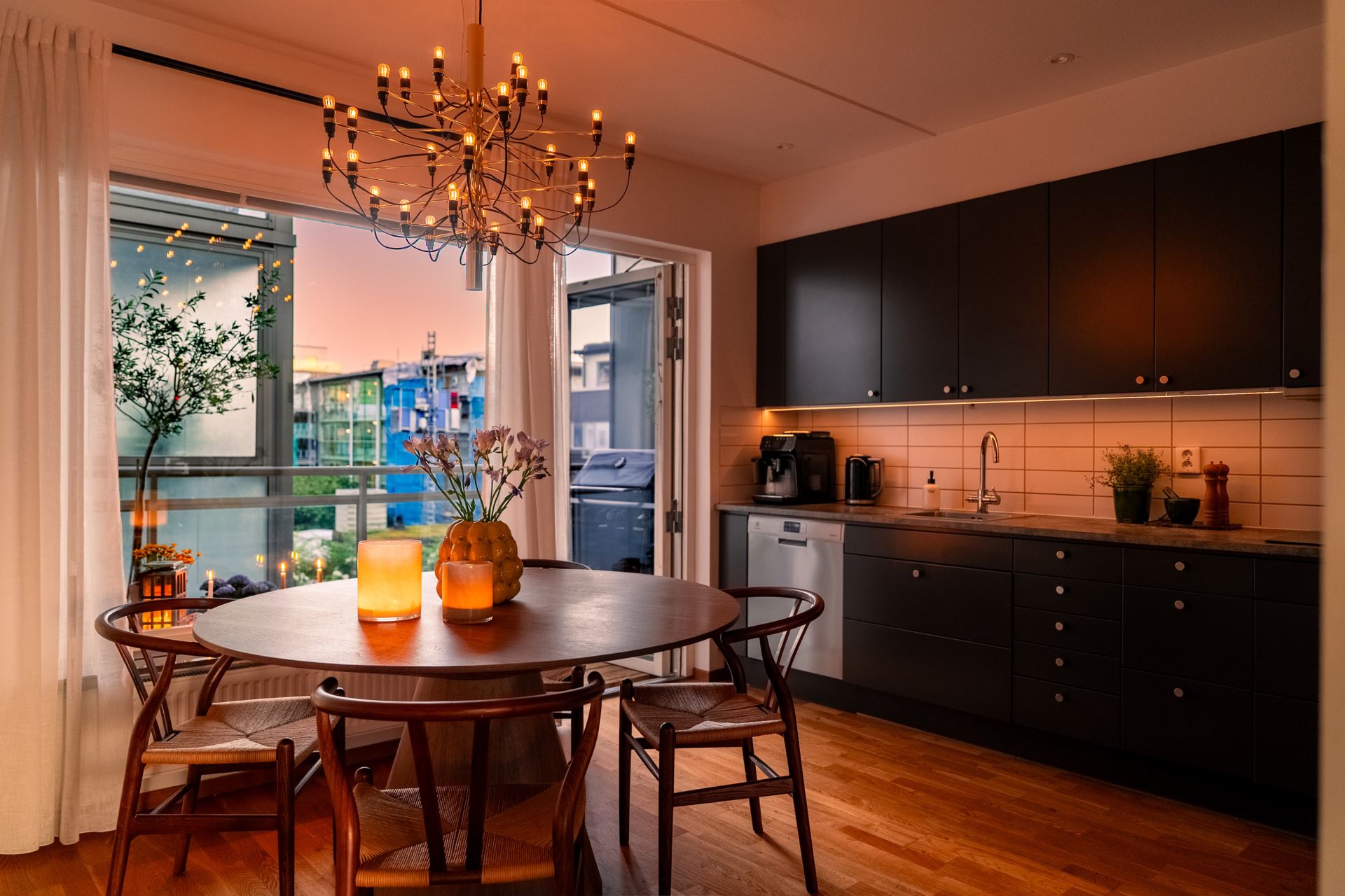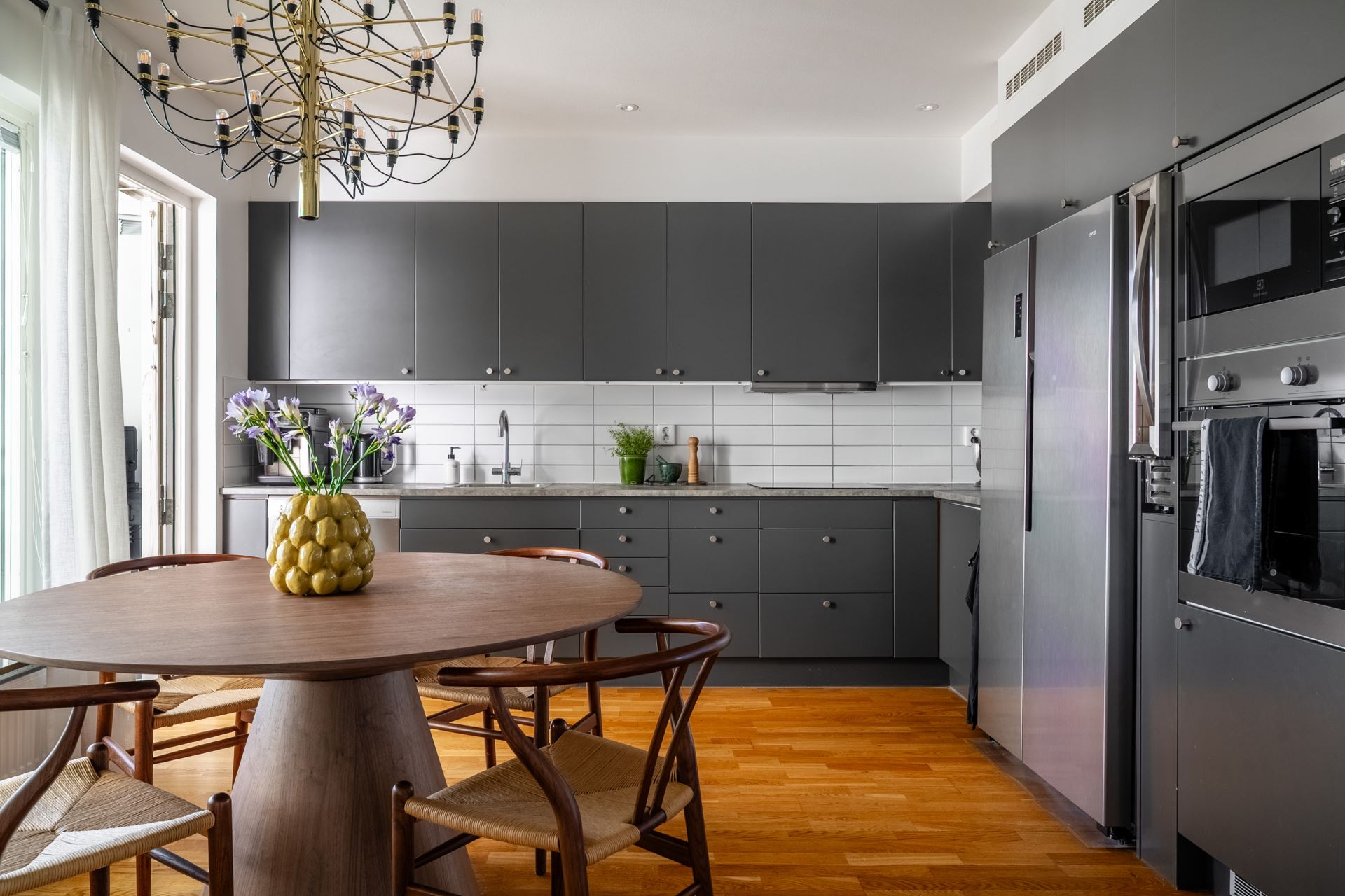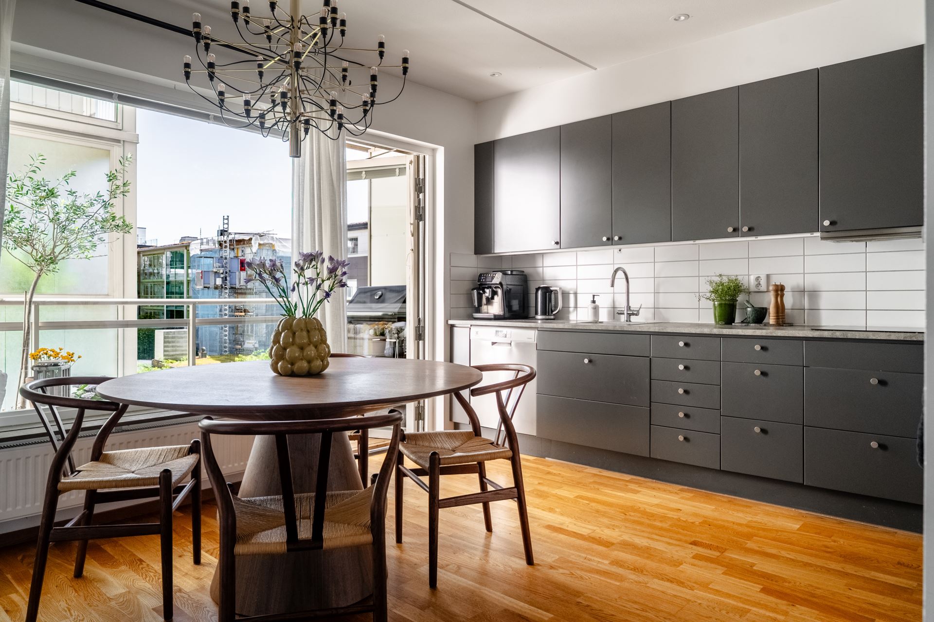 Till vänster når vi det stilrena köket från Ballingslöv, som erbjuder god arbetsyta och förvaring bakom gråa skåpluckor som samspelar fint med den gråmelerade bänkskivan i laminat och det vita kaklet ovanför. Den maskinella utrustningen består av kyl och frys i fullhöjd, inbyggd ugn och mikrovågsugn, induktionshäll, vinkyl samt diskmaskin. På golvet ligger parkett och väggarna är ljusa. Här finns plats för ett matbord, och de stora fönstren ger ett fint ljusinsläpp. Från köket når man även bostadens ena balkong, med utsikt över innergården och Turning Torso.
