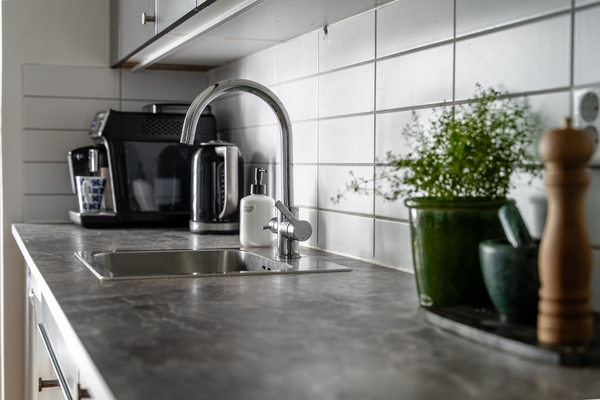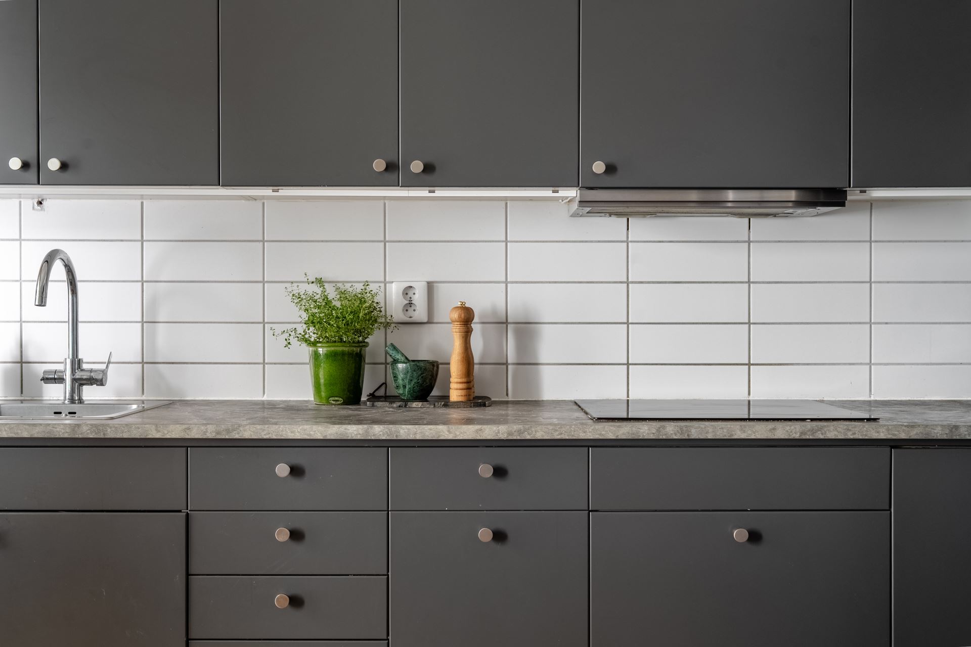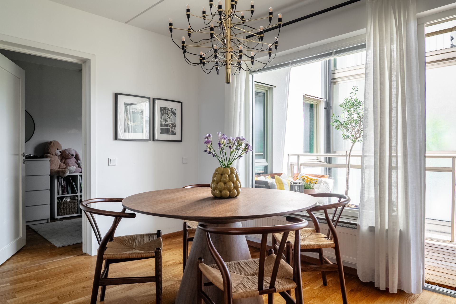 Till vänster når vi det stilrena köket från Ballingslöv, som erbjuder god arbetsyta och förvaring bakom gråa skåpluckor som samspelar fint med den gråmelerade bänkskivan i laminat och det vita kaklet ovanför. Den maskinella utrustningen består av kyl och frys i fullhöjd, inbyggd ugn och mikrovågsugn, induktionshäll, vinkyl samt diskmaskin. På golvet ligger parkett och väggarna är ljusa. Här finns plats för ett matbord, och de stora fönstren ger ett fint ljusinsläpp. Från köket når man även bostadens ena balkong, med utsikt över innergården och Turning Torso.