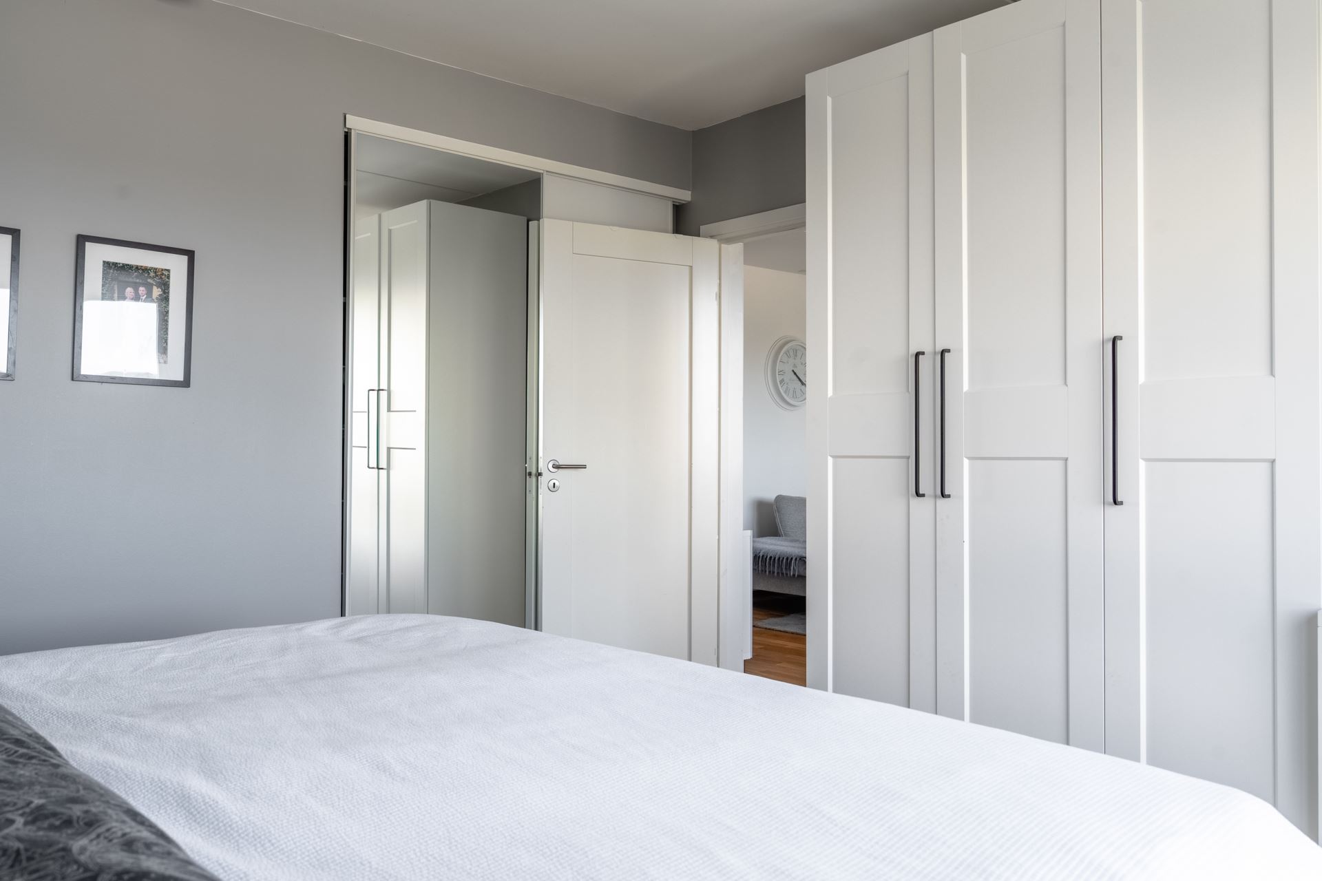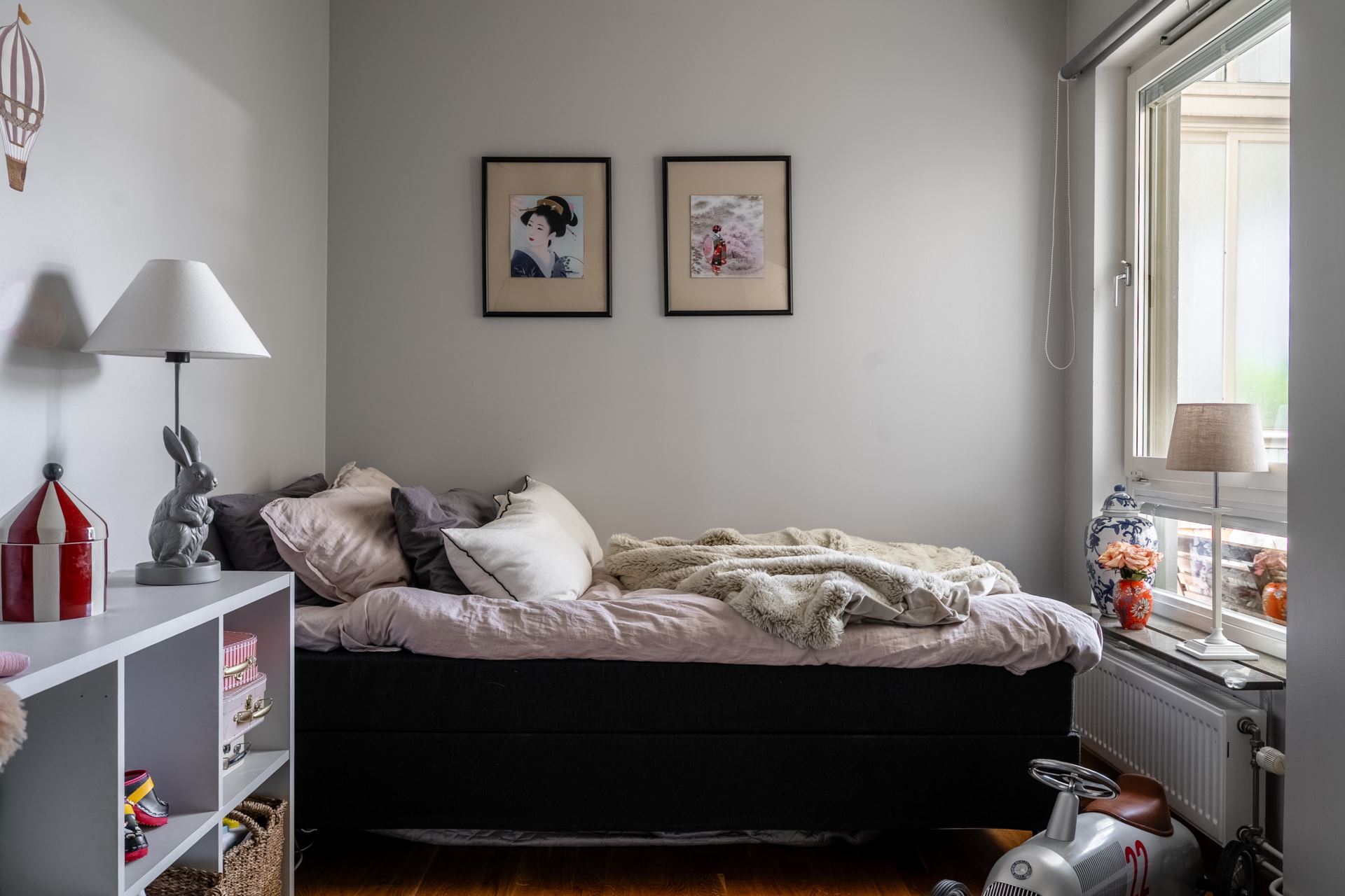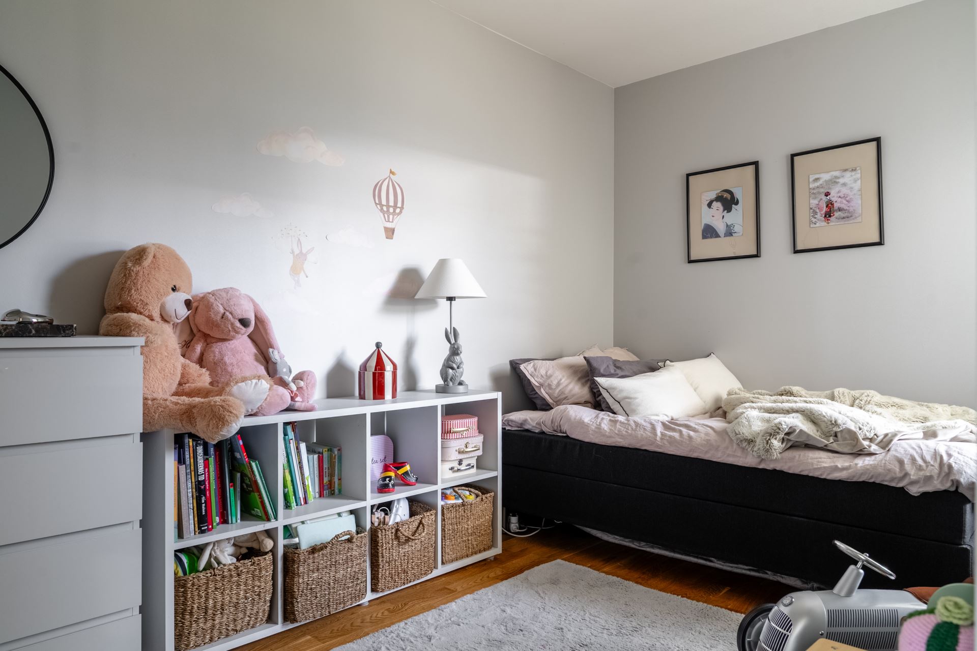 Sovrummet som nås från köket är i bra storlek och passar perfekt som barnrum, gästrum eller kontor. Även här ligger parkett på golvet och väggarna är ljusa. I anslutning till rummet finns en praktisk klädkammare med gott om förvaringsmöjligheter.