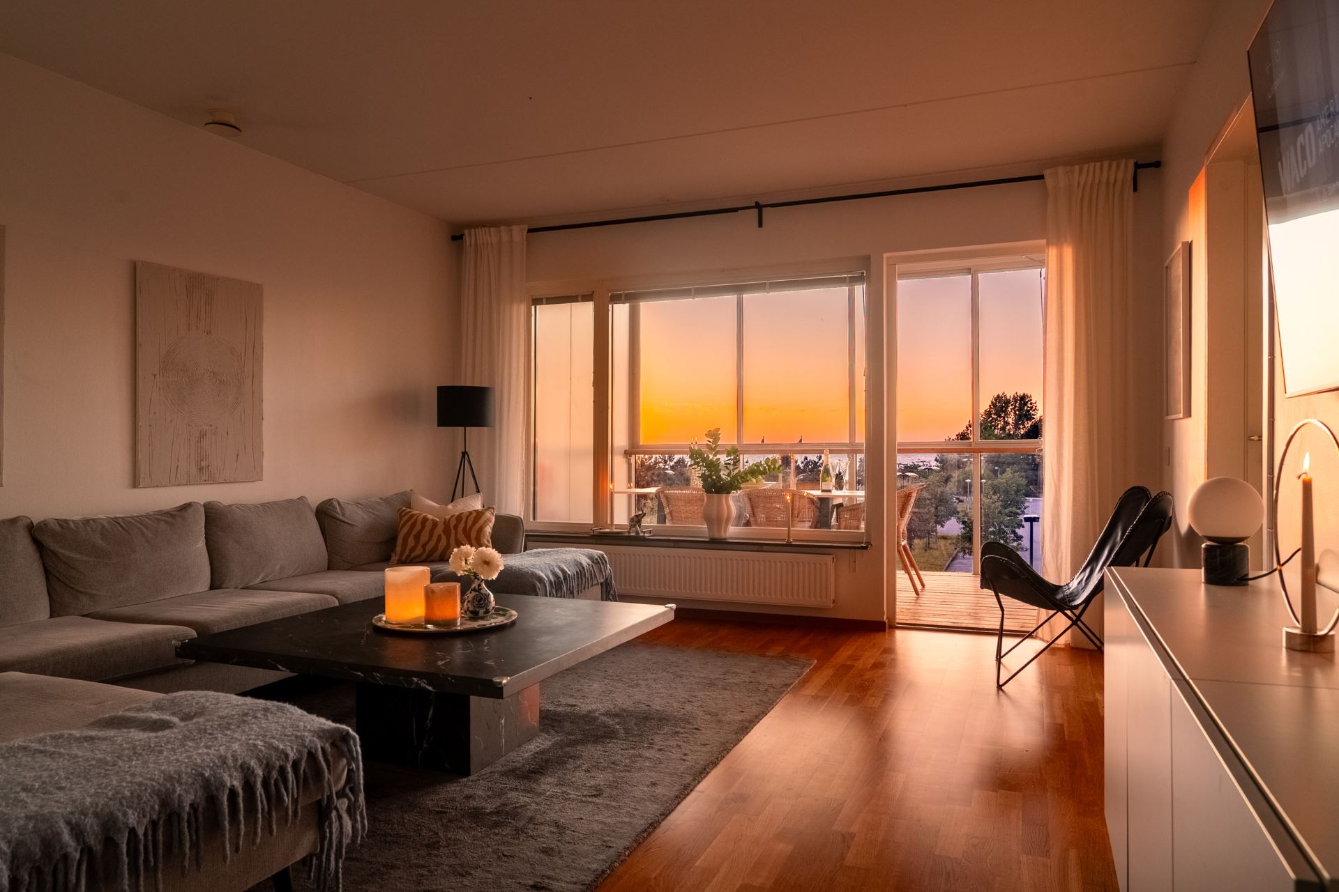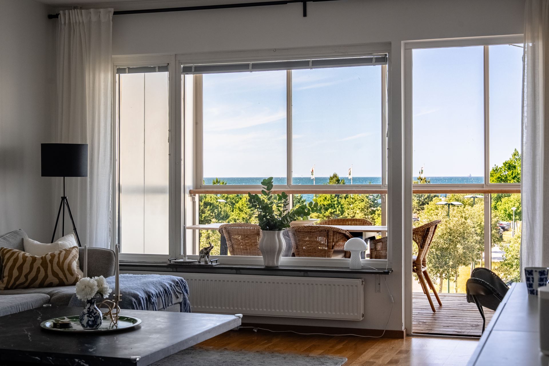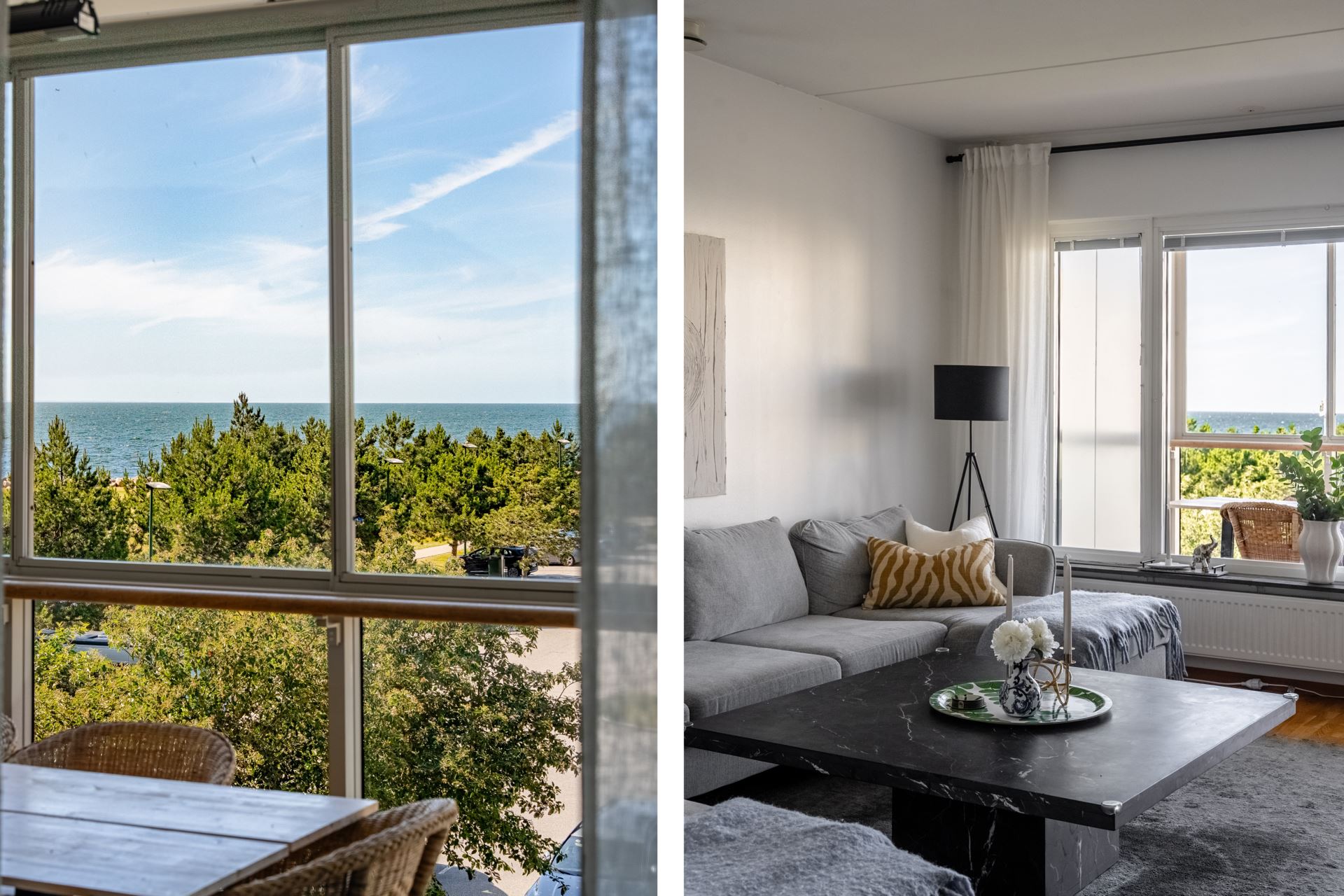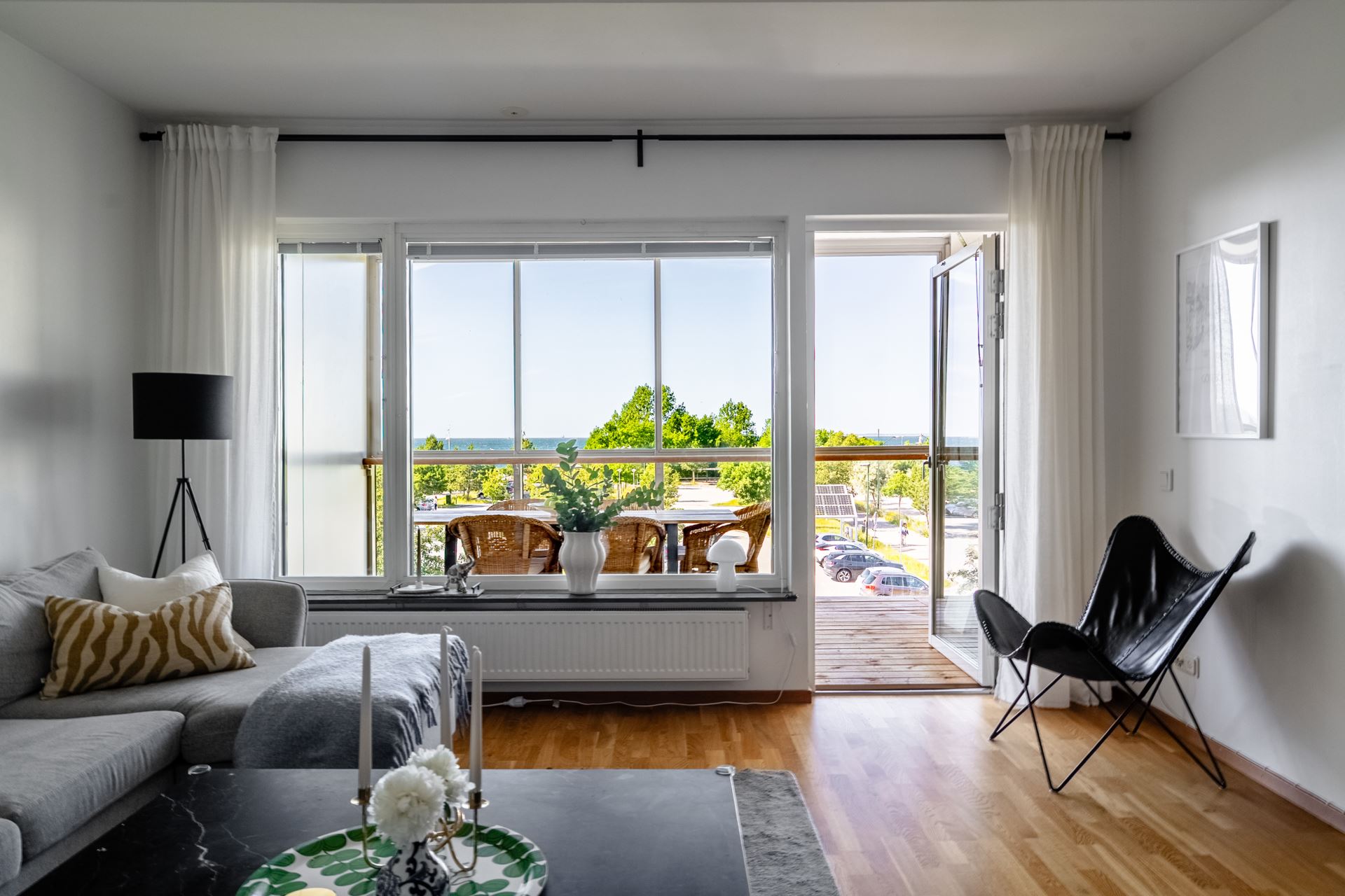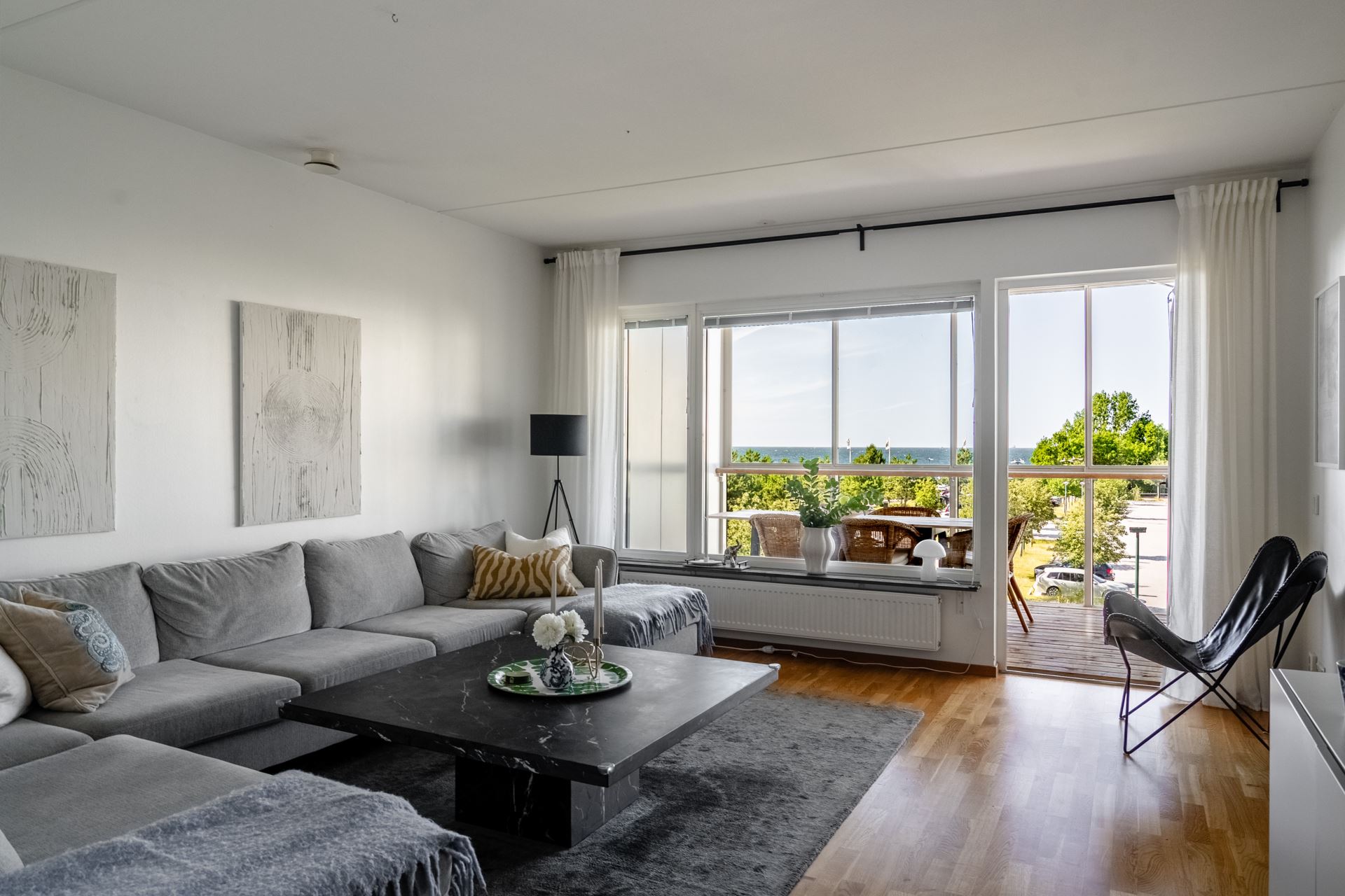 Vardagsrummet imponerar med sin underbara utsikt över havet och grönskan. Här finns plats för en bekväm soffa med tillhörande möbler. Parkett pryder golvet och väggarna är ljusa. Stora fönsterpartier och en balkongdörr leder ut till bostadens andra balkong som bjuder på en härlig utsikt. Här finns utrymme för matbord, loungegrupp eller vad som önskas, en perfekt plats att njuta av en ljuvlig solnedgång.