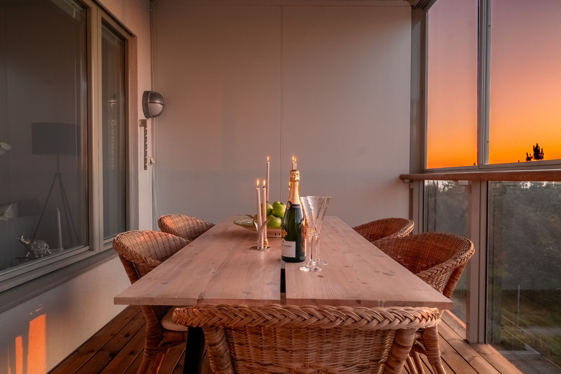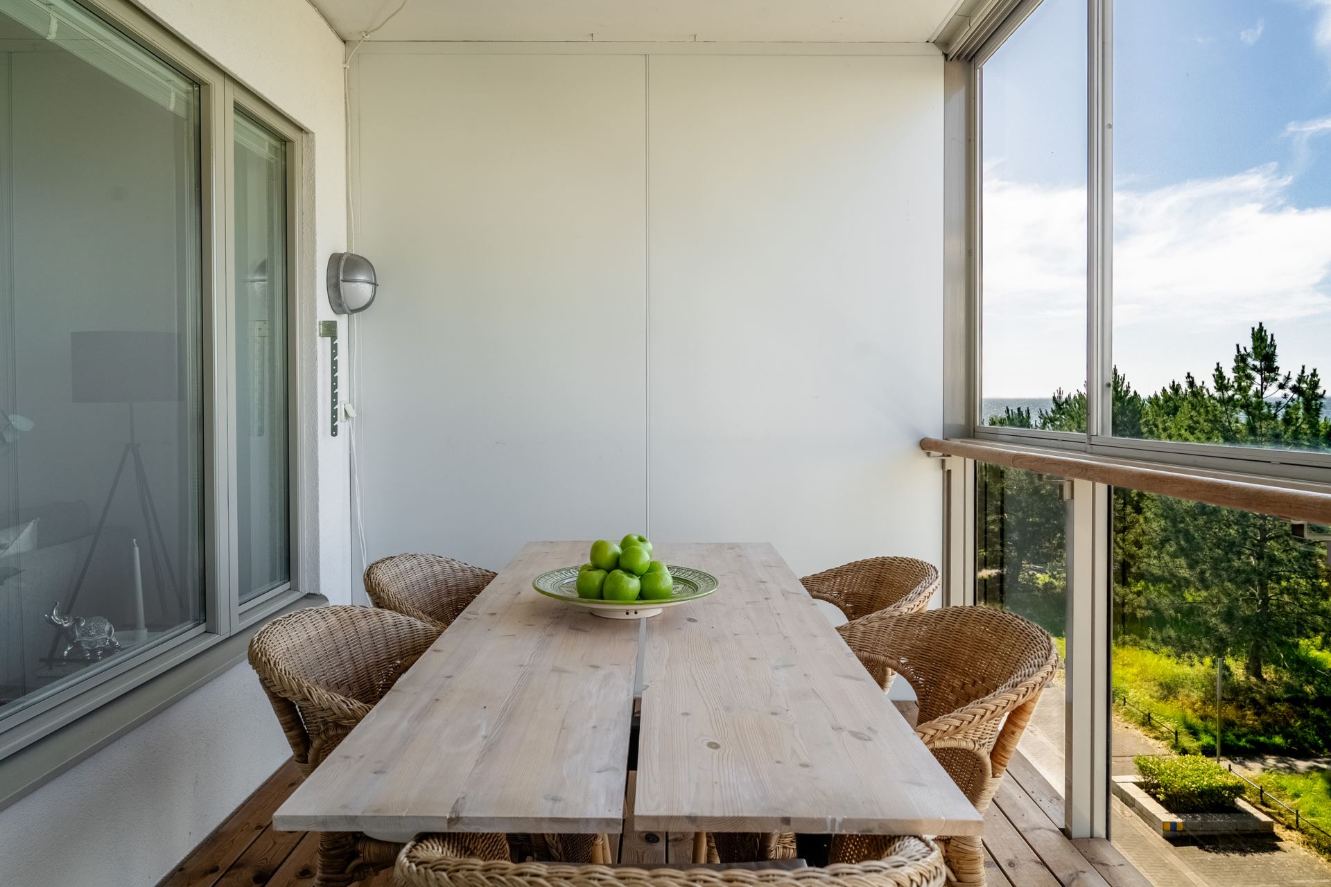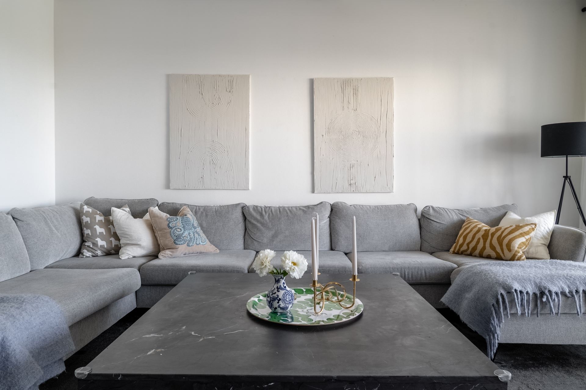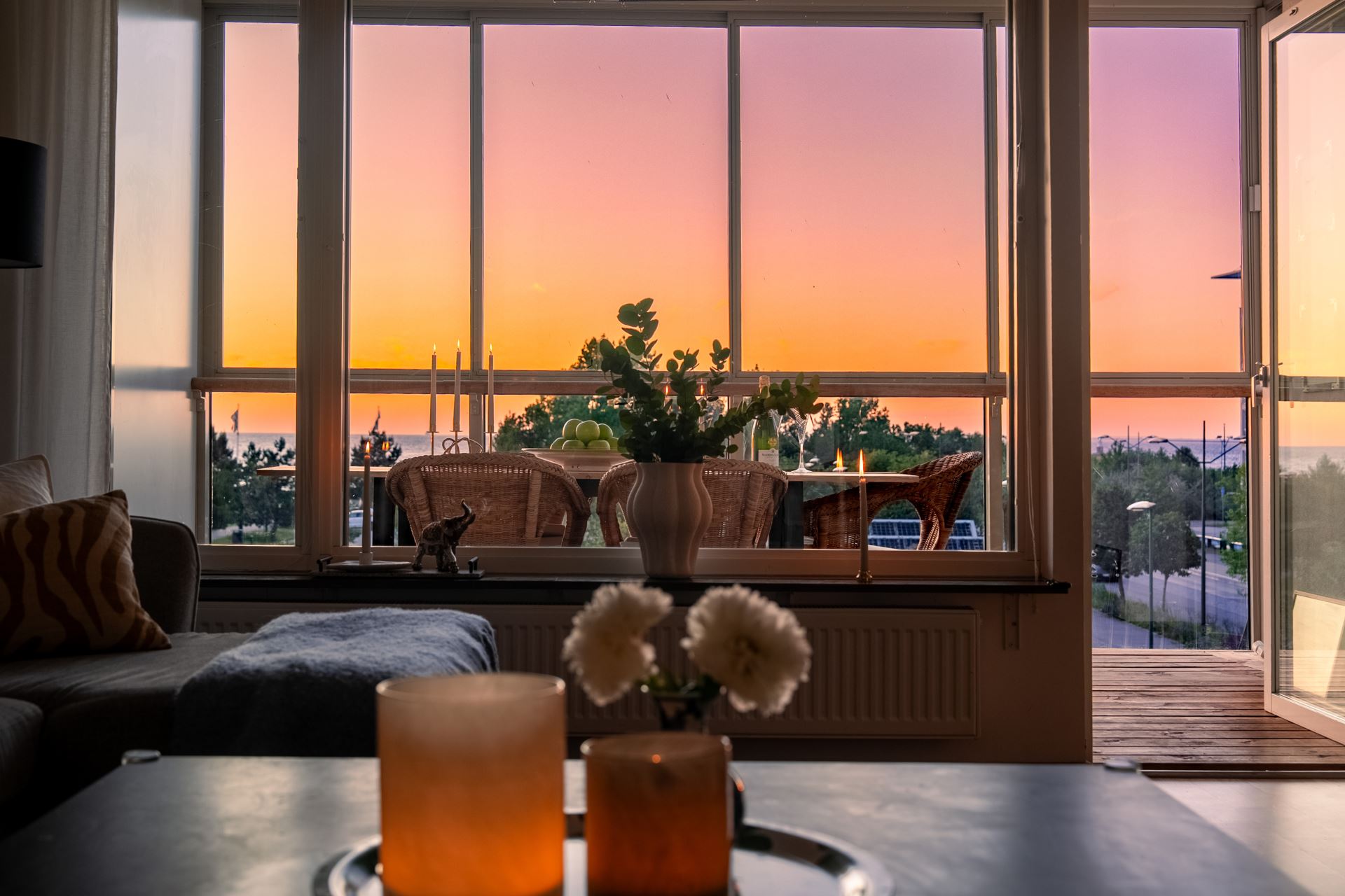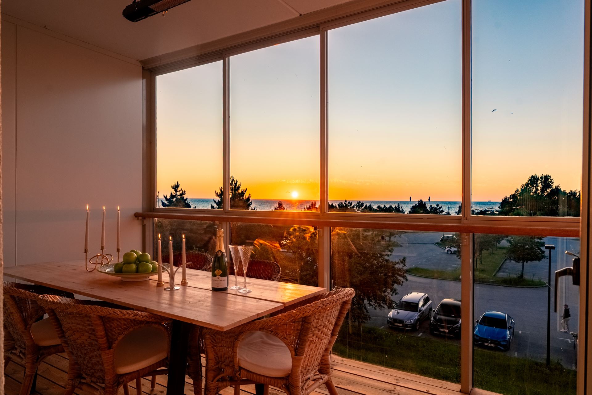 Vardagsrummet imponerar med sin underbara utsikt över havet och grönskan. Här finns plats för en bekväm soffa med tillhörande möbler. Parkett pryder golvet och väggarna är ljusa. Stora fönsterpartier och en balkongdörr leder ut till bostadens andra balkong som bjuder på en härlig utsikt. Här finns utrymme för matbord, loungegrupp eller vad som önskas, en perfekt plats att njuta av en ljuvlig solnedgång.