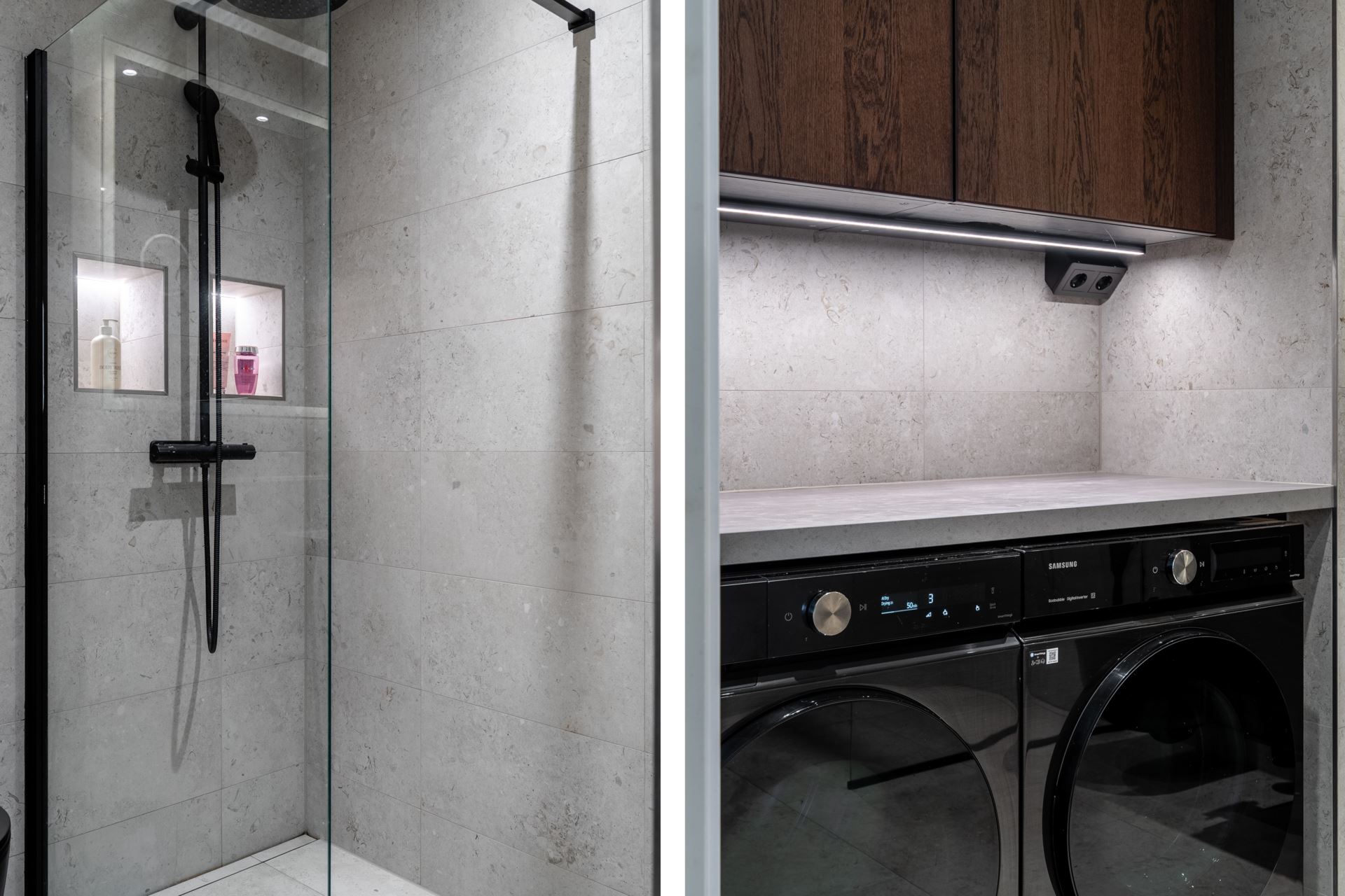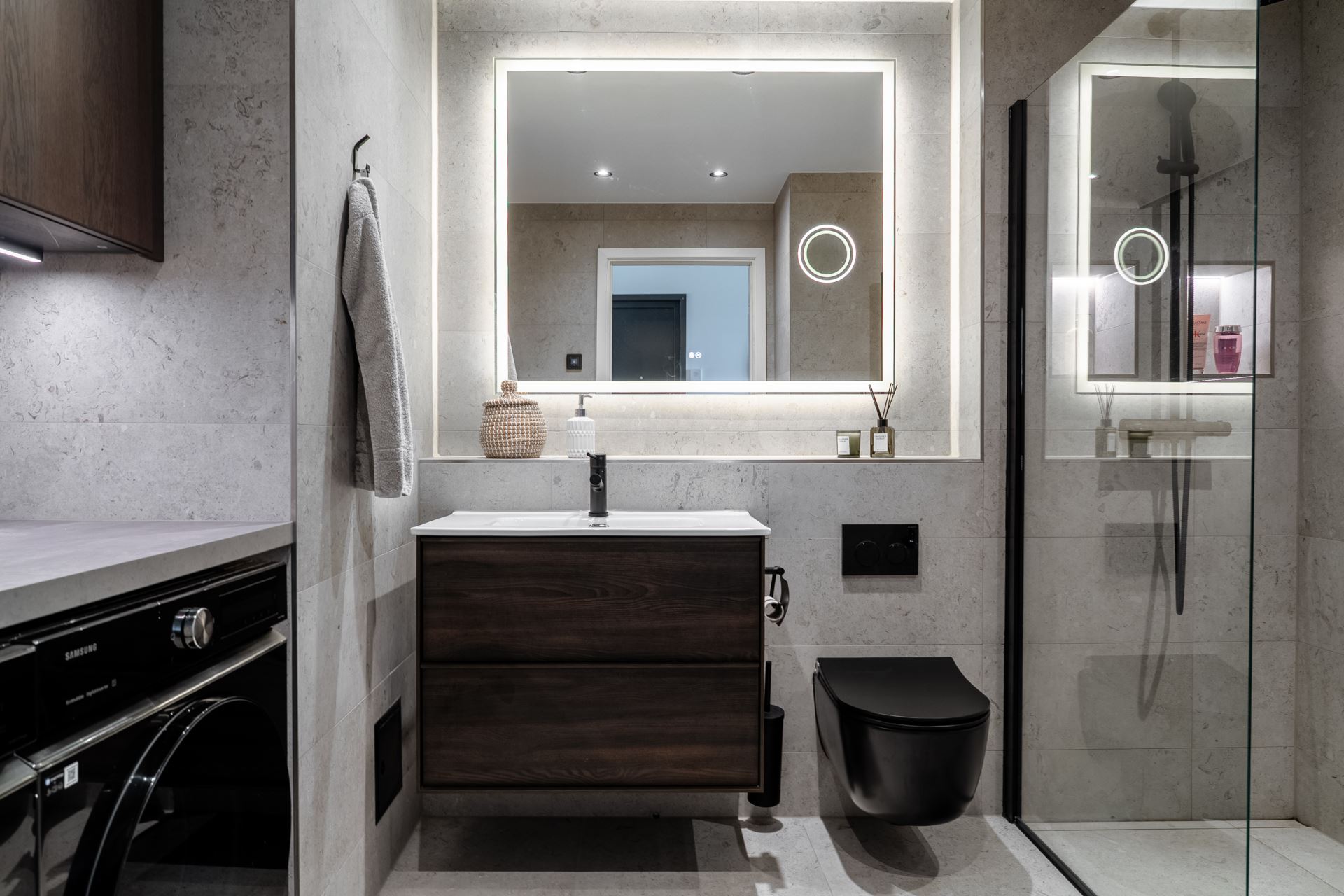 Det helkaklade badrummet, renoverat 2025, har matchande klinkergolv och väggkakel. Rummet är utrustat med vägghängd wc, handfat med kommod i valnöt, samt spegel med integrerad belysning och inbyggd sminkspegel. Duschhörnan har vattenfallsdusch och dold golvbrunn. Här finns även tvättmaskin och torktumlare (Samsung) med arbetsyta och förvaringsskåp ovanför i valnöt. En handdukstork med plats för flera handdukar, utrustad med elpatron och digital termostat, bidrar till både komfort och stil. Badrummet har dessutom golvvärme förlagd över hela golvet, förutom under tvättmaskin och torktumlare, även denna med digital termostat och WiFi-modul för schemaläggning. Stilrena detaljer såsom inbyggda hyllor, avlastningsytor och infällda spotlights i taket förhöjer känslan.