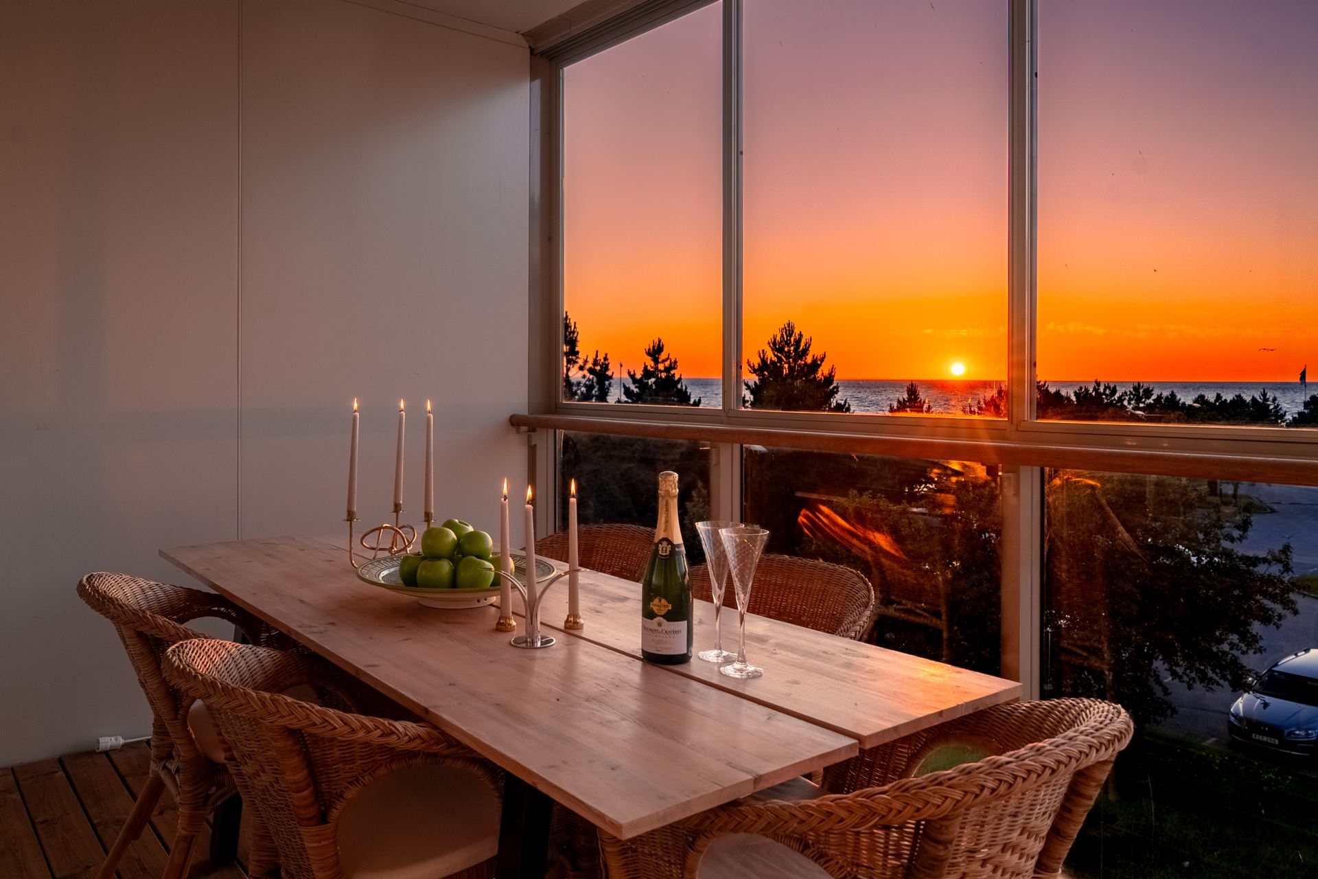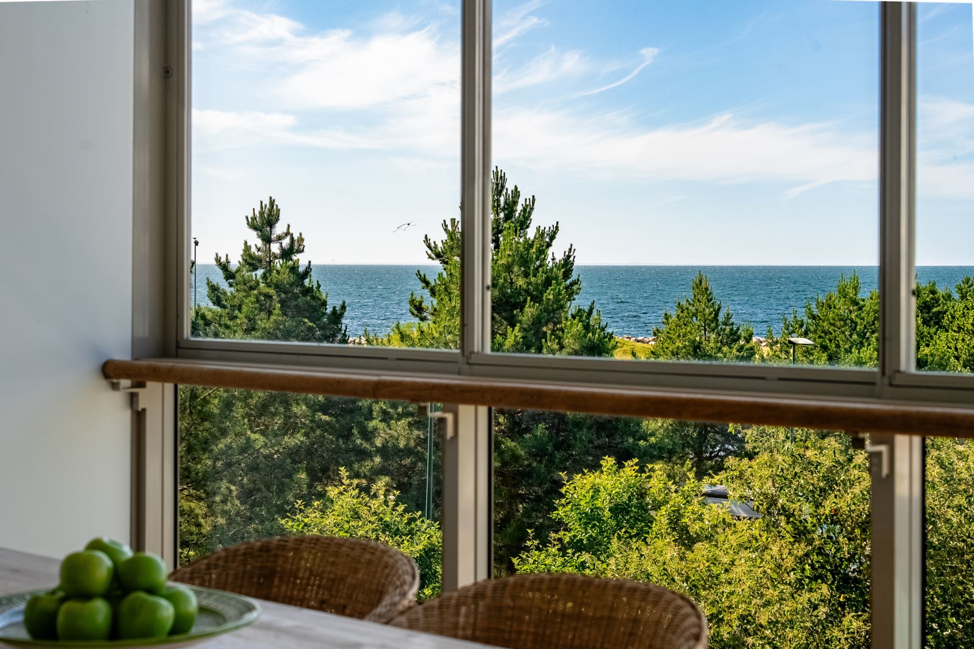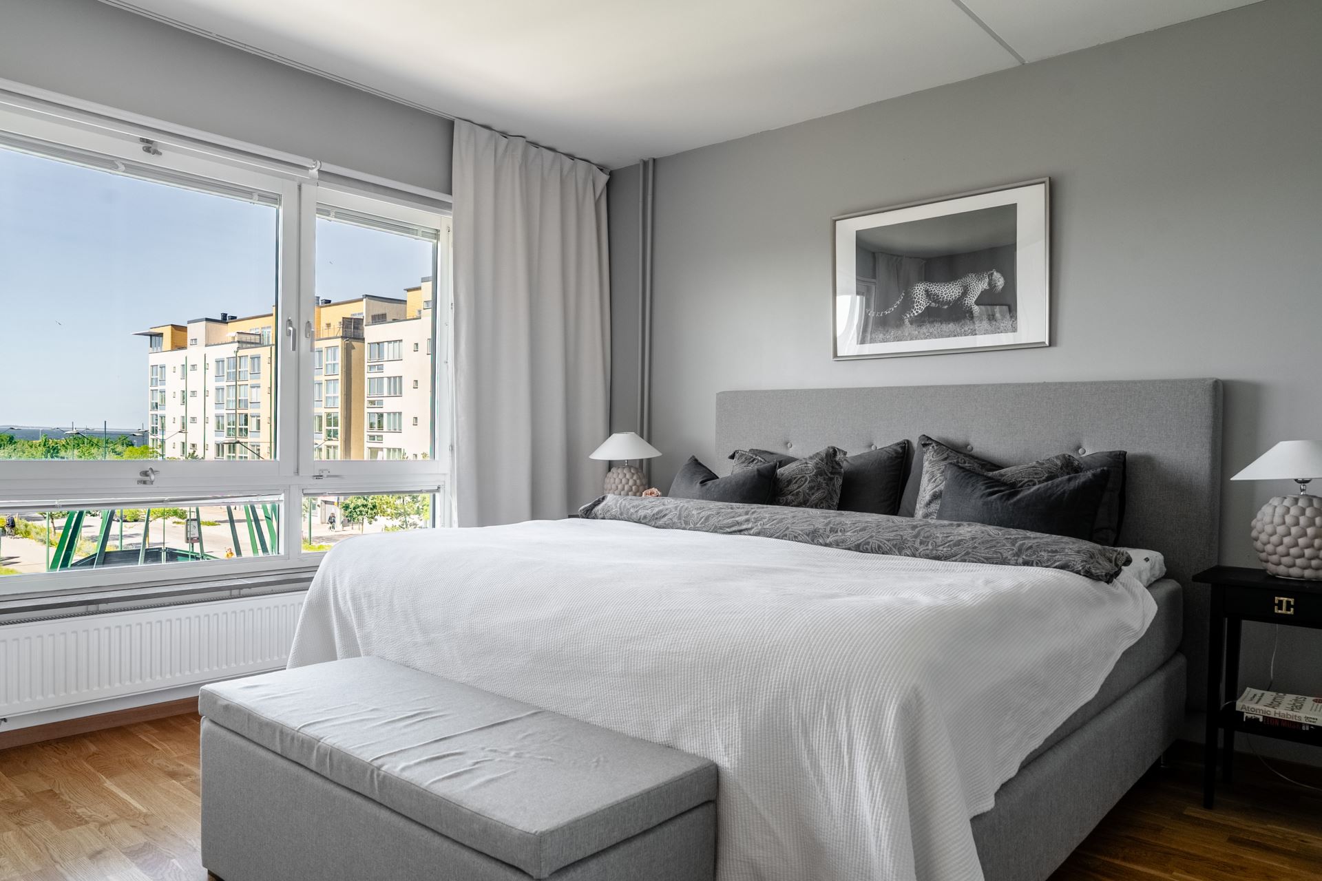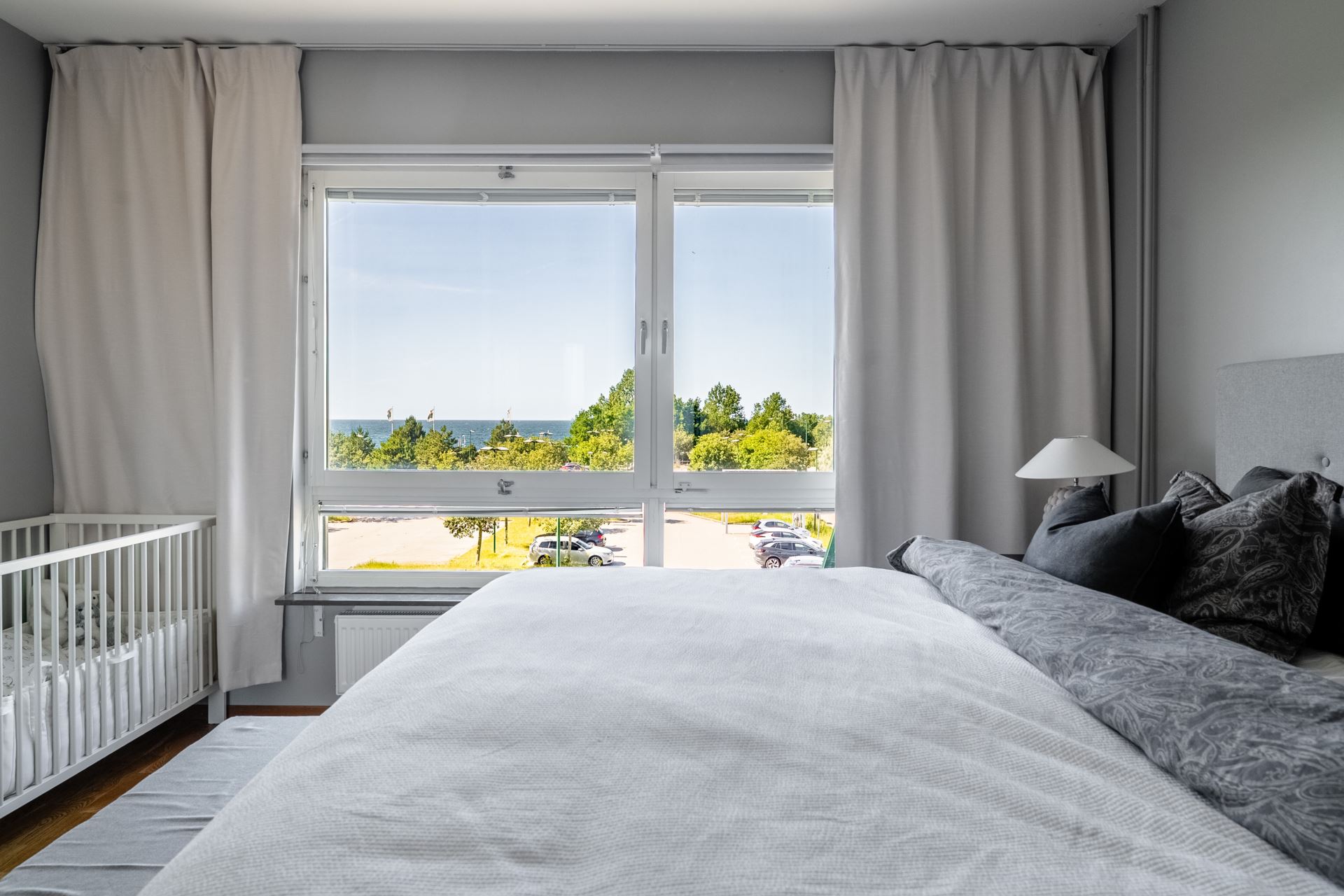 Huvudsovrummet har också stora fönsterpartier och fin utsikt över hav och grönska. Här finns plats för dubbelsäng med tillhörande möbler samt goda förvaringsmöjligheter i inbyggda garderober bakom skjutdörrar. Golvet är i parkett och väggarna är ljusa.