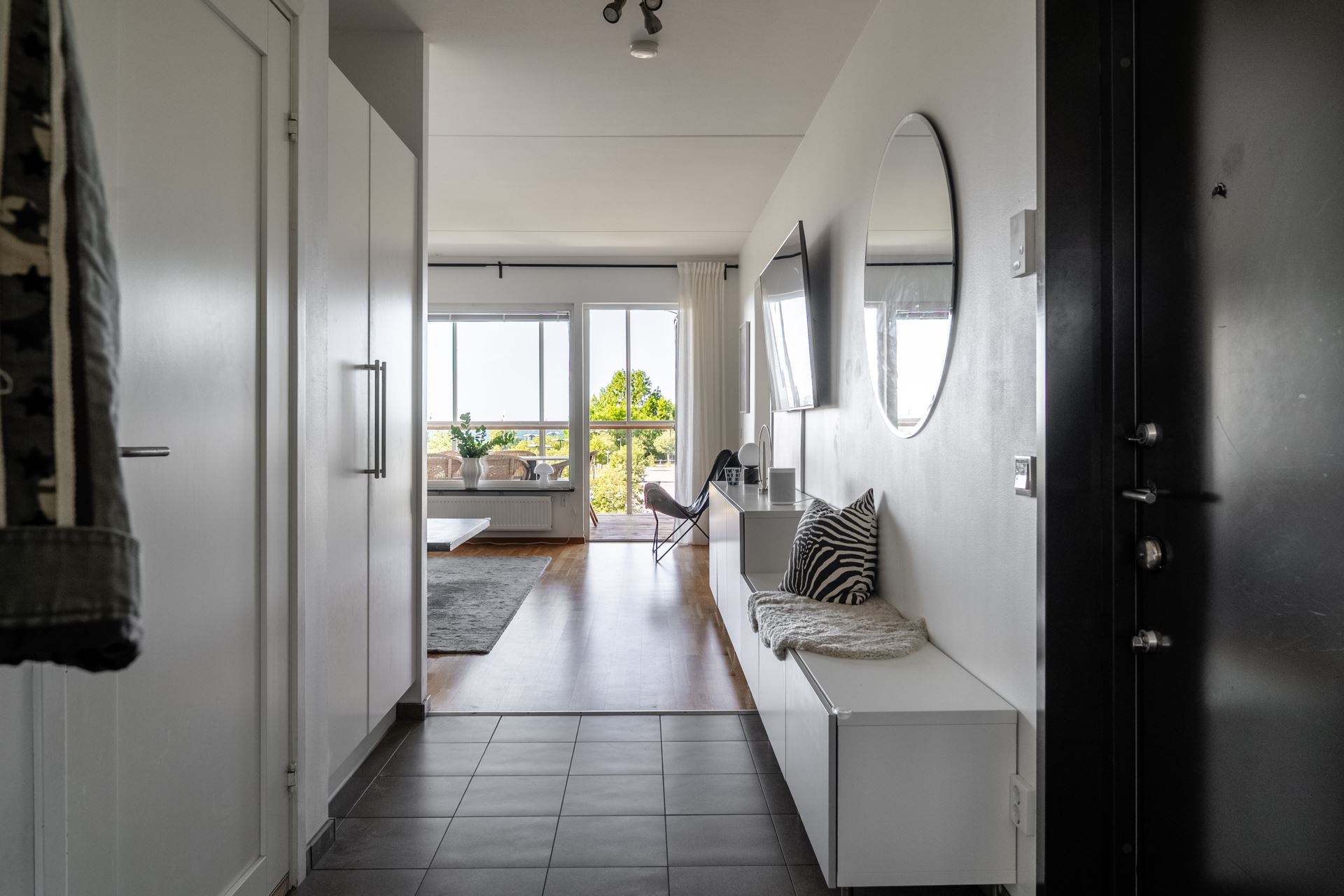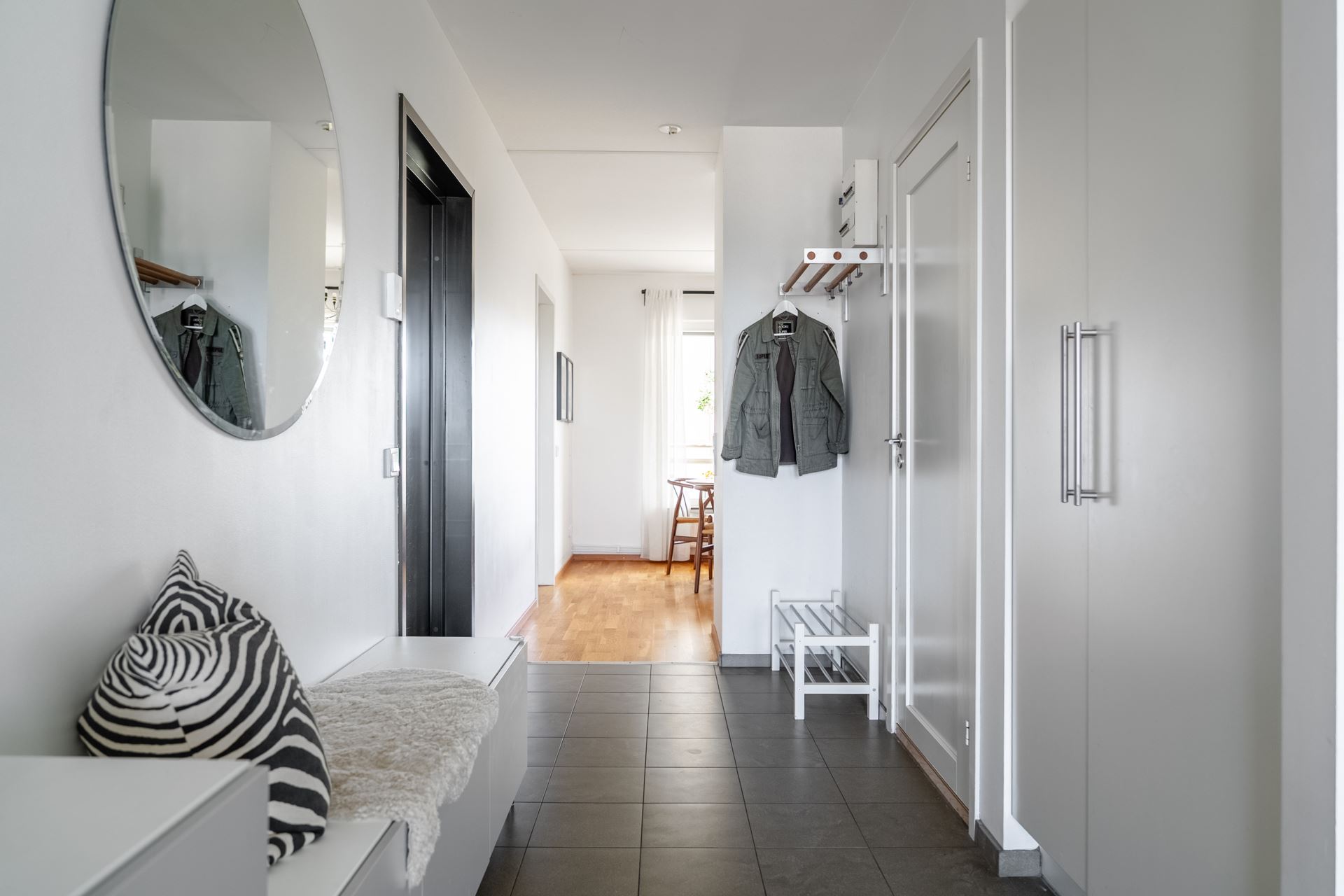 Vi tar oss upp till tredje våningen och välkomnas in i denna ljuvliga lägenhet. På golvet ligger ett praktiskt klinkergolv i grått och väggarna är ljusa. Här finns plats för avhängning av ytterkläder och skor. Ytterligare förvaring erbjuds i garderober.