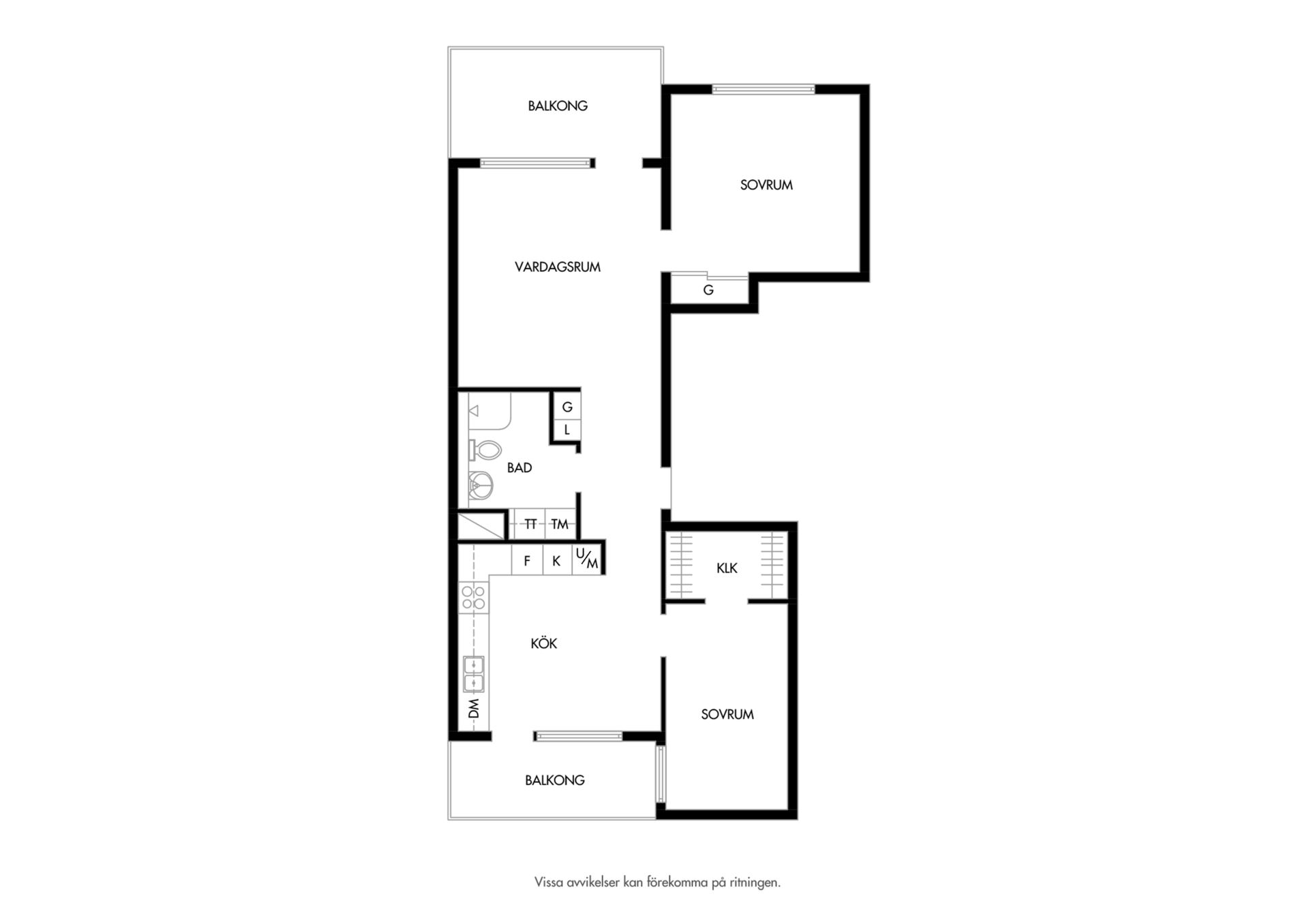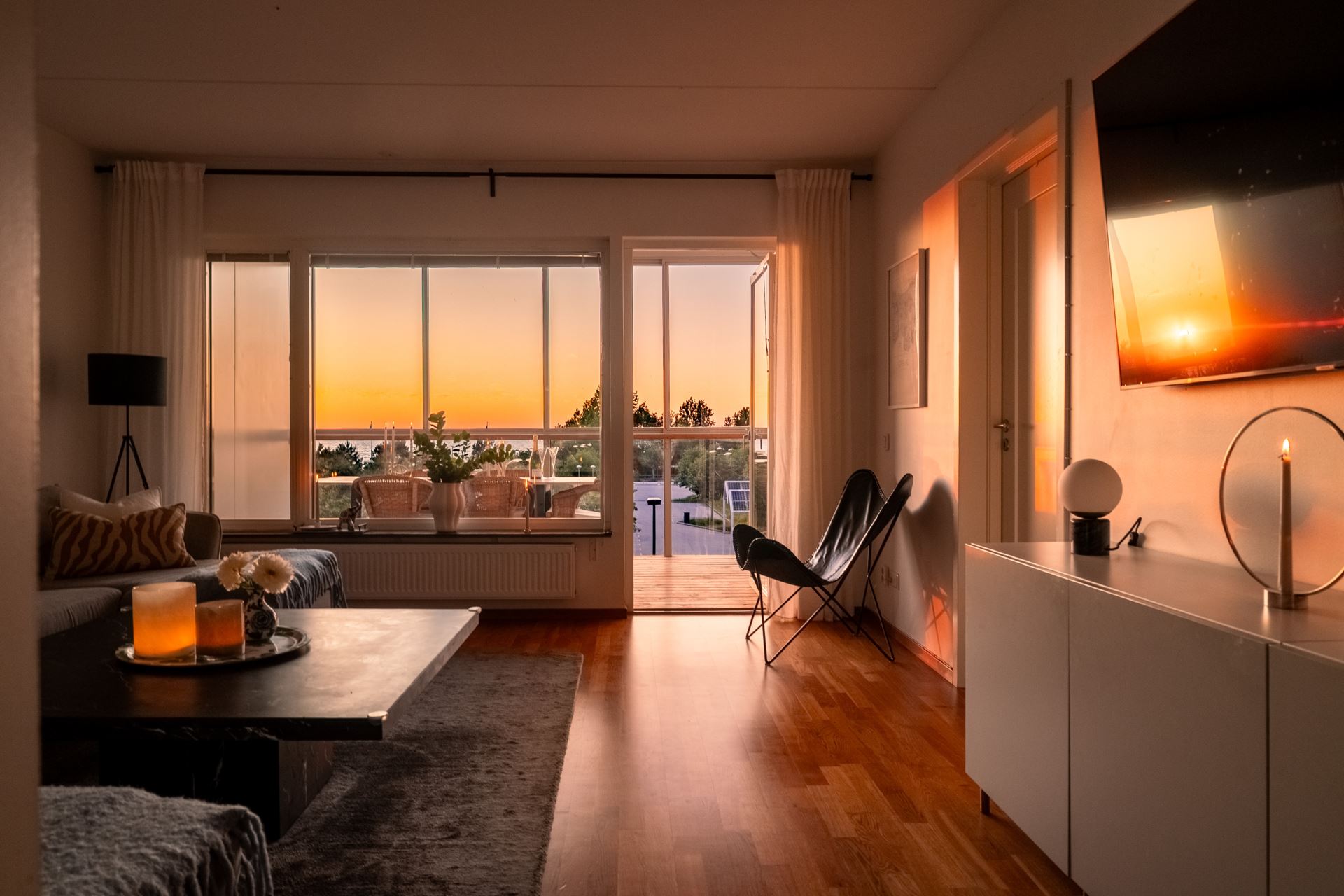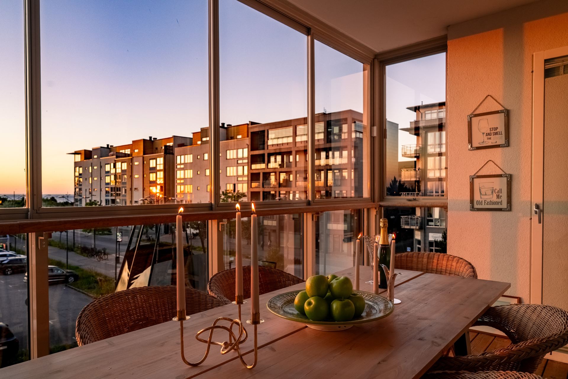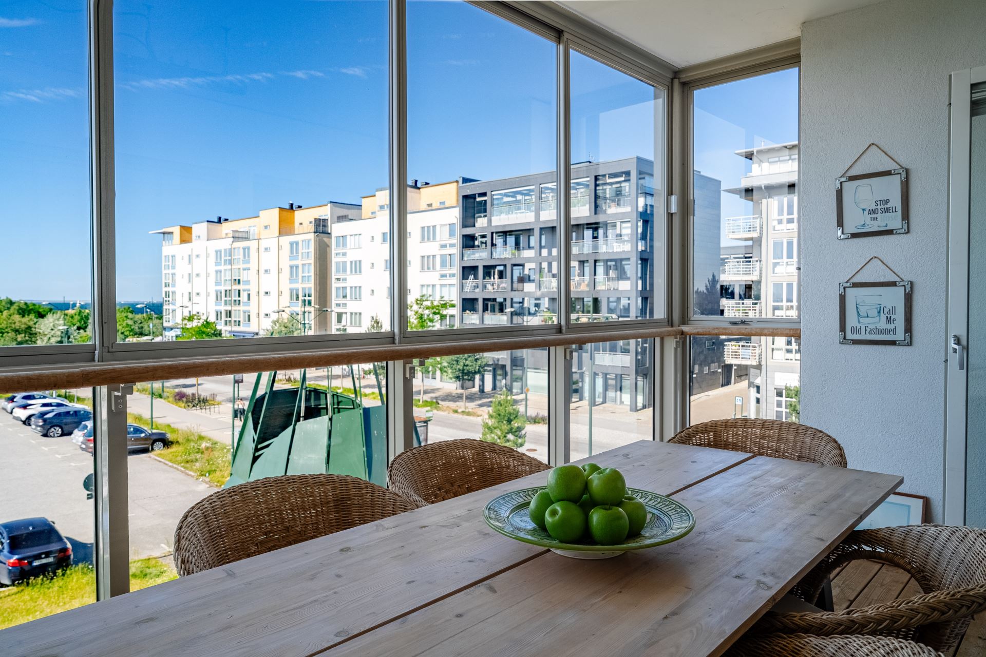 Bostaden erbjuder ett modernt kök med full maskinell utrustning och utsikt mot Turning Torso, ett helkaklat badrum med tvättmöjligheter samt två sovrum i bra storlek. Vardagsrummet har stora fönsterpartier och utgång till en av balkongerna där du kan njuta av solnedgången över Öresund.