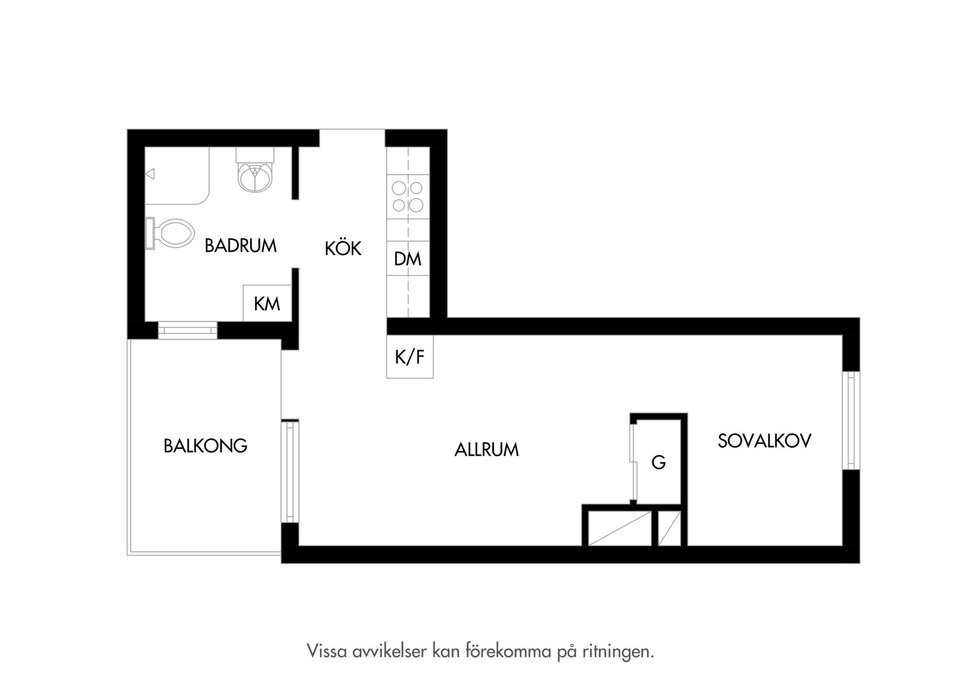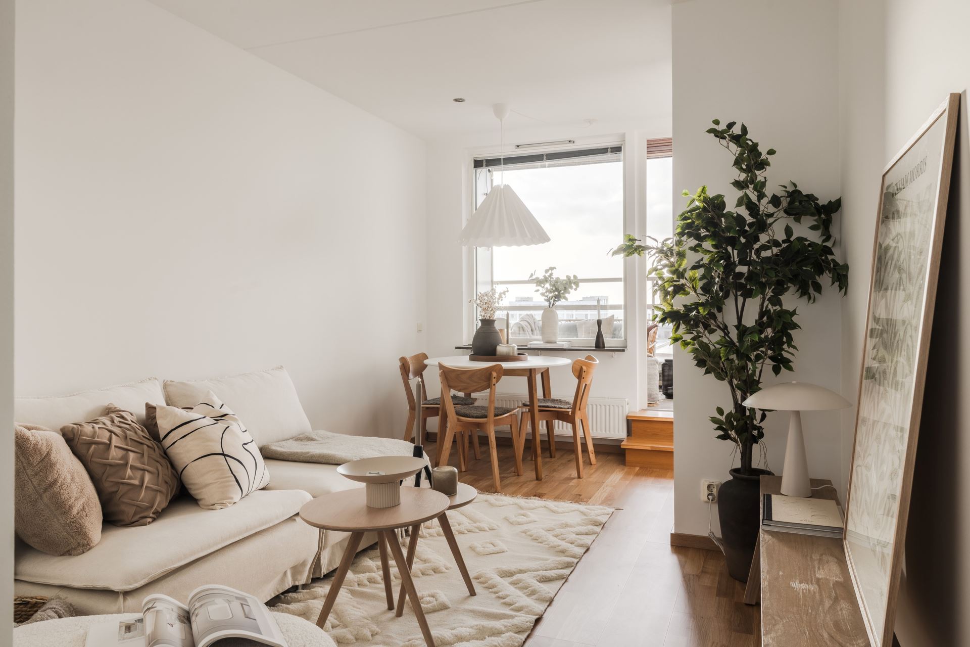 Vidare in i lägenheten öppnar det luftiga ljusa rummet upp med vacker ekparkett och släta vita väggar. Här finner vi naturlig placering av både soffgrupp och matplats. Längst in i lägenheten står sängen perfekt, lite avskilt från sällskapsytan. Från vardagsrummet finner vi förvaring bakom två vita skjutdörrar. Från detta rum når vi den underbara balkongen i sydväst. Här kan man njuta av flera soltimmar och utsikt mot havet. Ett underbart extrarum om vår och sommar.