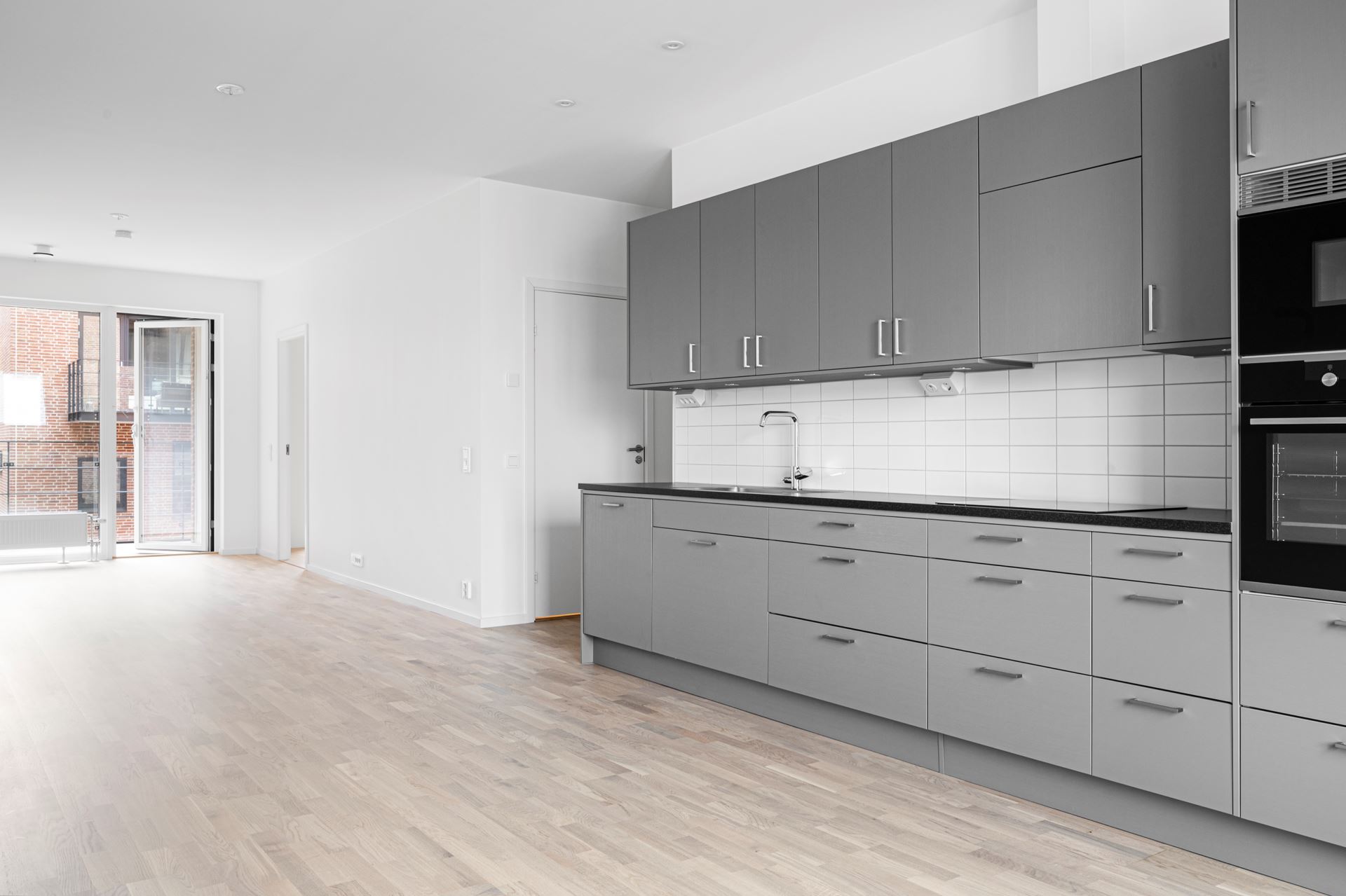 Stilrent kök från Vedum, här erbjuds gott om förvaringsmöjligheter bakom gråa släta köksluckor som kombineras fint med grå bänkskiva och vitt kakel ovanför. Köket är utrustat med hel kyl och frys, diskmaskin, ugn, mikrovågsugn och spishäll. Gott om plats för matbord finns mot köksdelen.