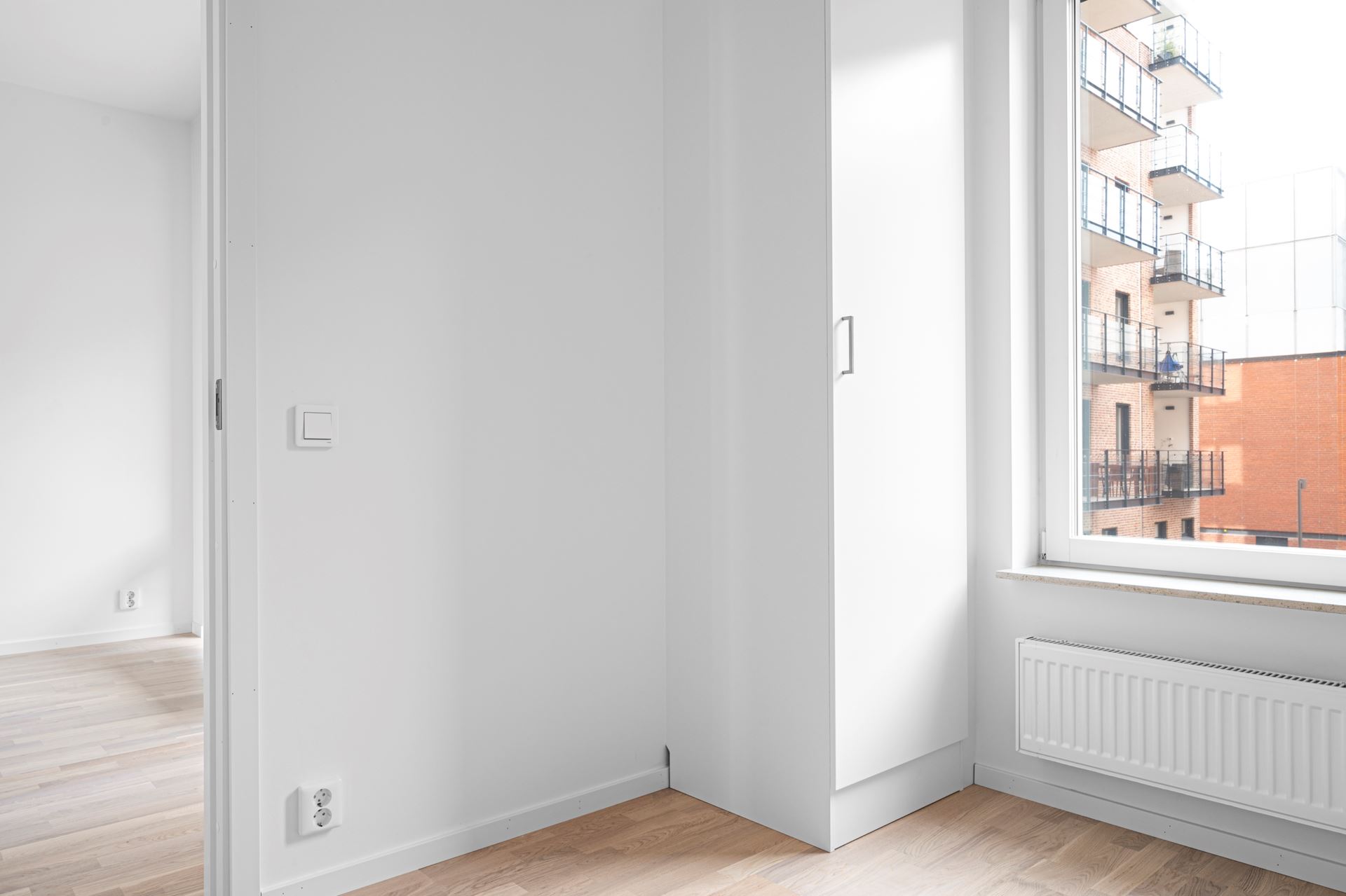 Andra sovrummet hittar vi längre in i bostaden. Här får vi enkelt plats med säng, sängbord och mer därtill. Förvaring finns i platsbyggd garderob.