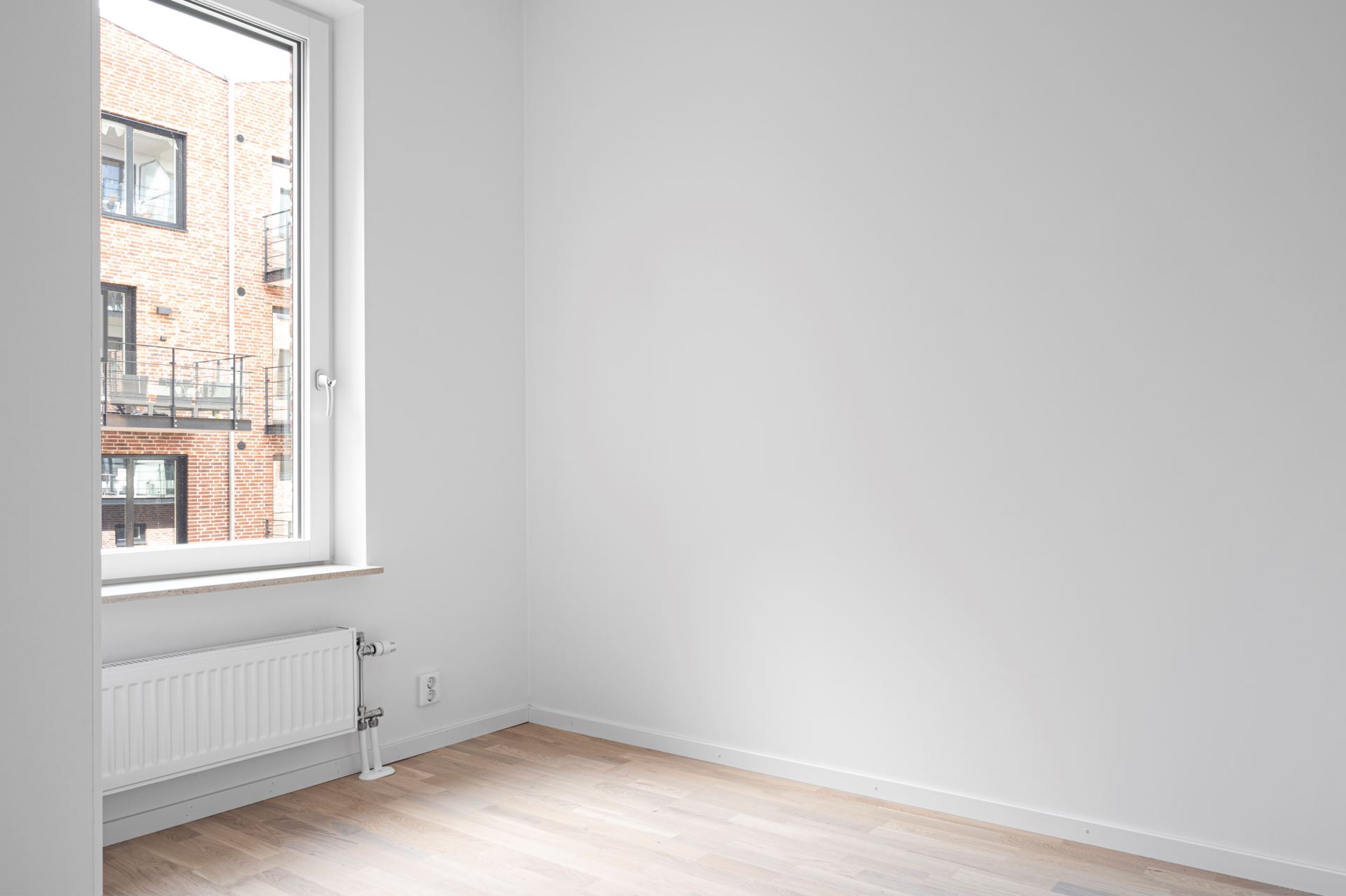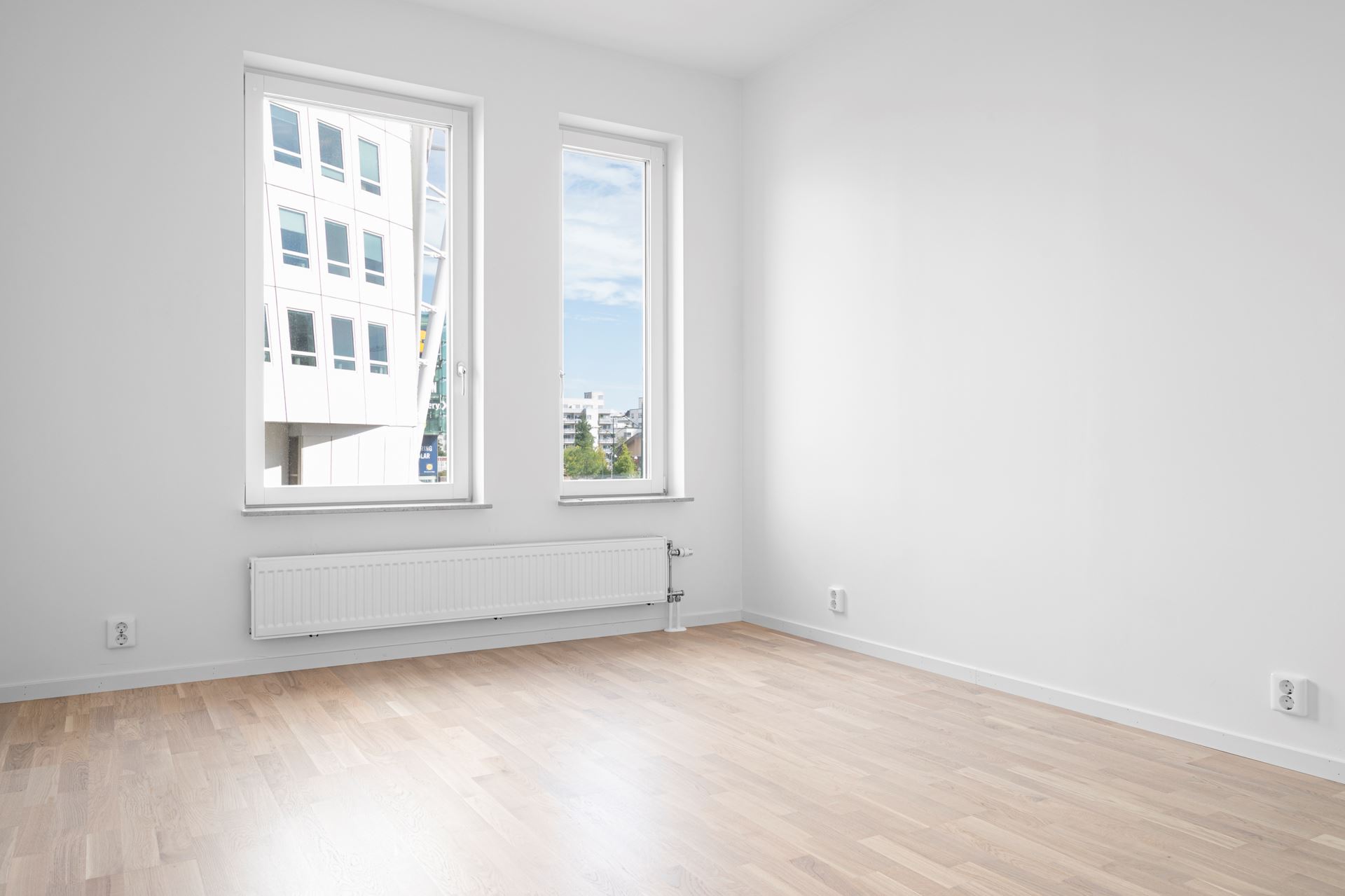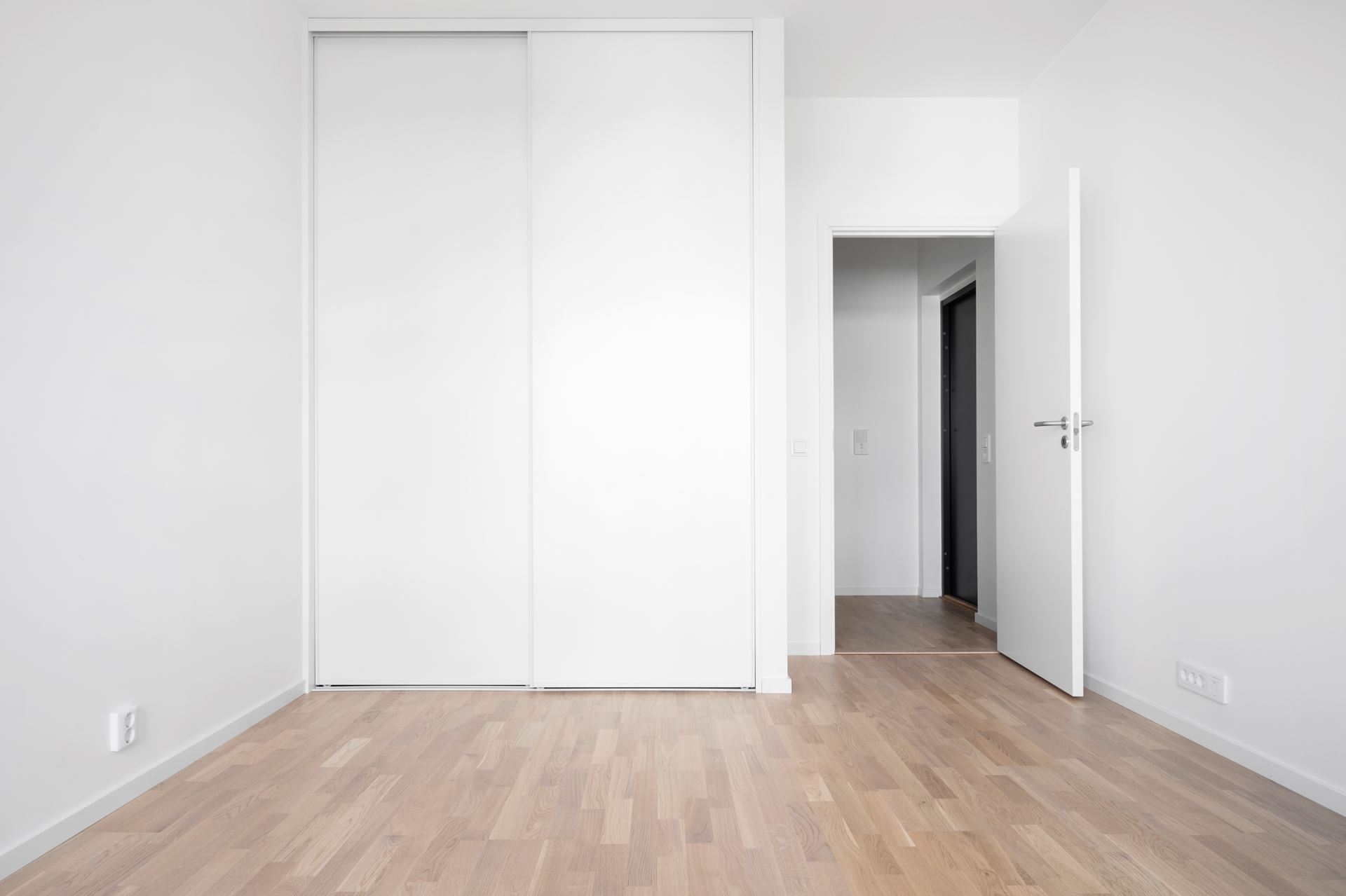 Väl tilltaget sovrum, här ryms dubbelsäng, sängbord och tillhörande möblemang efter önskemål. Förvaringsmöjligheter hittar vi bakom skjutdörrsgarderob.