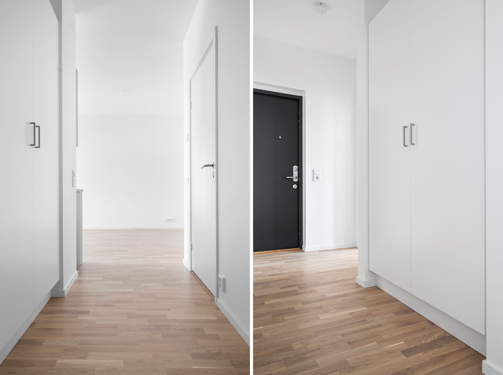 På andra våningen välkomnas vi in till denna ljusa och välplanerade bostad. Vi möts av trevlig hallmiljö med goda avhängingsmöjligheter i garderob på vänster sida. Snyggt trestavsekparkett på golv och vitmålade väggar är genomgående för hela bostaden.
