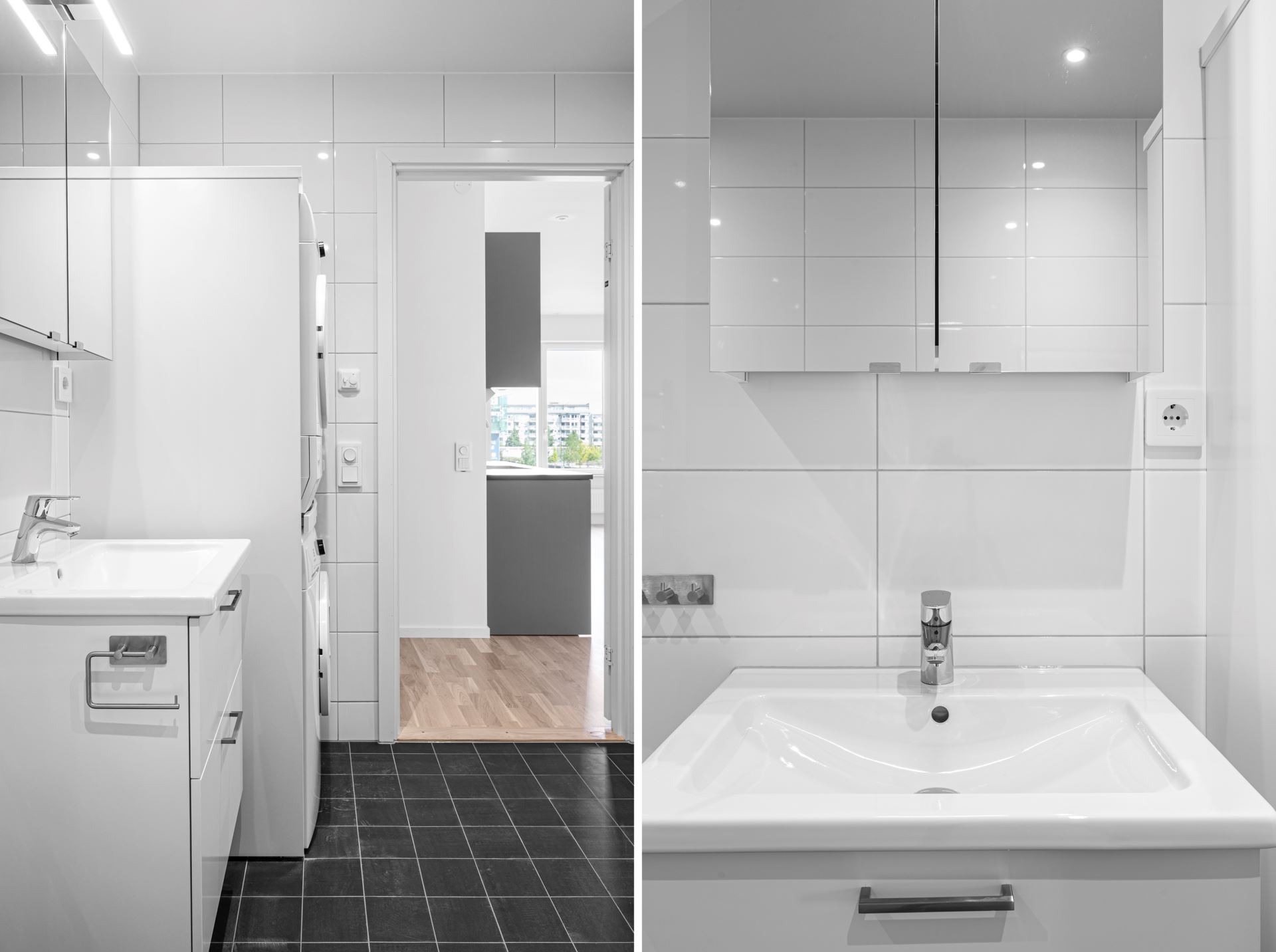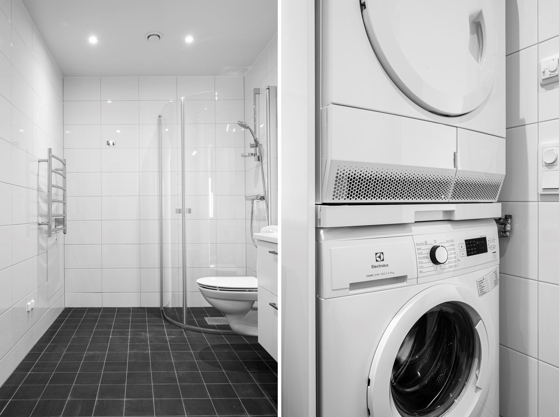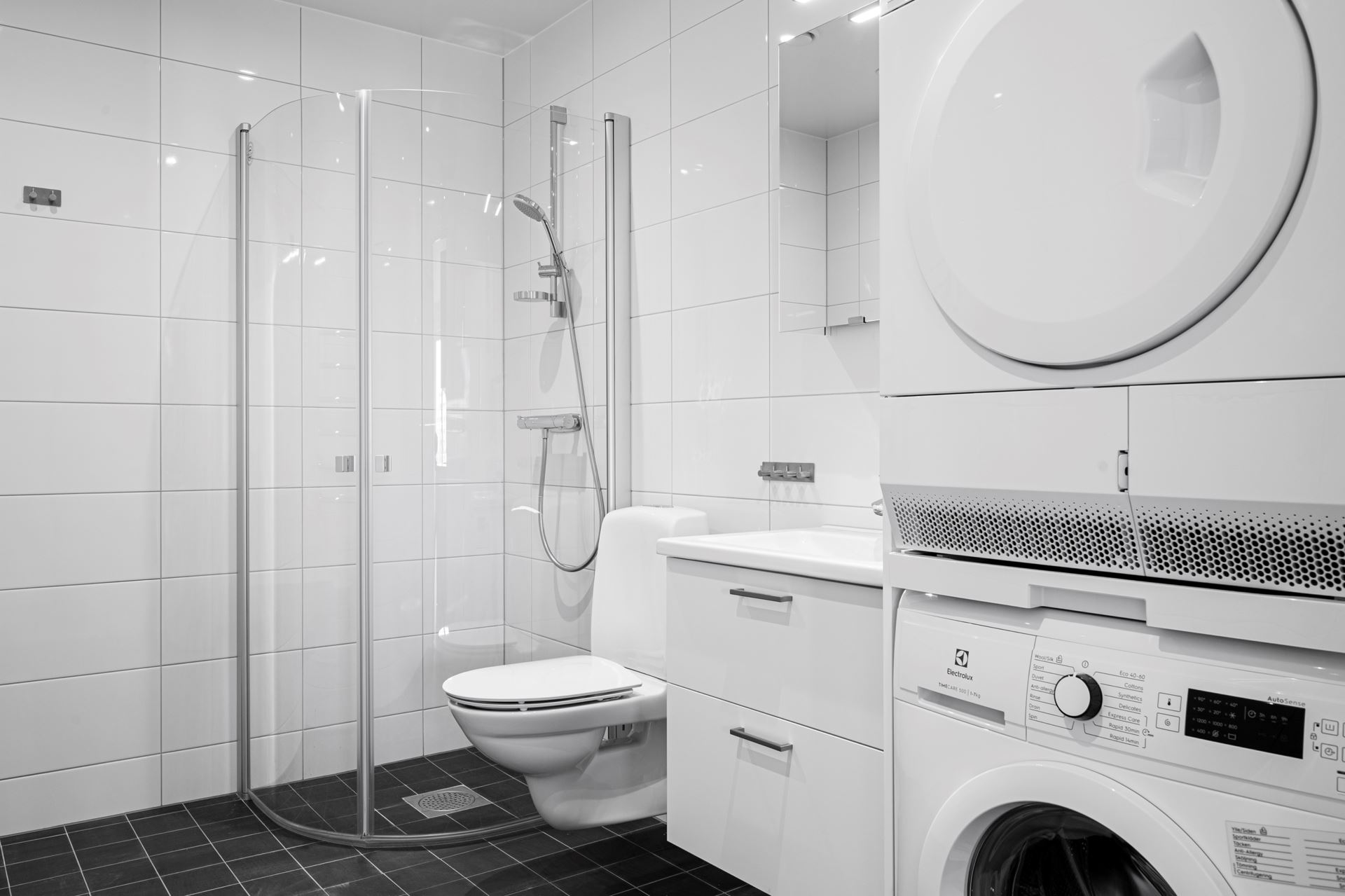 Ett helkaklat badrum med vitt kakel på väggarna och grått klinkers på golv. Egna tvättmöjligheter med både tvättmaskin och torktumlare från Electrolux. Utrustat med dusch med vikbara dörrar i glas, wc, handfat med kommod, spegelskåp med belysning.
