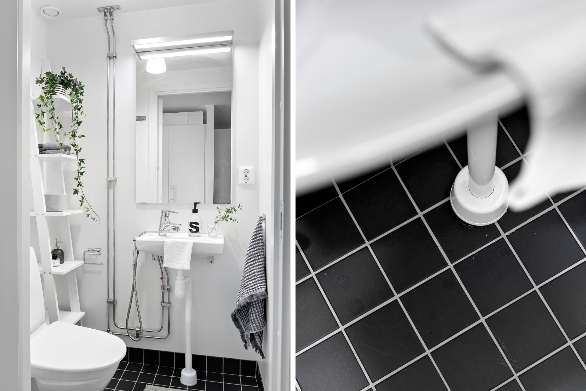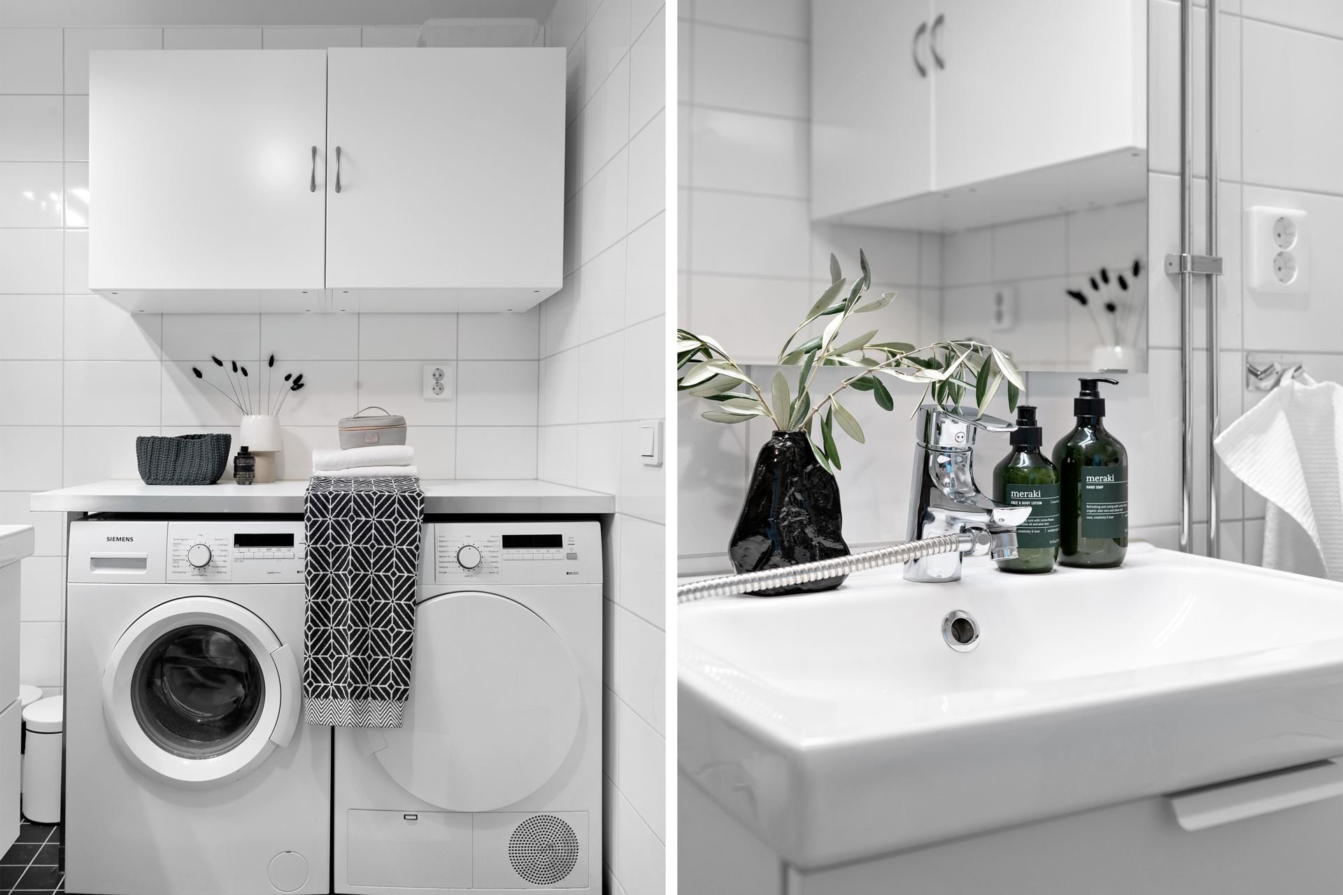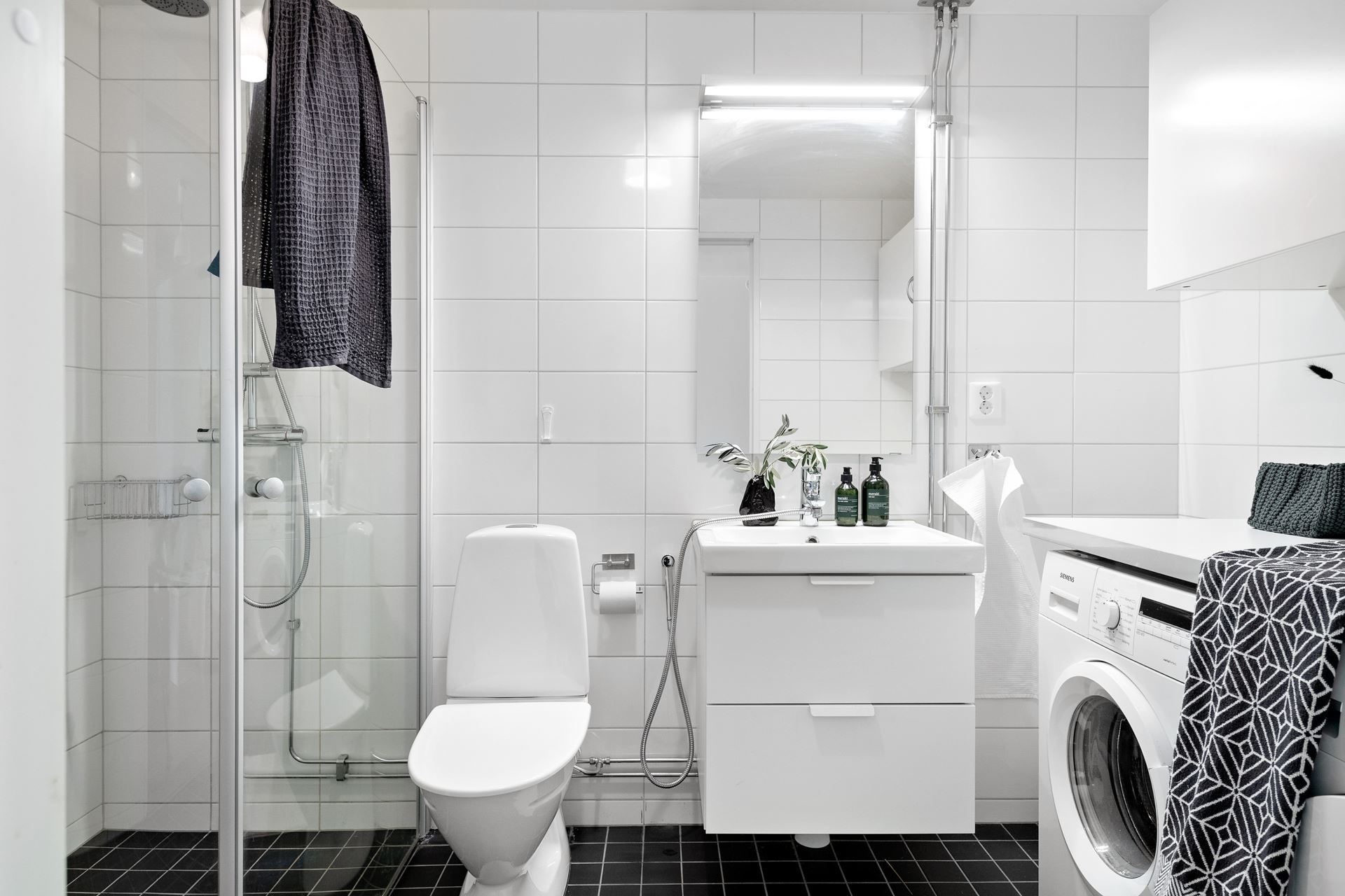 Helkaklat badrum med vitt kakel på väggarna och grått klinker på golv. Badrummet är utrustat med dusch bakom vikbara glasväggar, wc, handfat med kommod och spegel, tvättmaskin och torktumlare. Ytterligare plats till förvaring finns i skåpen ovan tvätt,- och tork.
