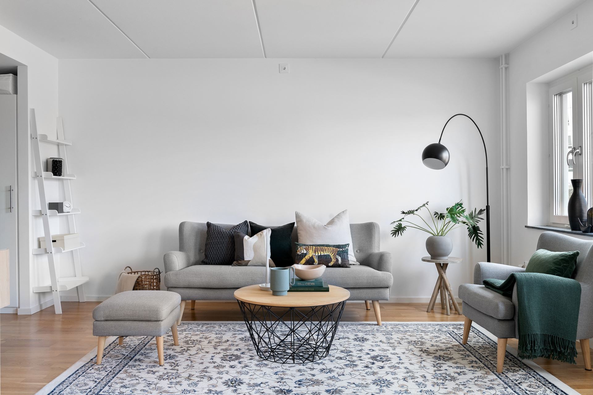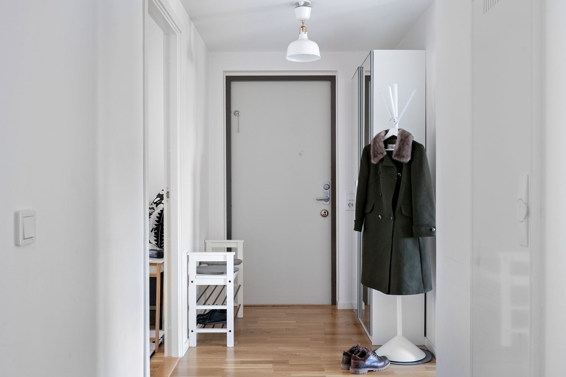 Via hissen från markplan når vi andra våningen där vi välkomnas in i en trevlig hallmiljö med stilrena interiörval. Här ligger ekparkett på golv tillsammans med vitmålade väggar som är genomgående för hela lägenheten. Här finns utrymme för både sko- och hatthylla, mer förvaringsutrymme hittar vi även i skjutdörrsgarderob.