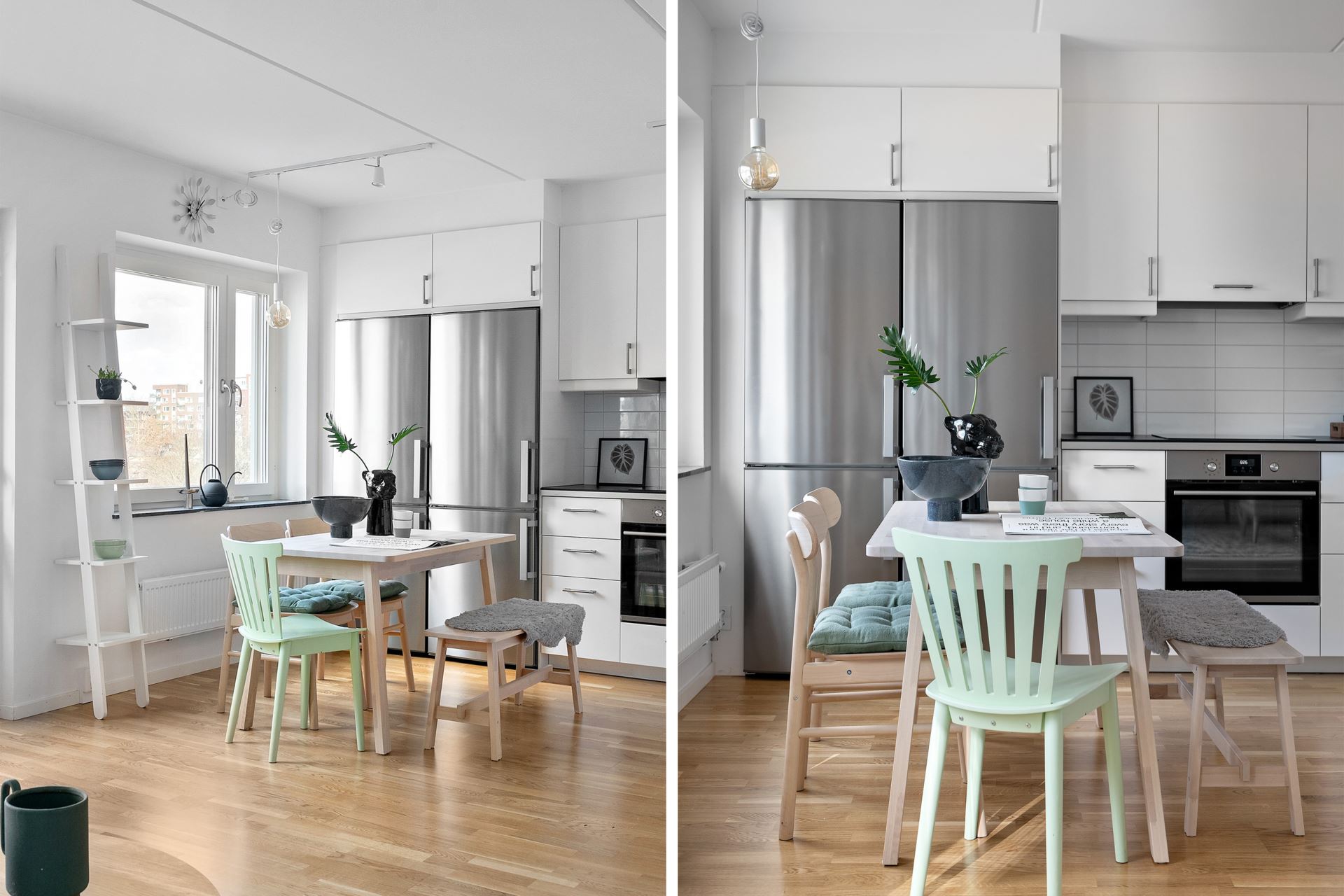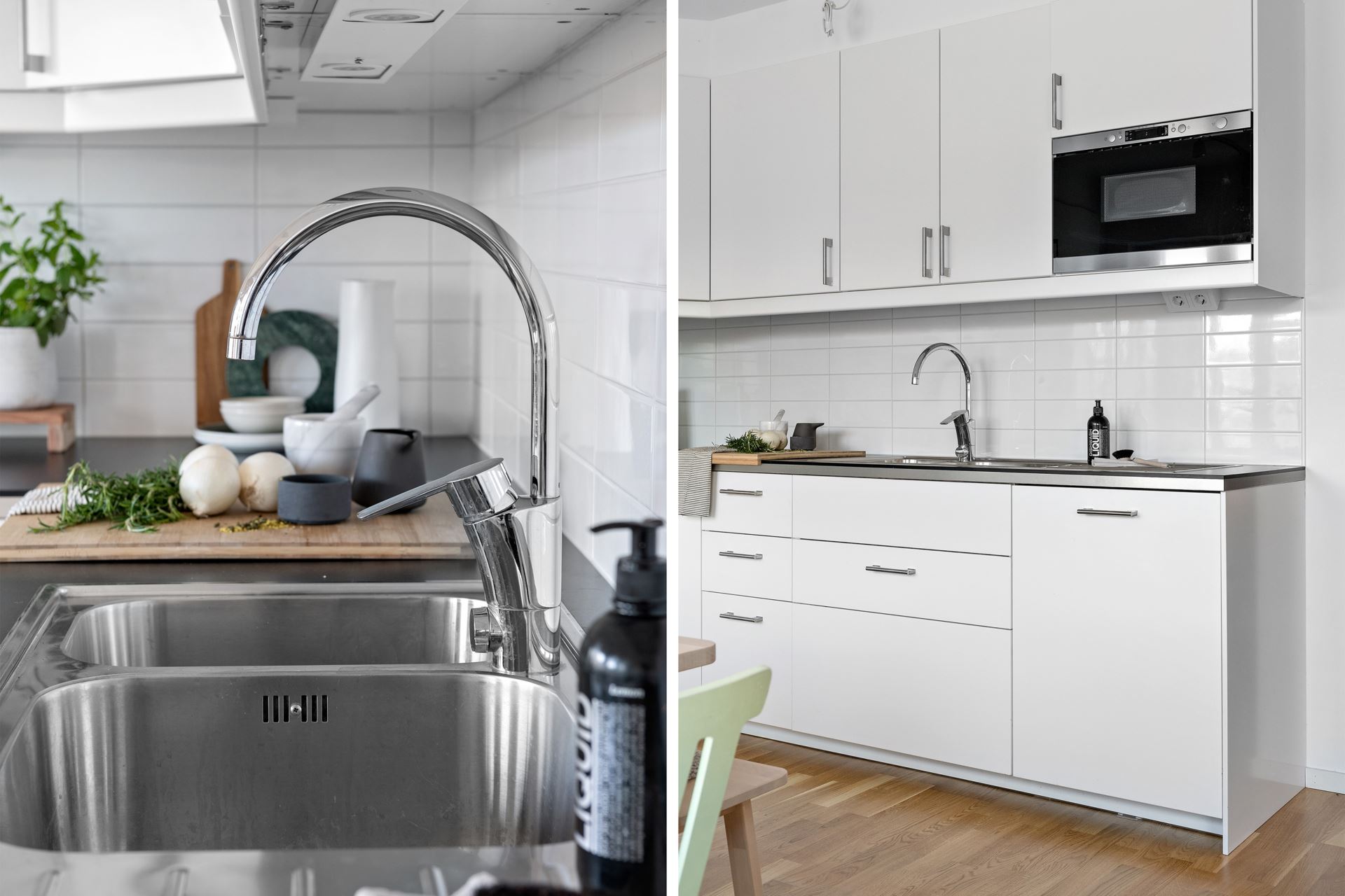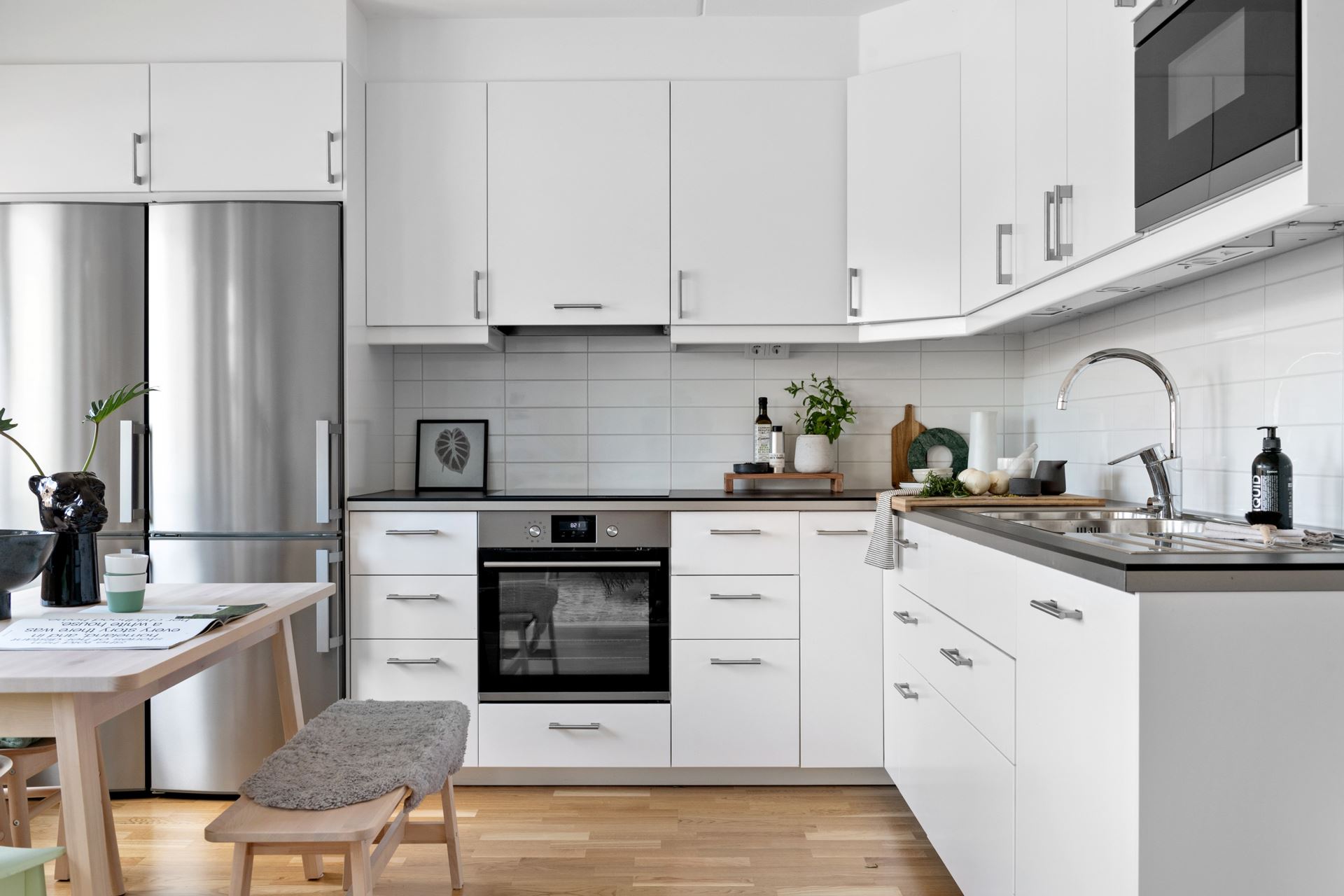 Kök i vinkel sammanflätas på ett naturligt vis med vardagsrummets planlösning. Vita köksluckor (IKEA) kombineras med vitt kakel och bänkskiva i laminat. Gott om plats till förvaring både i skåp och lådor, samt utmärkta arbetsytor. Köket är utrustat med diskmaskin, dubbel kyl och frys, spishäll och ugn