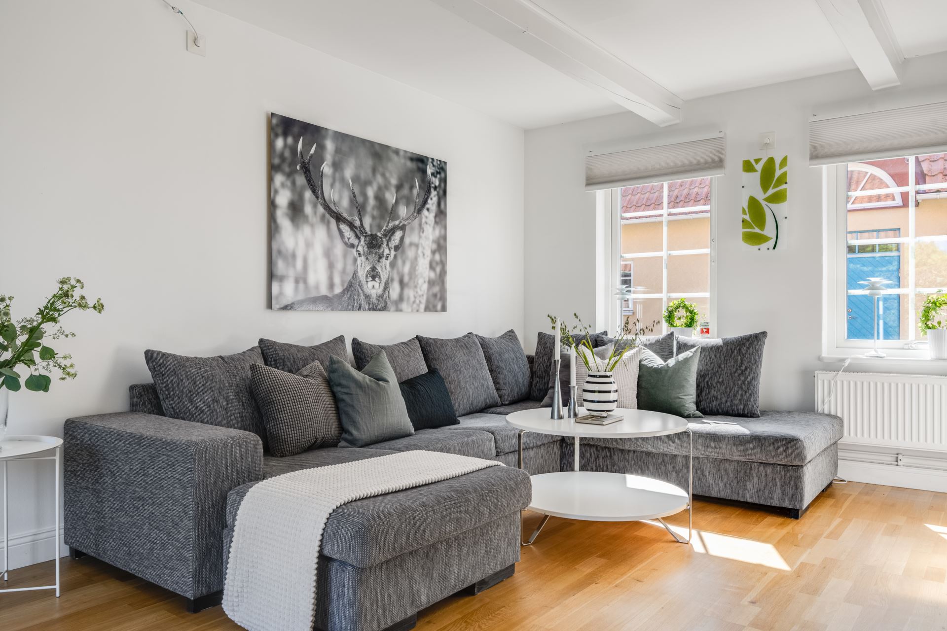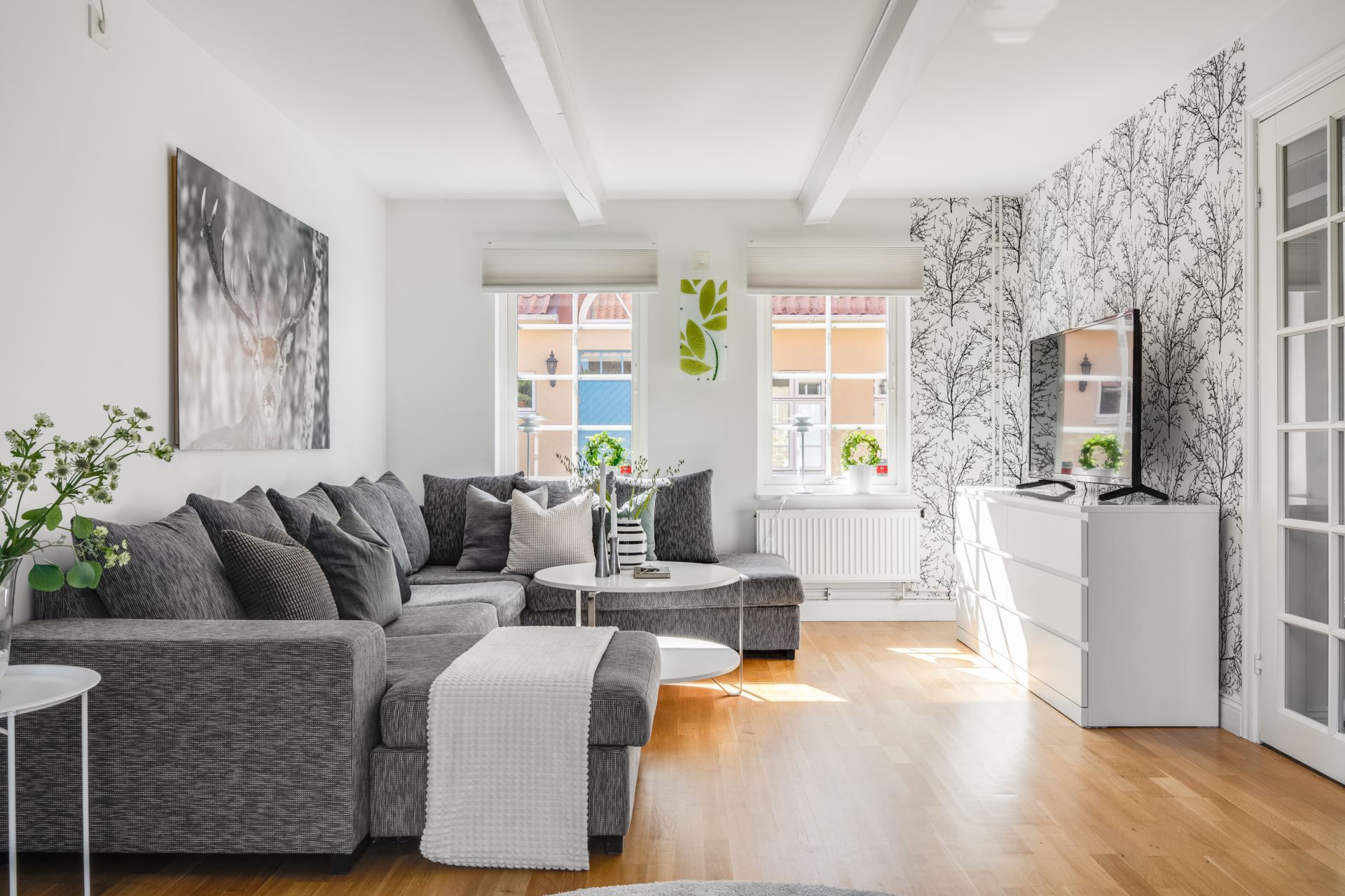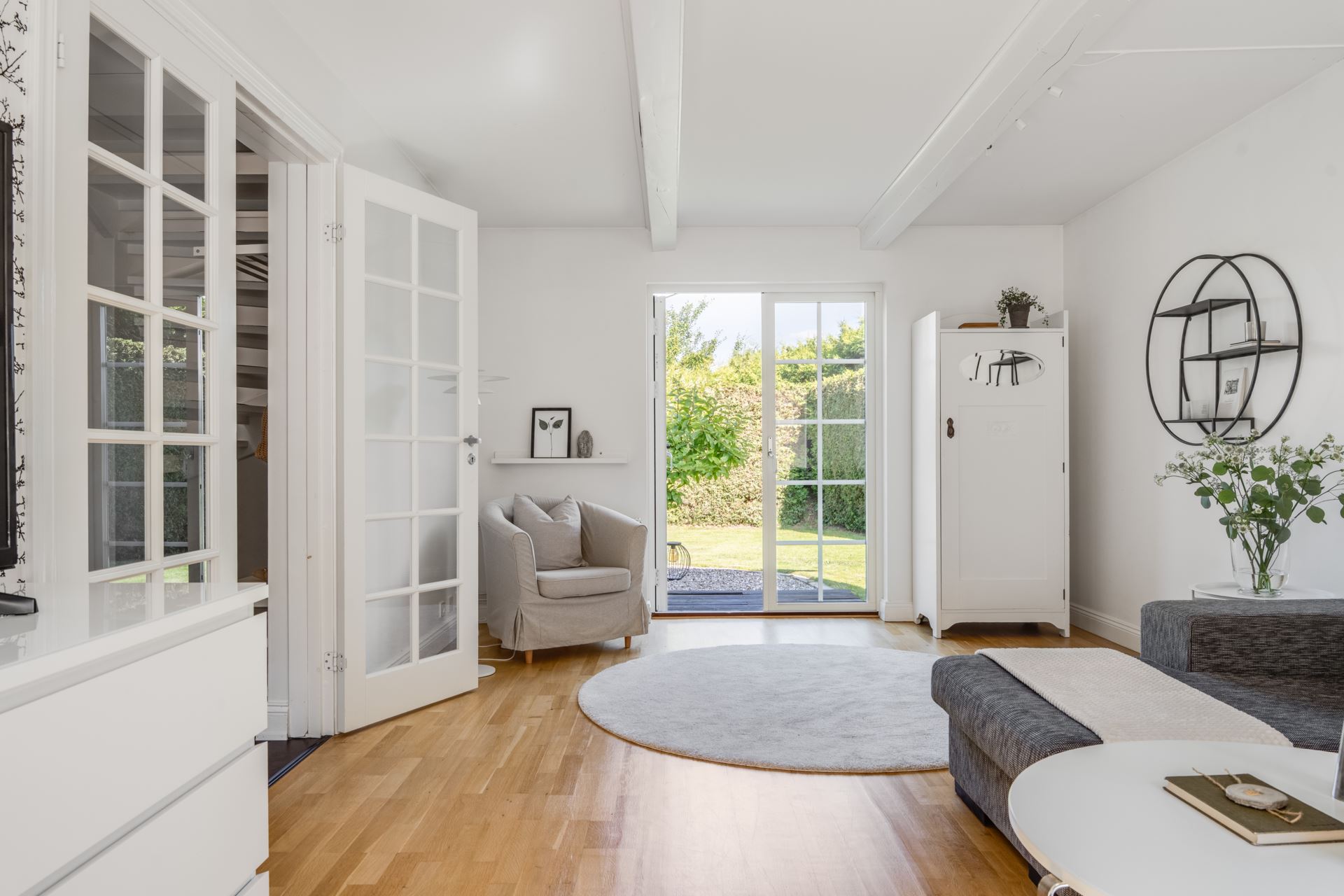Från hall inviterar ett tilltalande vardagsrum där golvet smyckas av enhetlig parkett, vita väggar och svartvit fondvägg, och där ljuset strömmar in från fönster ut mot gatan, samt underbara glasdörrspartier i fullhöjd, ut mot uteplatsen. Här ryms med lätthet flertalet sköna sittgrupper, media och andra inredningsdetaljer. Behaglig belysning med lampor gömda bakom karaktäristiska vitmålade takbjälkar.
