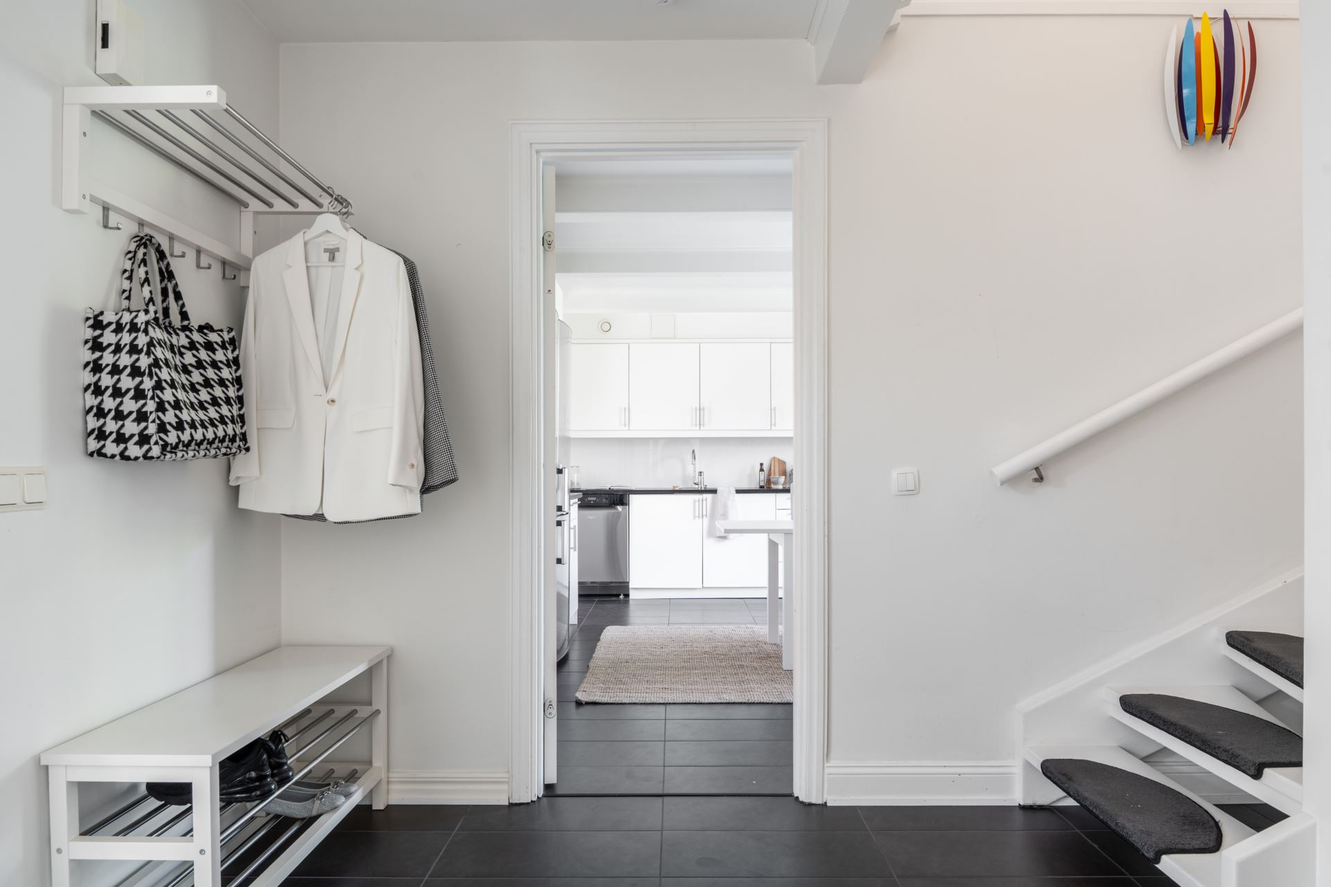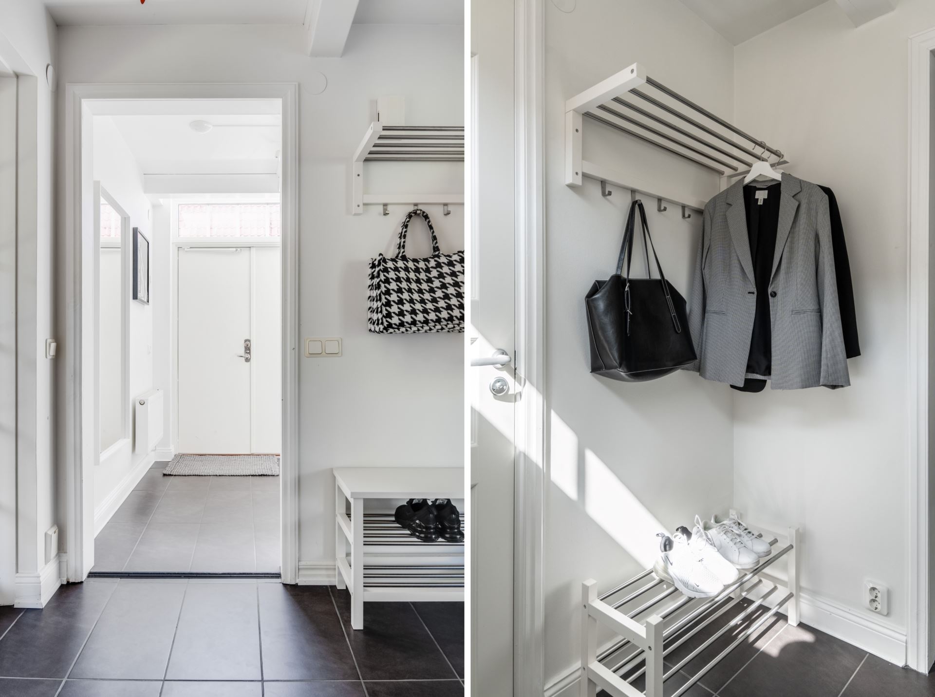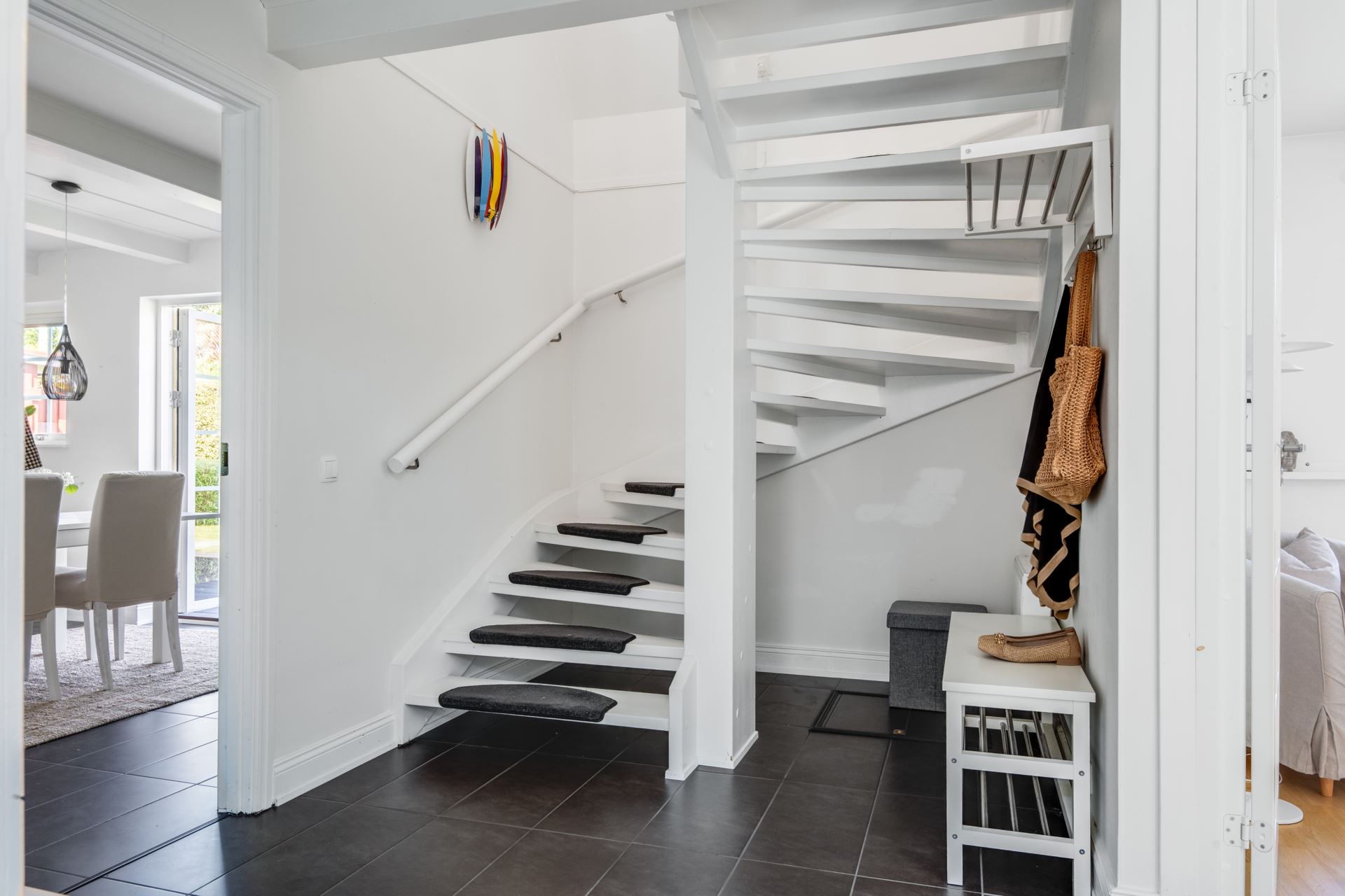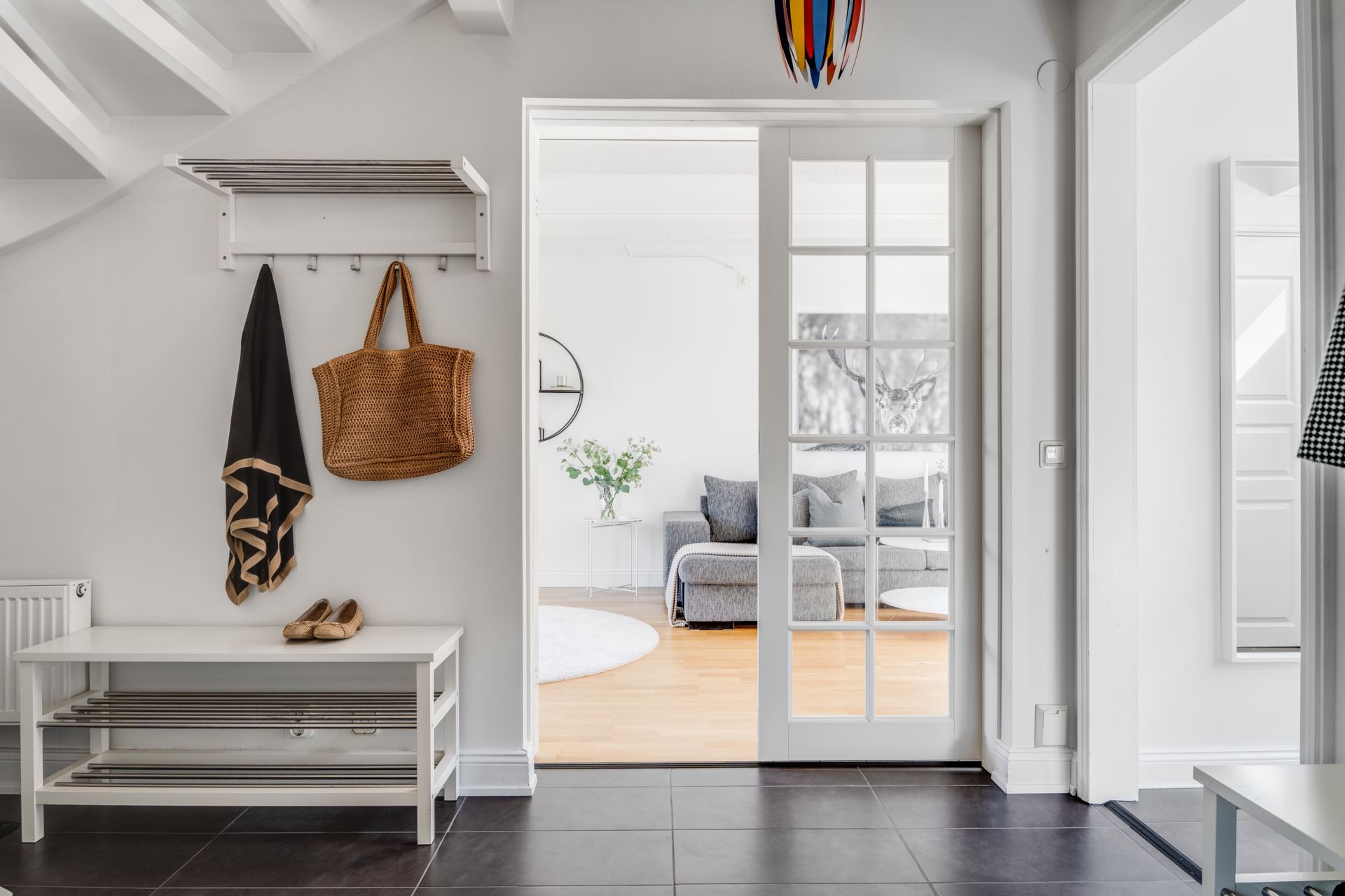 Vi välkomnas in till en rymlig och inbjudande hall, med praktiskt svart klinkergolv, som stilrent möter vita väggar, med plats för avhängning och skor, samt förvaringsmöbel. Hallen öppnar upp i tre riktningar, vilket ger ett behagligt ljusinsläpp. Från hallen kan vi även ta oss vidare, via vitmålad trätrappa med räcke och svarta mattor som halkskydd, till hemmets ovanvåning.
