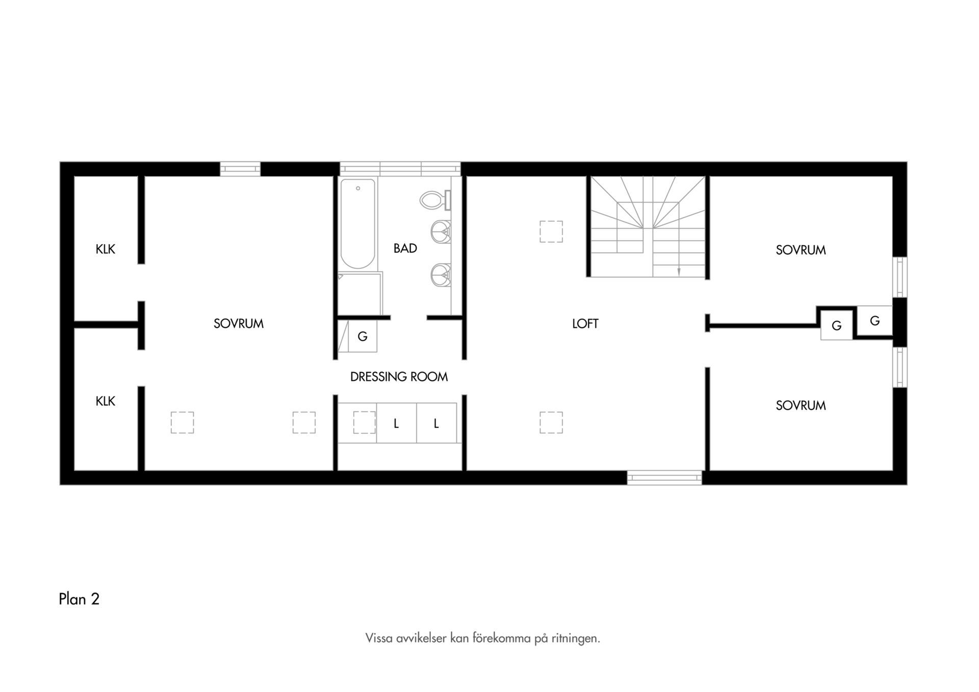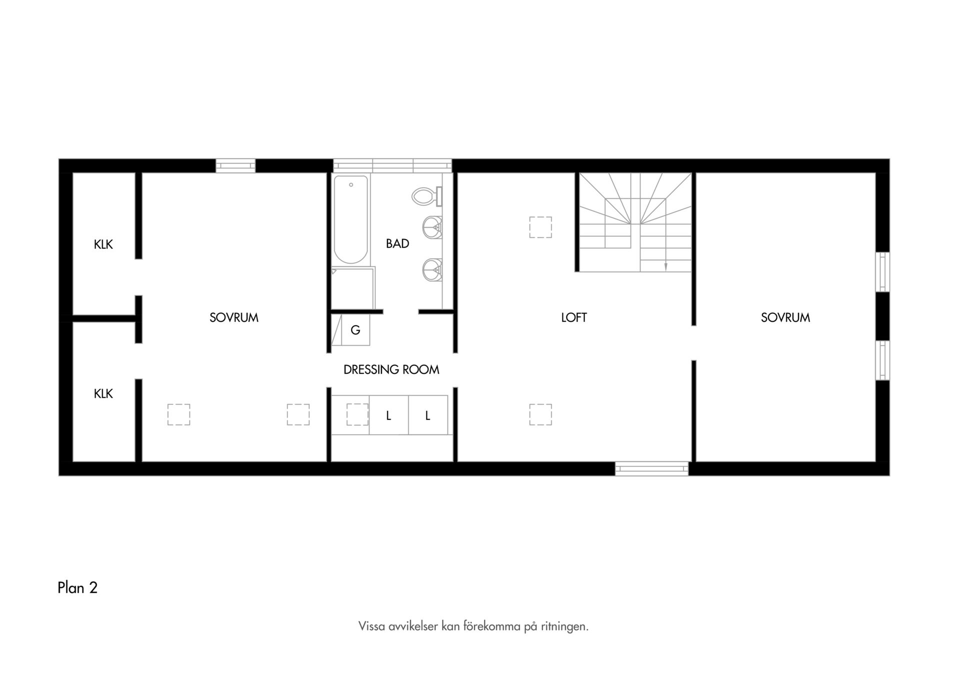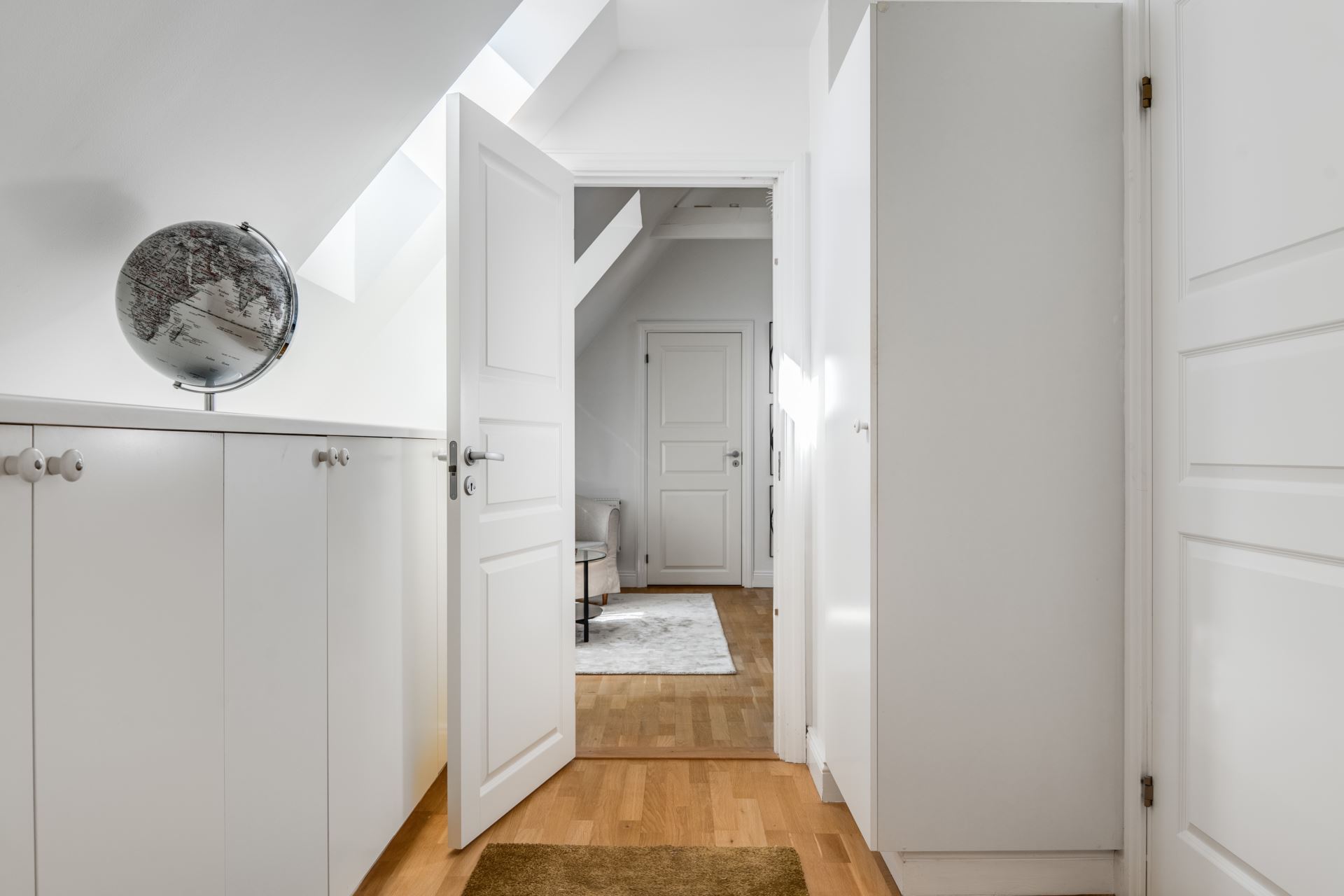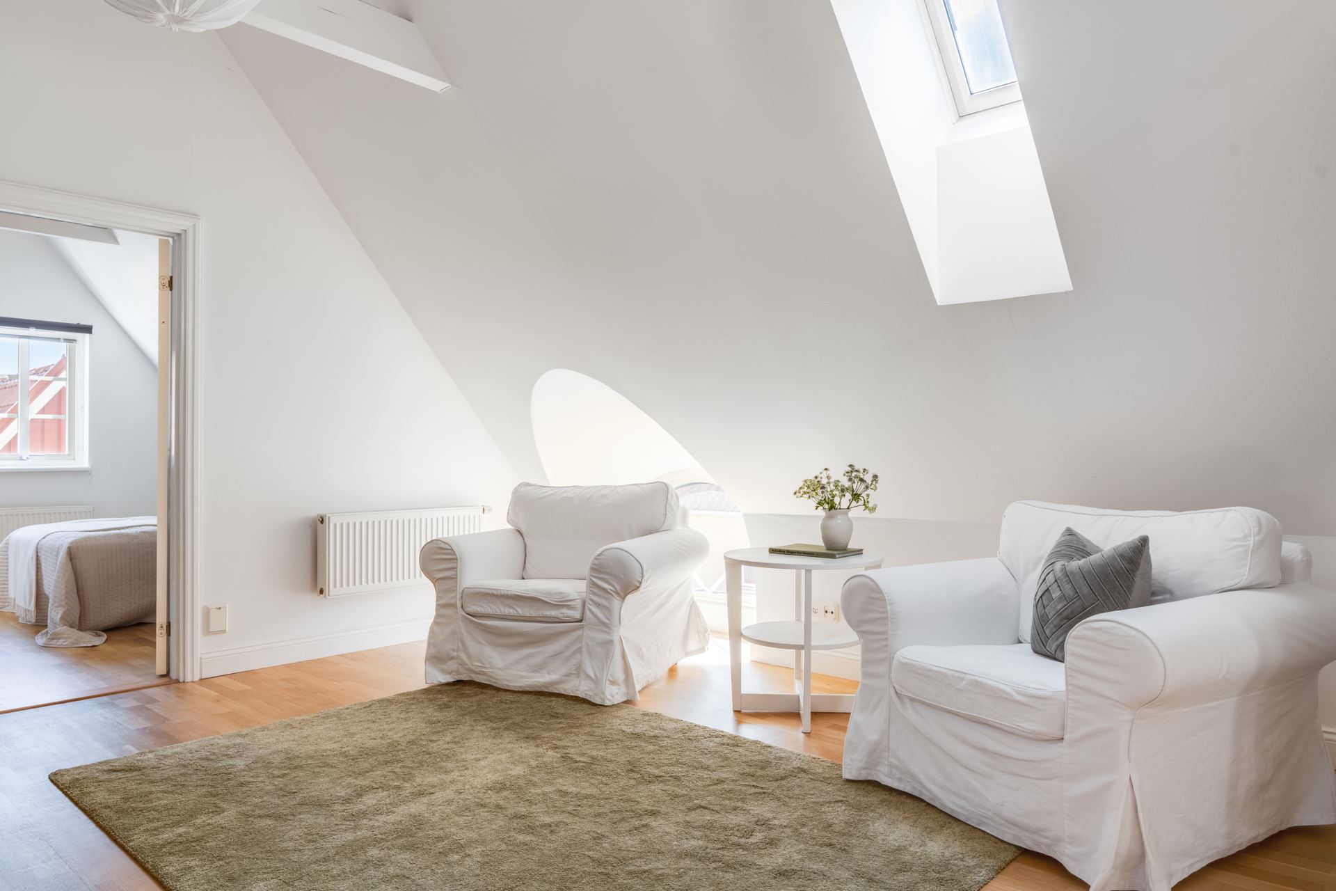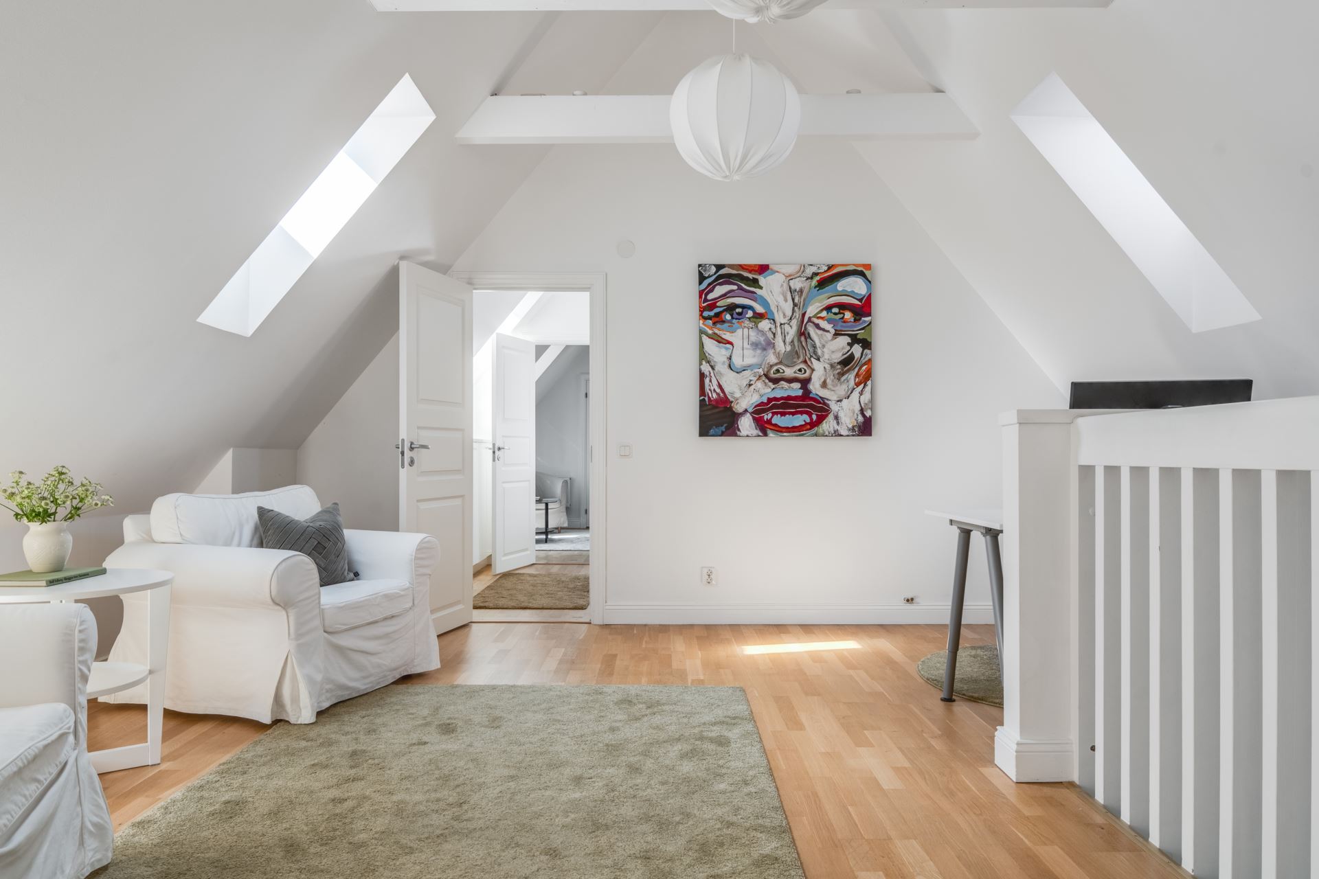 Den vitmålade trätrappan från hallen, leder upp till ovanvåningen, som tar emot med parkett på golv, vita väggar och praktfullt synliga takbalkar i trä, med takfönster i snedväggar på bägge sidor. Härifrån når vi ovanvåningens sovrum och badrum, och finns plats för möbleringsalternativ om så önskas.
