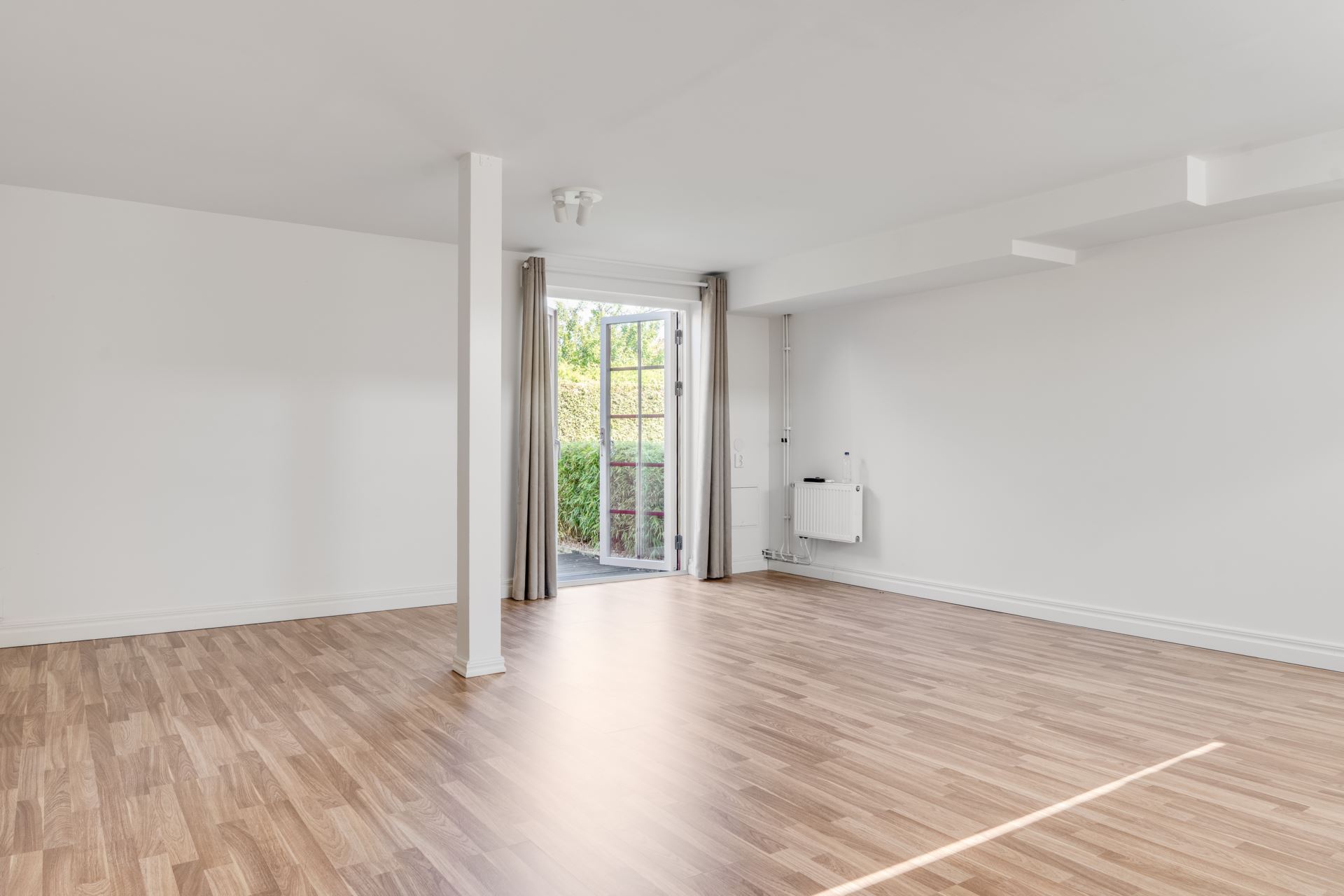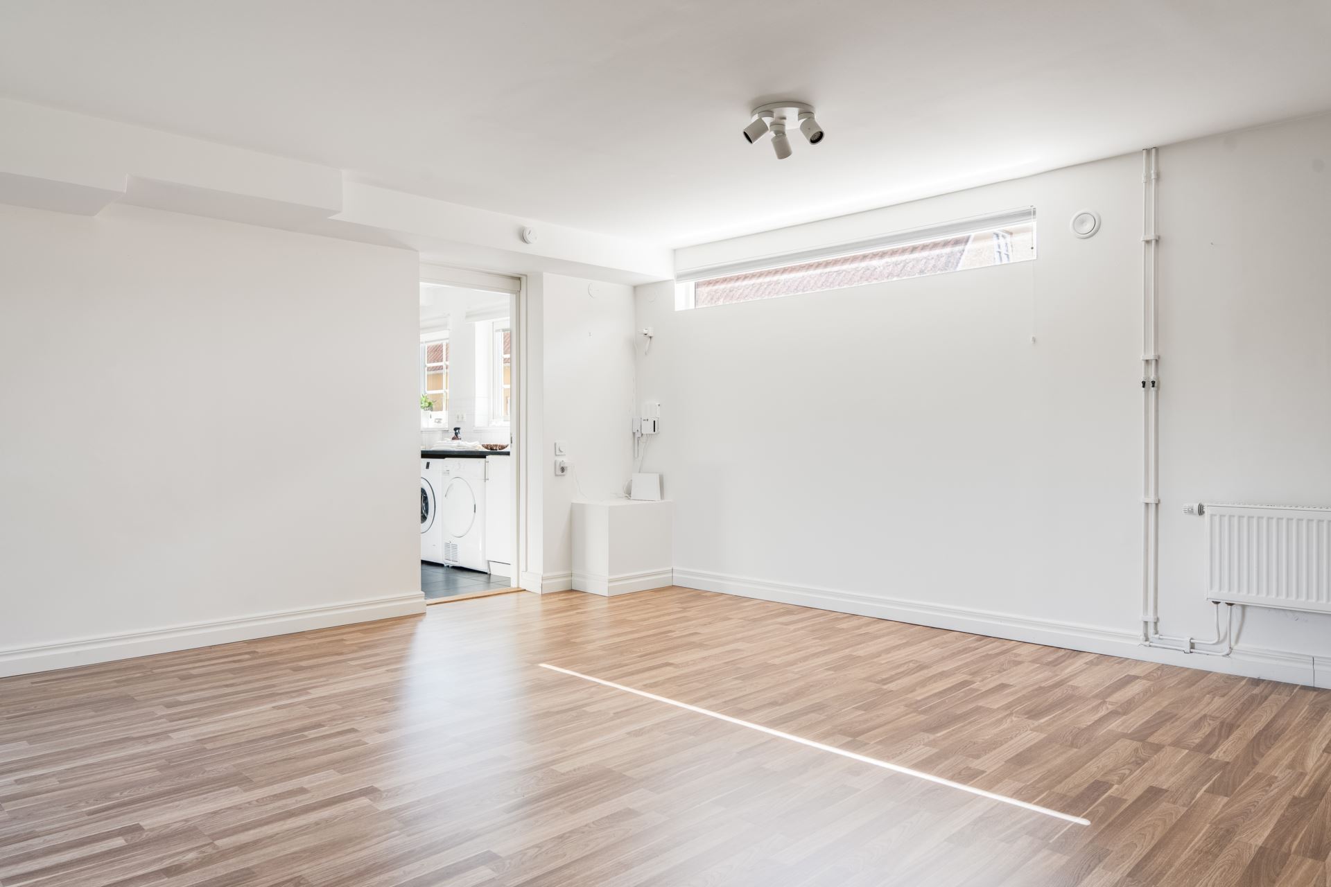 Vidare från tvättstuga finner vi ett rum med många möjligheter. Denna yta har tidigare varit ett garage, men är vidgjort, med parkettgolv som möter vita väggar, och som kan möbleras valfritt efter behov och önskemål.