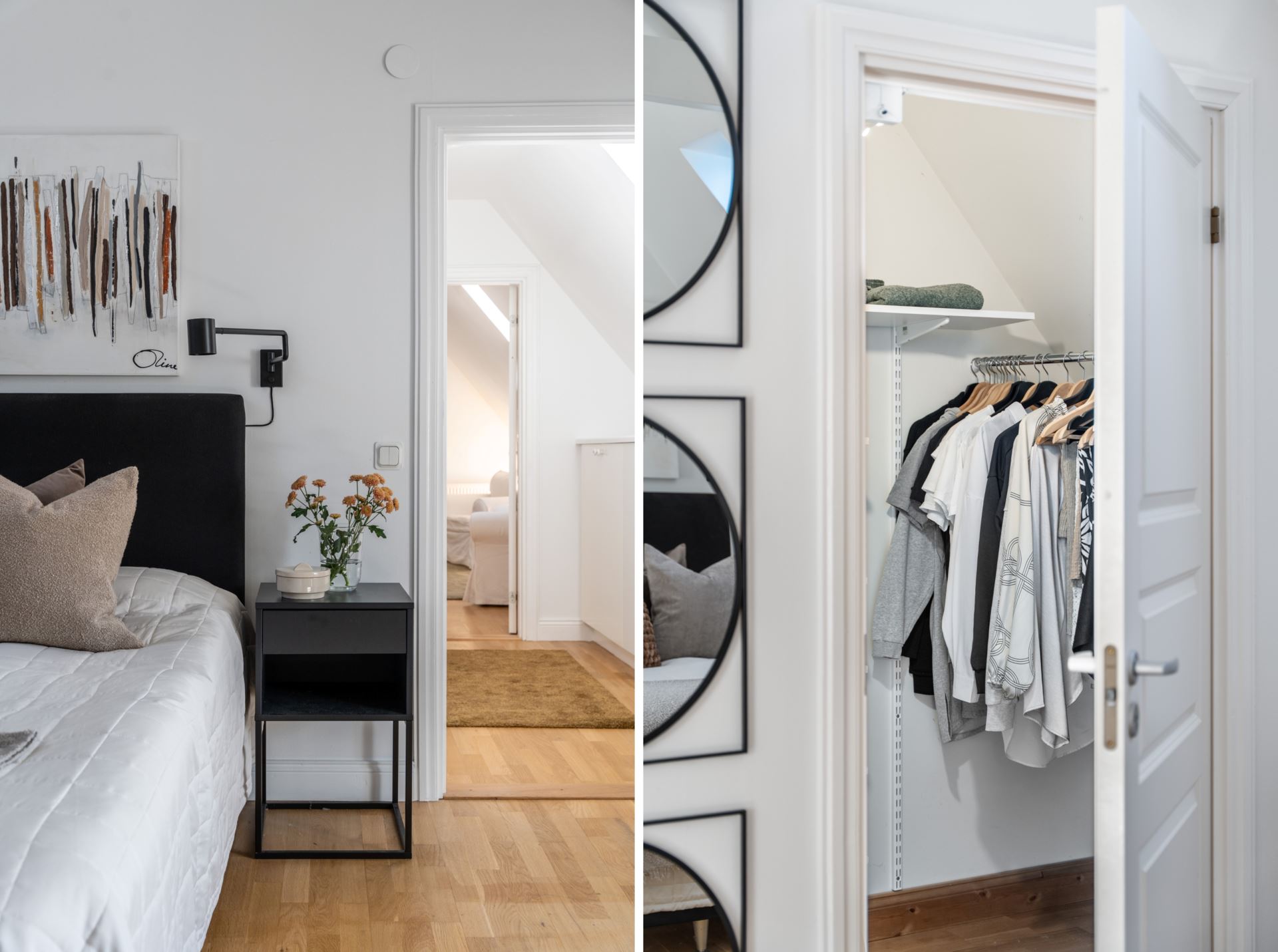 Från hall på ovanvåning når vi det första sovrummet, som bjuder på parkettgolv och vita väggar, samt vitmålade takbjälkr, och där ljuset strömmar in från fönster.