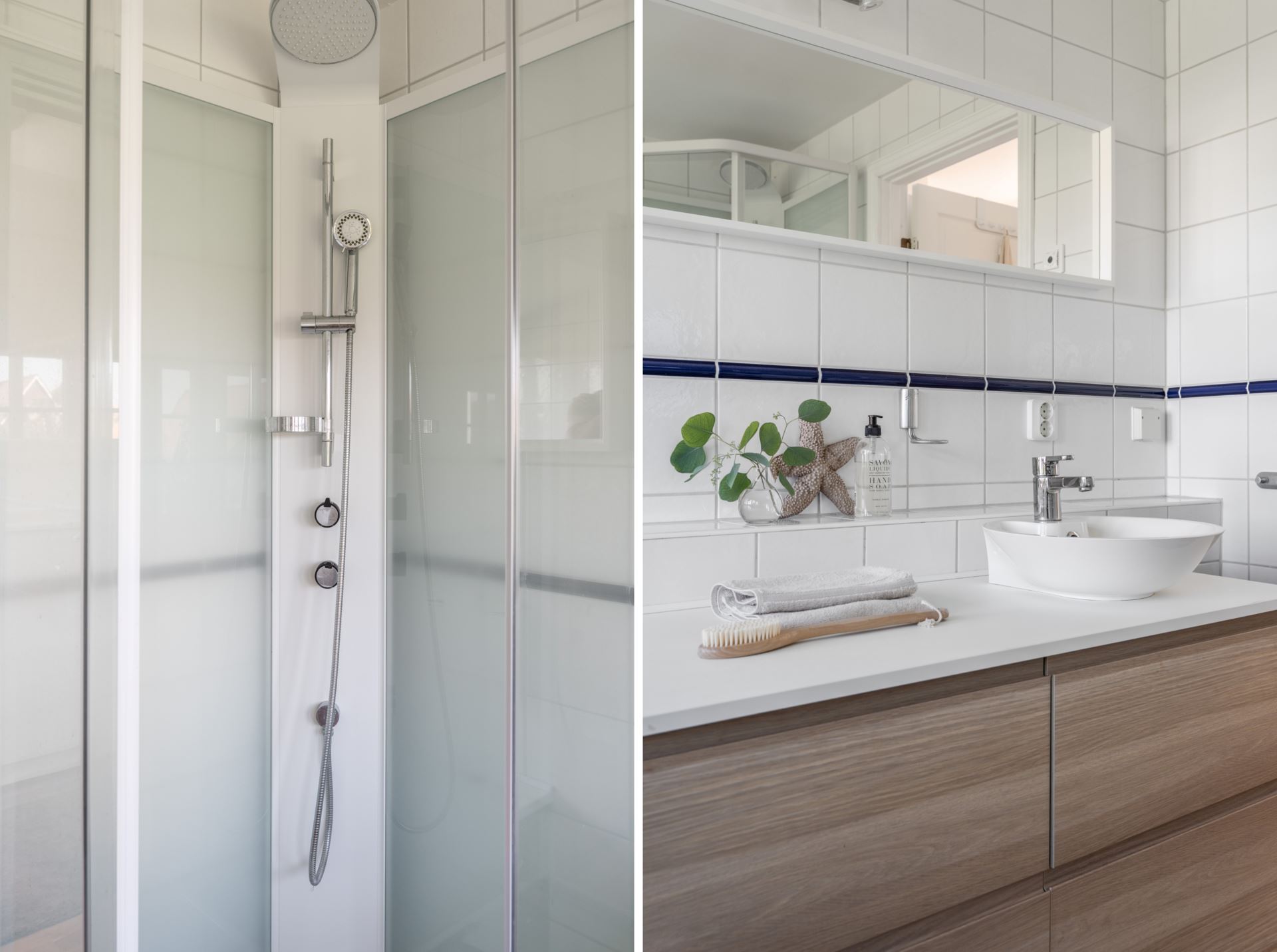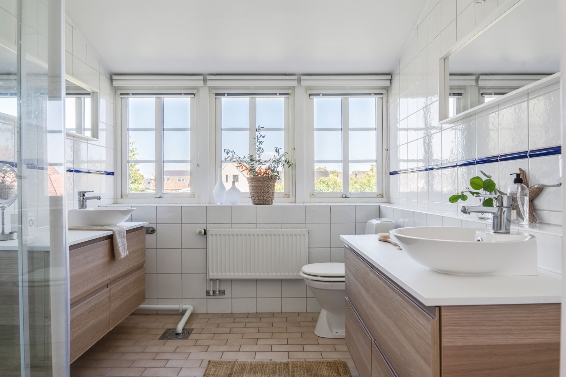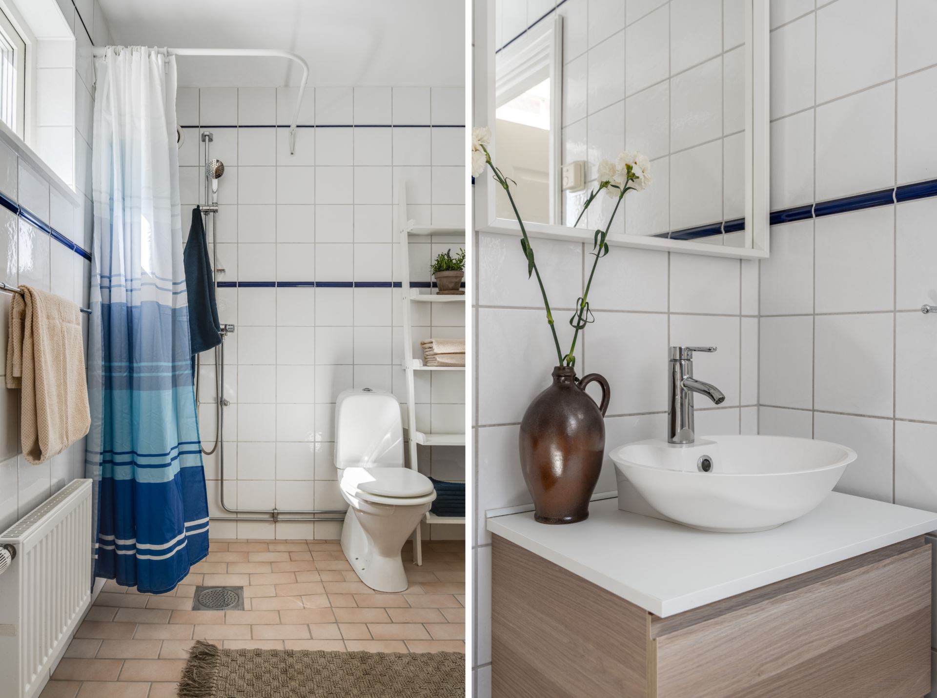 Centrerat på ovanvåningen är hemmets andra badrum beläget, i helkaklat utförande med ljusbrunt klinker på golv och vitt kakel, med mörkblå bård på väggarna. Badrummet är utrustat med wc, handfat med kommod i trä på två sidor och dusch bakom vikdörrar i glas. Fint ljusinsläpp från tre fönster.