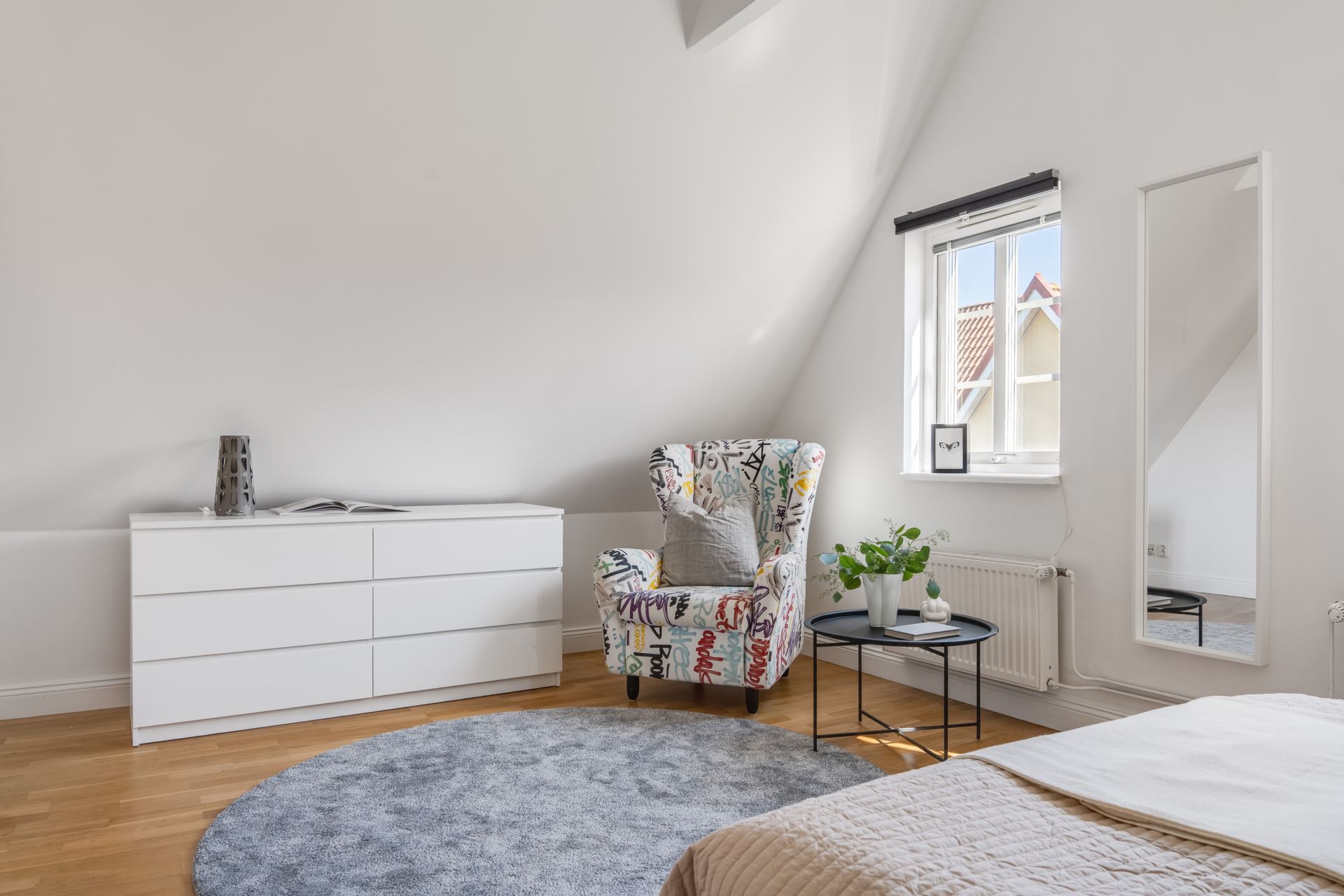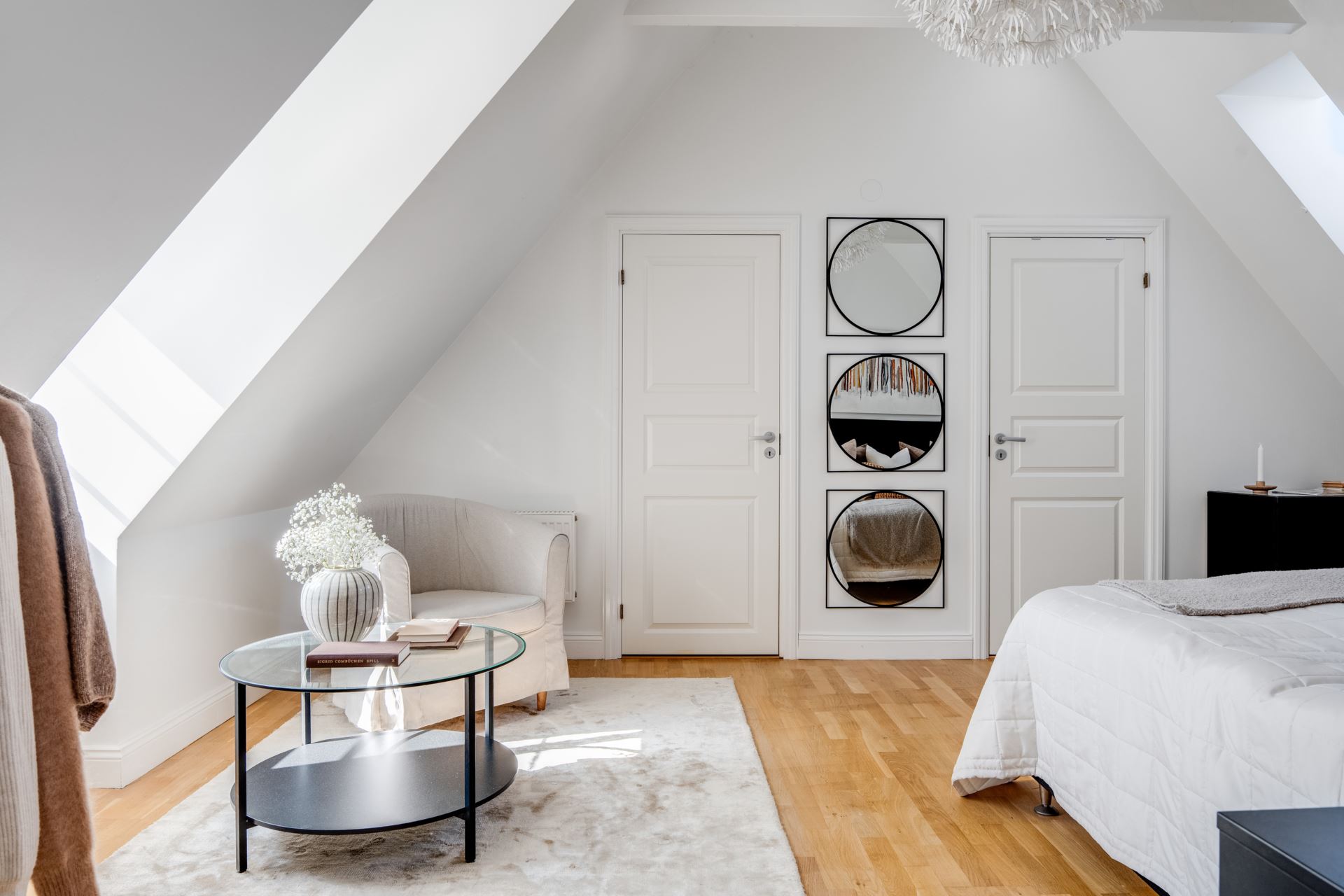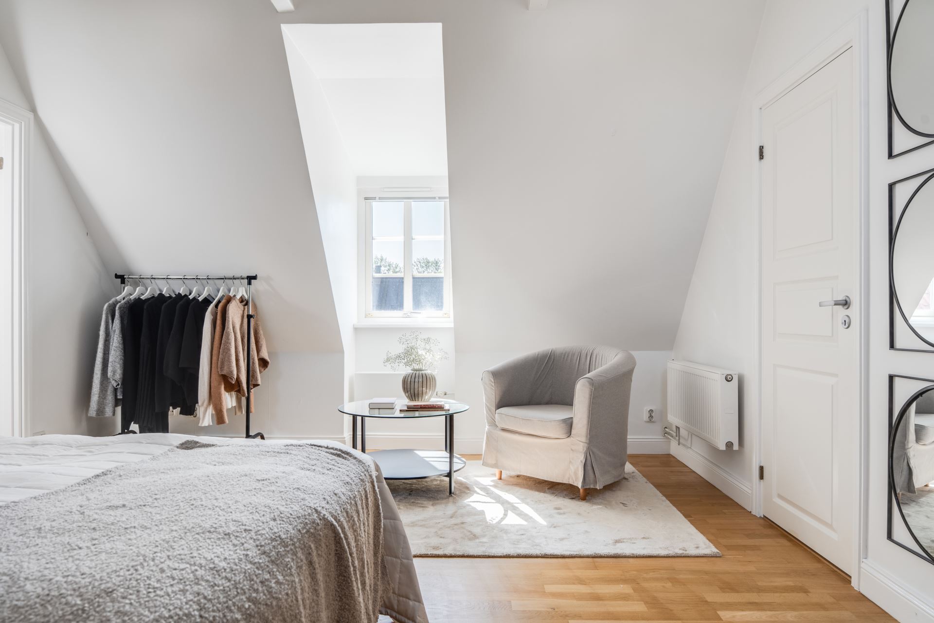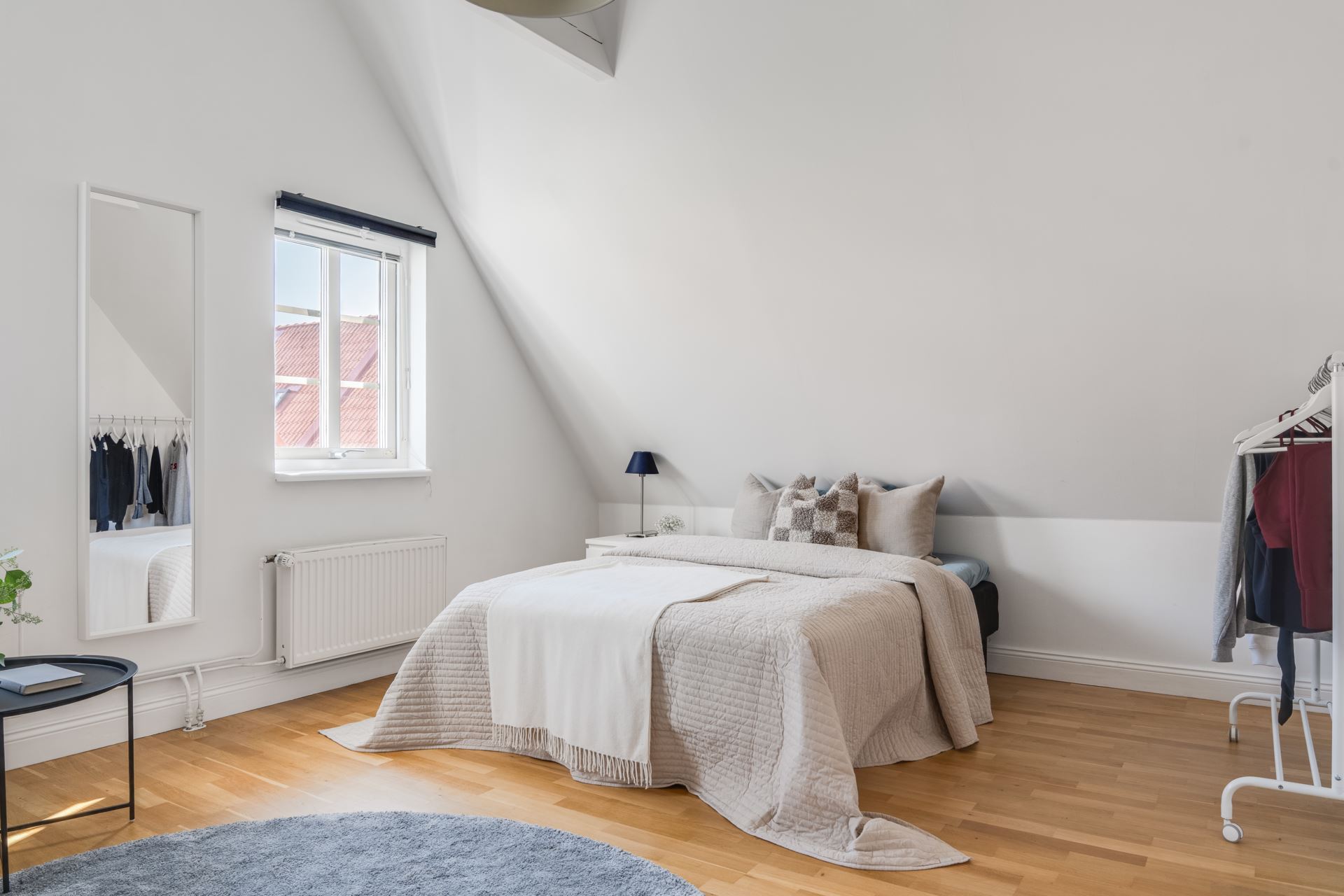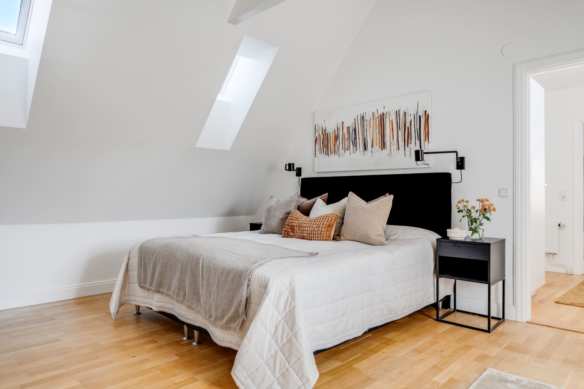 Trots snedtak ryms med enkelhet både säng, och tillhörande möbel eller förvaringsmöbel om man så önskar.